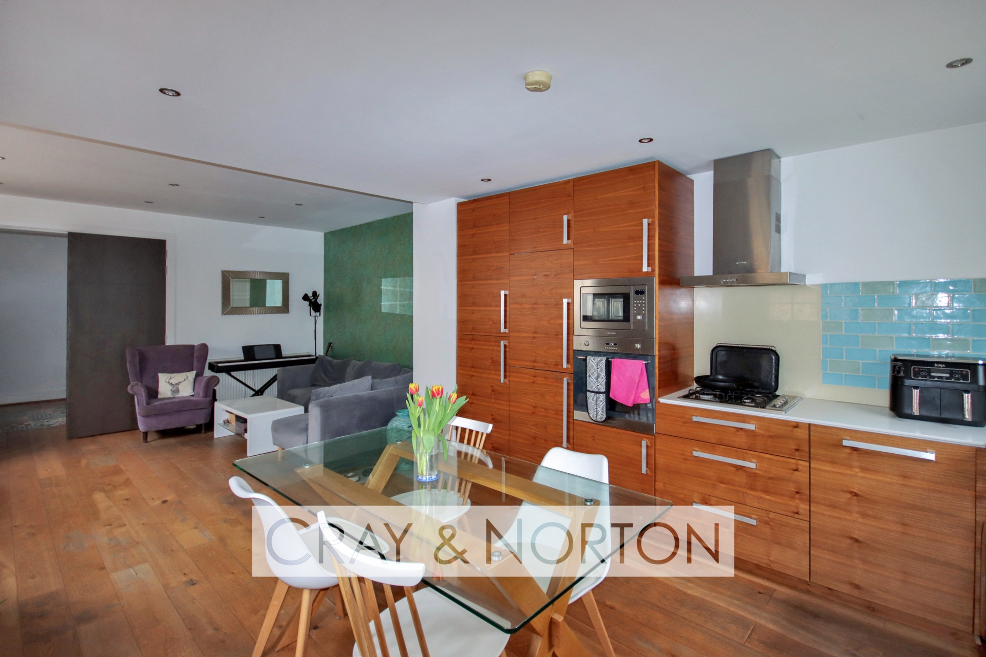 The spacious, open-plan kitchen / reception room is a real highlight, featuring sleek cabinetry and plentiful dining space - perfect for home cooked meals or entertaining friends and evening relaxation, while two generous double bedrooms create the ideal retreat for both rest and work. A stylish contemporary bathroom serves upstairs, with a convenient separate WC downstairs, complementing practical family living. The private garden area has rear access that leads out into the communal gardens.