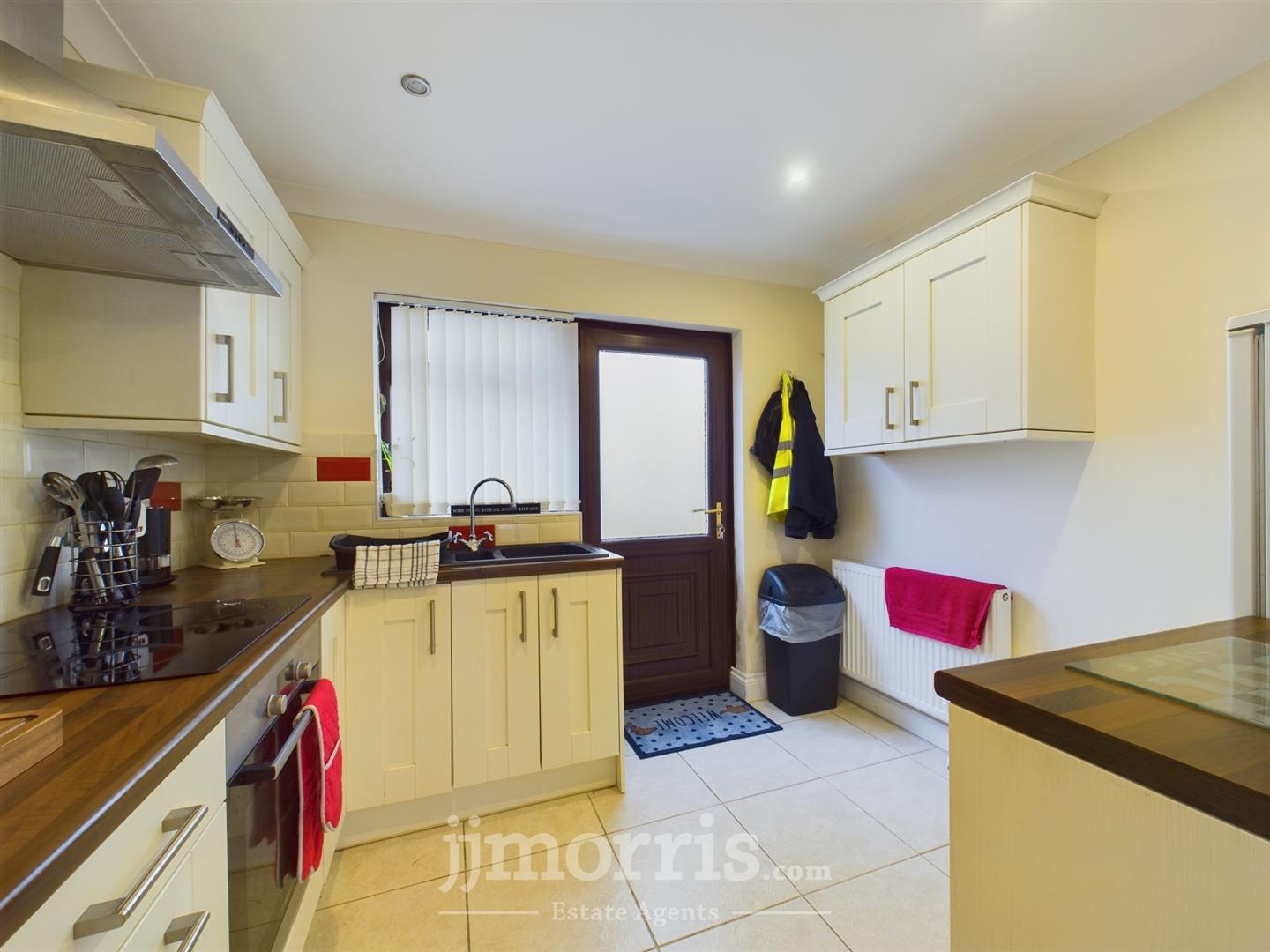 Kitchen - Having a range of wall and base units with complimentary work top surfaces, 1.5 bowl sink with mixer tap over, electric oven with counter top hob and extractor fan over, space for fridge/freezer, part tiled walls, tiled floor, coved ceiling, Upvc windows, spotlights, radiator.