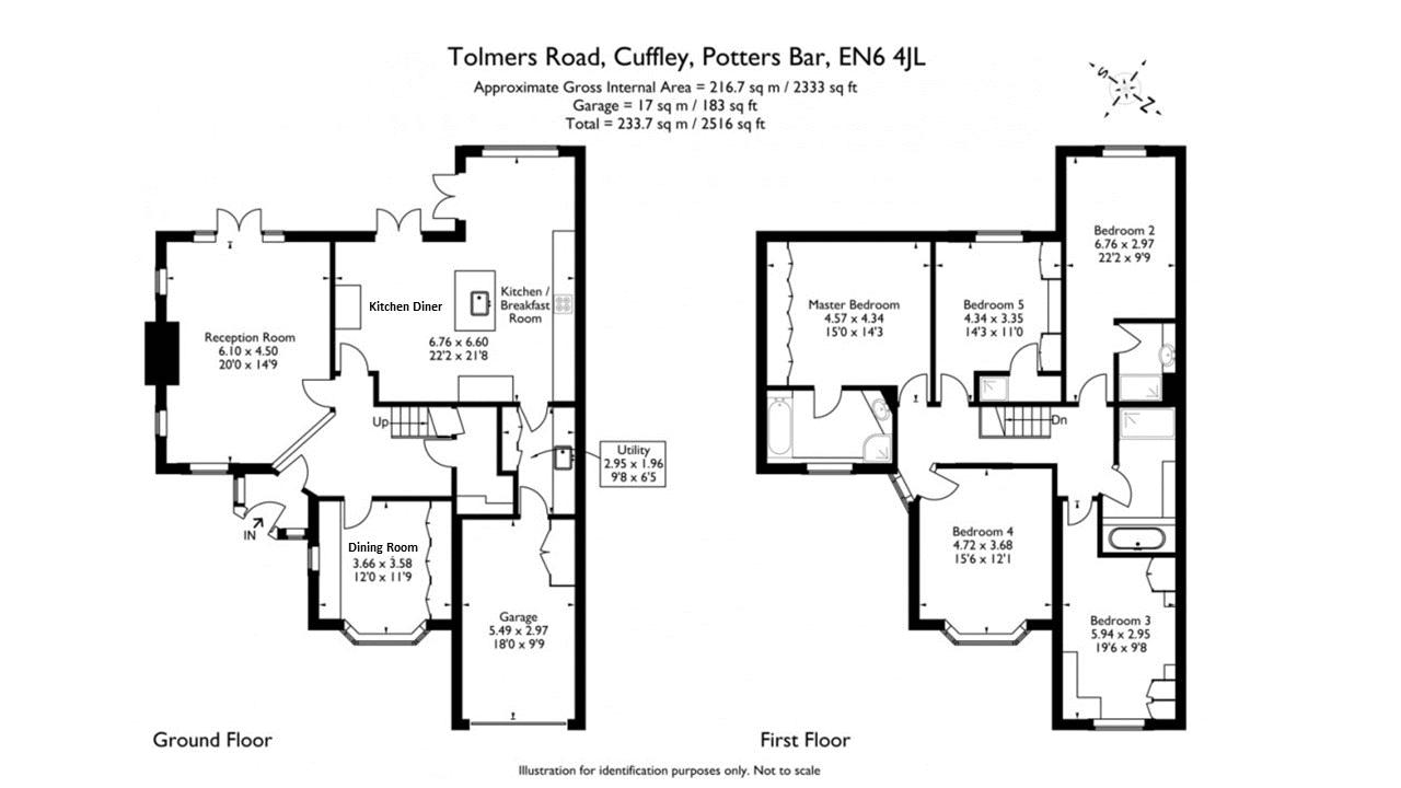 A beautifully presented 5 double bedroom home situated on the prestigious Tolmers Road. The property benefits from a large entrance hallway, kitchen breakfast room with air conditioning, triple aspect living room, dining room, downstairs cloakroom and a utility room which leads to the garage. Upstairs there are 5 double bedrooms, 3 of which have en-suites plus a well sized family bathroom. Externally, there is a large patio area perfect for entertaining, a sunbathing area with plunge pool with the rest of the garden being laid to lawn. The property also benefits from a deep frontage with plenty of parking as well as a garage.