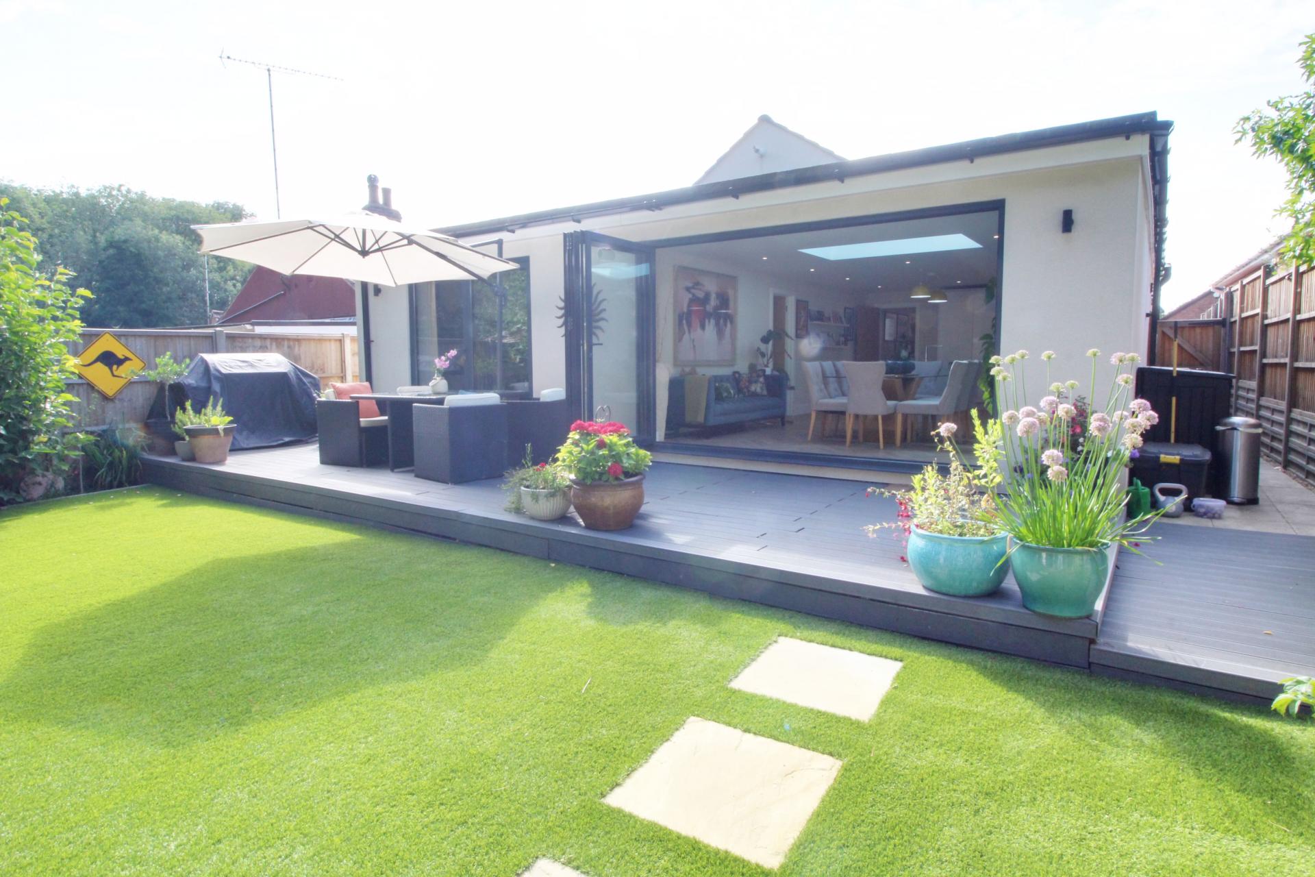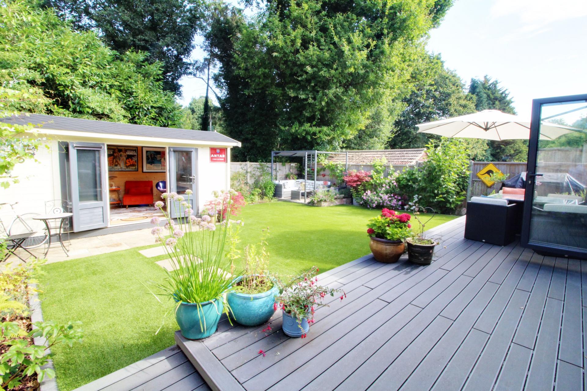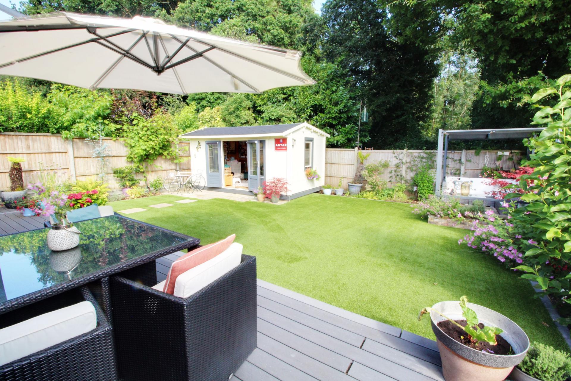 This beautifully presented three-bedroom detached bungalow is located on a tranquil residential street. The property is in outstanding decorative condition, reflecting a no-expense-spared approach. The accommodation includes an entrance hallway, an open-plan kitchen/dining room with bi-folding doors leading to a stunning rear garden, a living room, a master bedroom with an en-suite shower room, two additional bedrooms, and a family bathroom. Outside, there is an attractive terrace with steps descending to a gorgeous garden featuring an extra seating area and an outbuilding that serves as a home office, backing onto woodland.