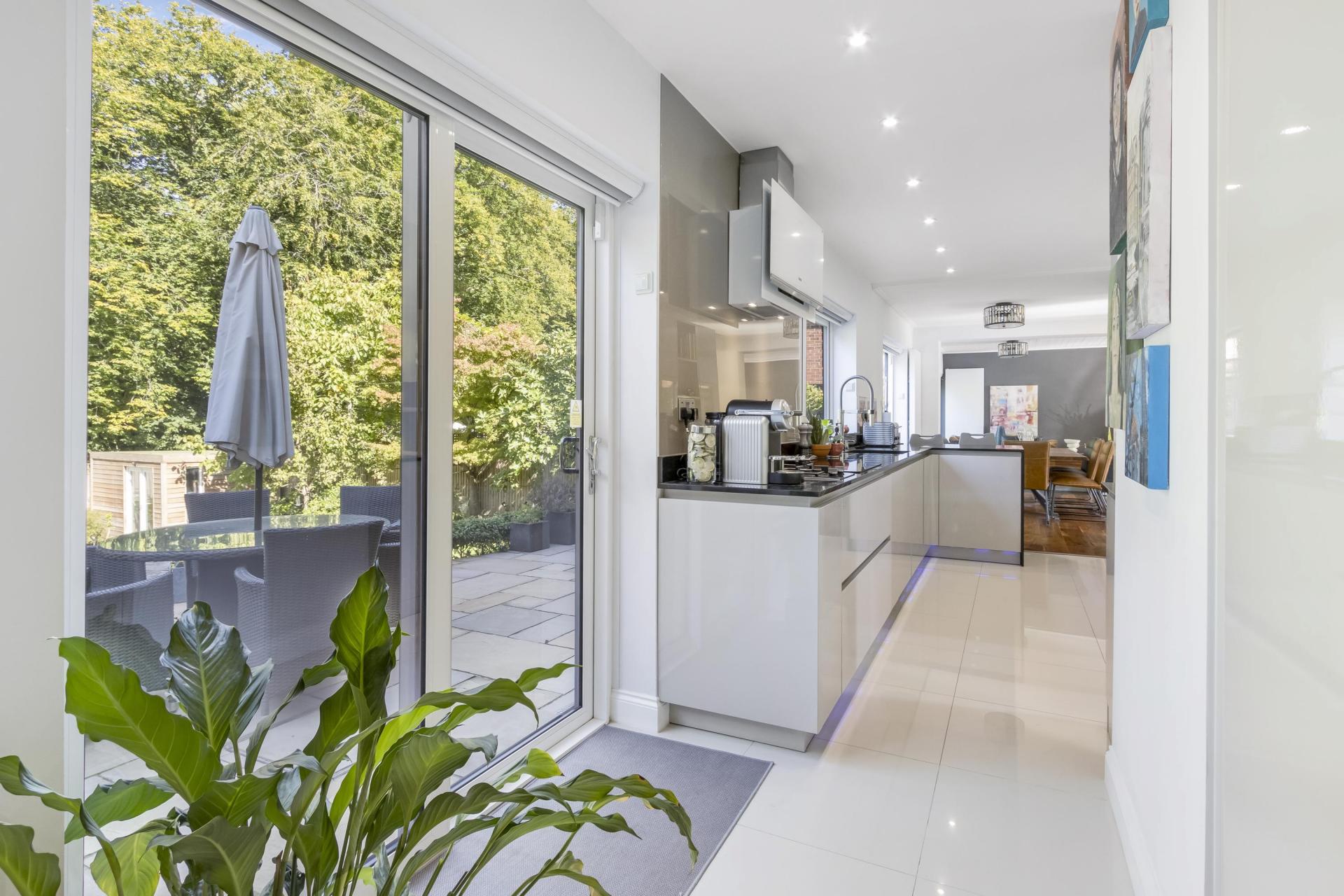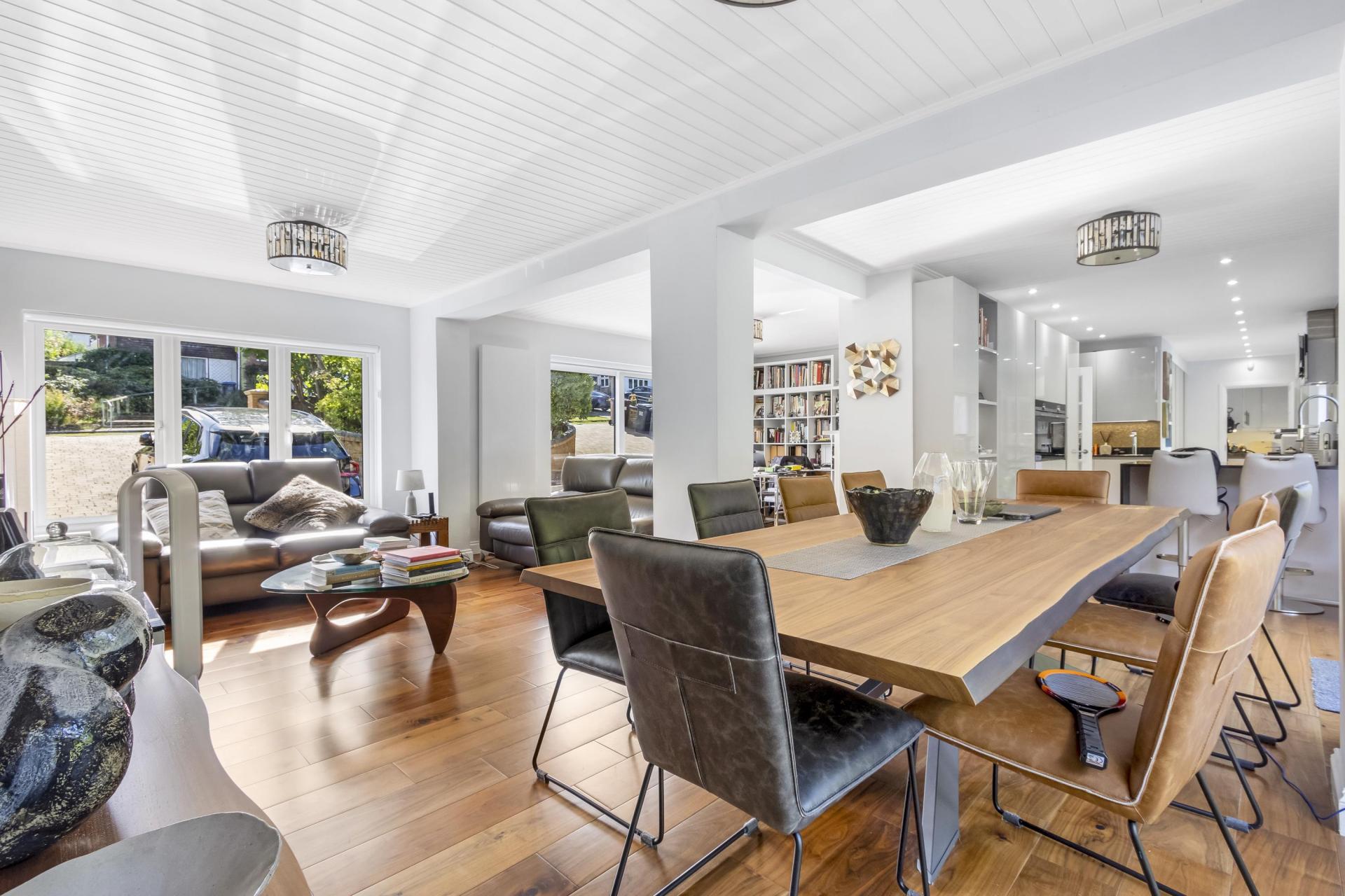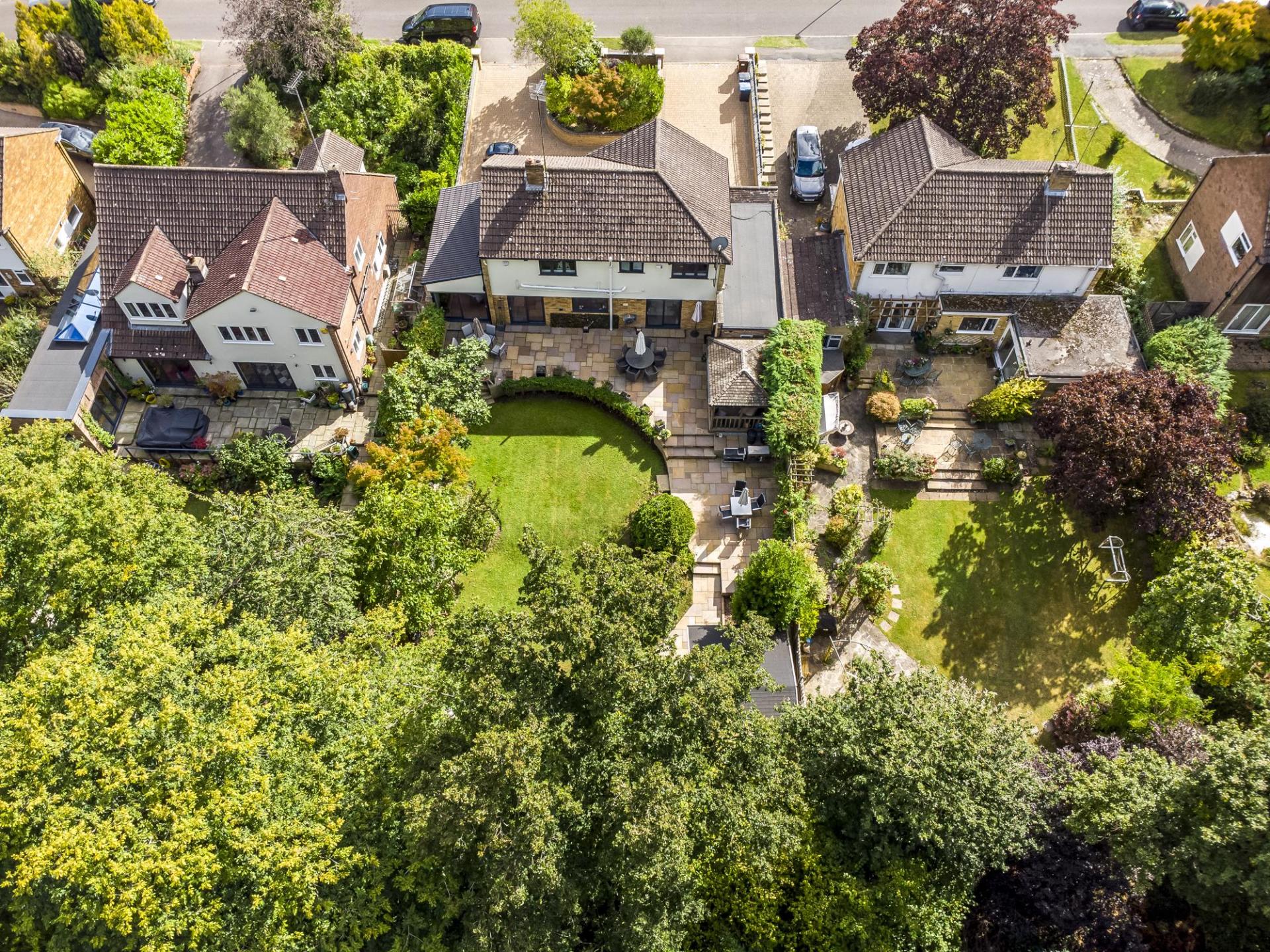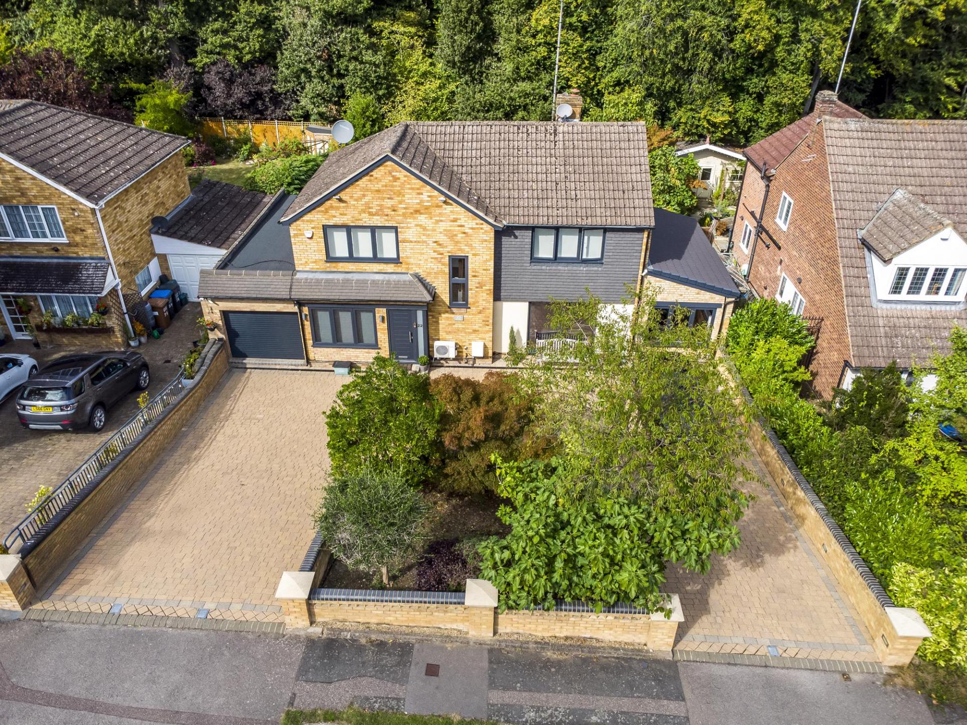 A beautifully presented 4 bedroom open plan home which has been modernised and maintained to an exemplary standard throughout. The wonderful home sits in a unique position backing directly onto woods with its own access. There are several high end features including a gym and professionally installed high end home cinema with a multiple speaker and subwoofer system and laser projection all programmed and controlled via an iPad Pro. The ground floor has automated Silent glass motorised blinds and Rako lighting system, there is a bespoke German kitchen made by Schüller which offers both a gas and induction hob, also it offers a large utility room which also doubles up as a chef's kitchen. The property has Walnut floors throughout, with a thick pile carpet in the cinema room which can also be used as bedroom 5. Both the garden and front drive also have an automated lighting system whereby the lighting comes on at dusk and can be programmed to go off at the time of choice. A large carriage driveway with parking for several cars.