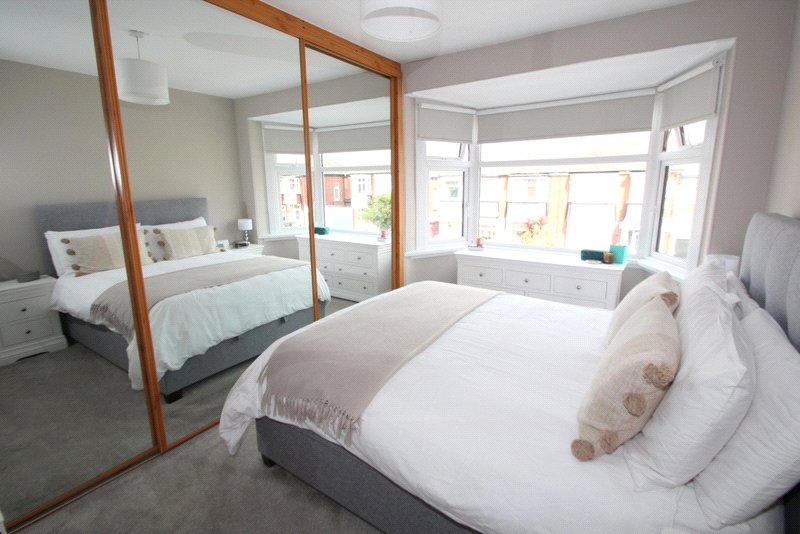 Bedroom Two 14'10" x 9' min (4.52m x 2.74m min). Full range of built in fitted wardrobes with floor to ceiling mirror sliding doors, large double glazed bay window with fitted roller blind, radiator.
