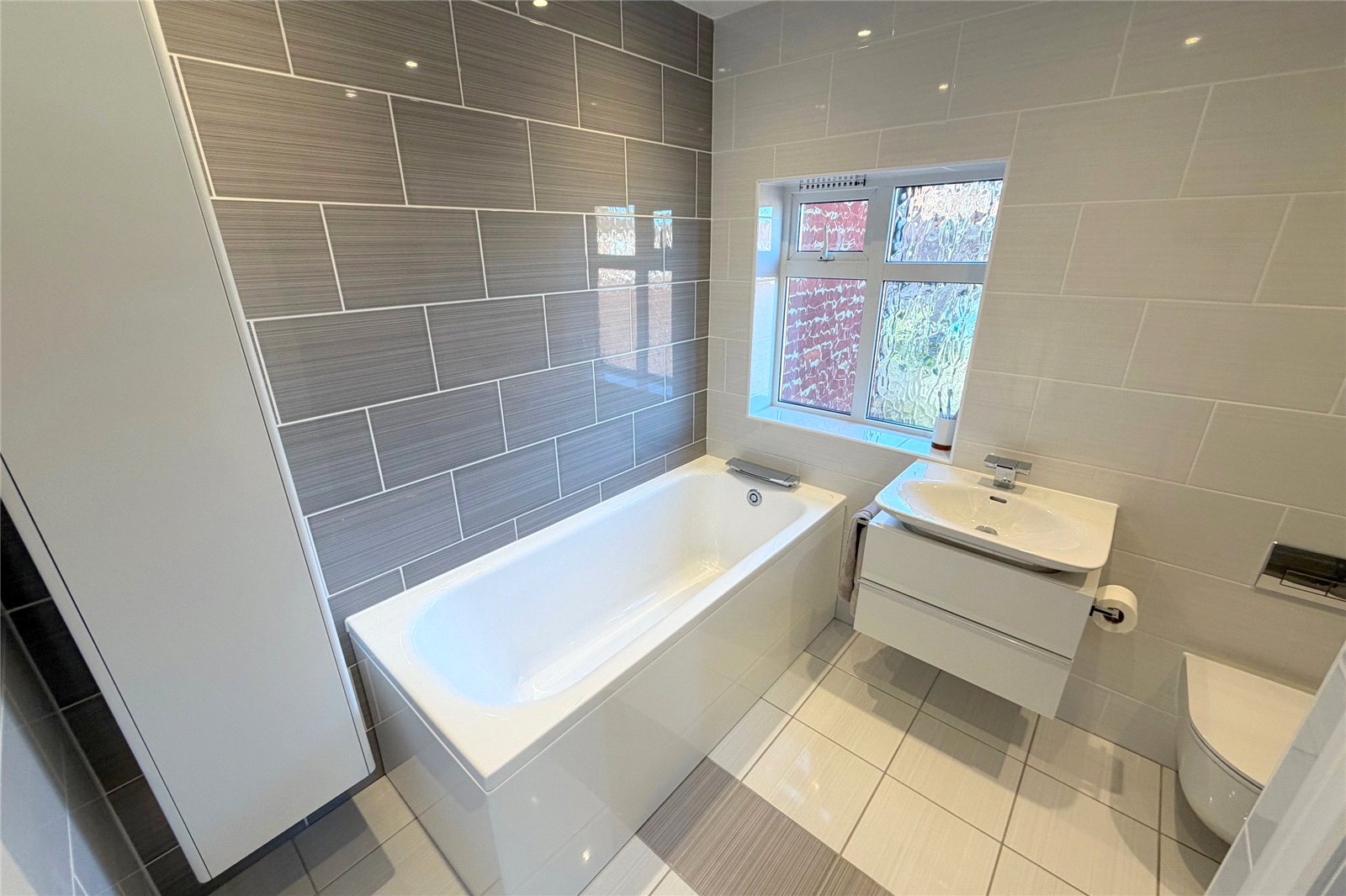 Bathroom/WC 8' x 7'3" (2.44m x 2.2m). A superb modern bathroom fitted with a white suite comprising; panelled bath, low level WC and wash basin. Tiled walls and tiled floor. Heated towel rail. Double glazed frosted window to the side.