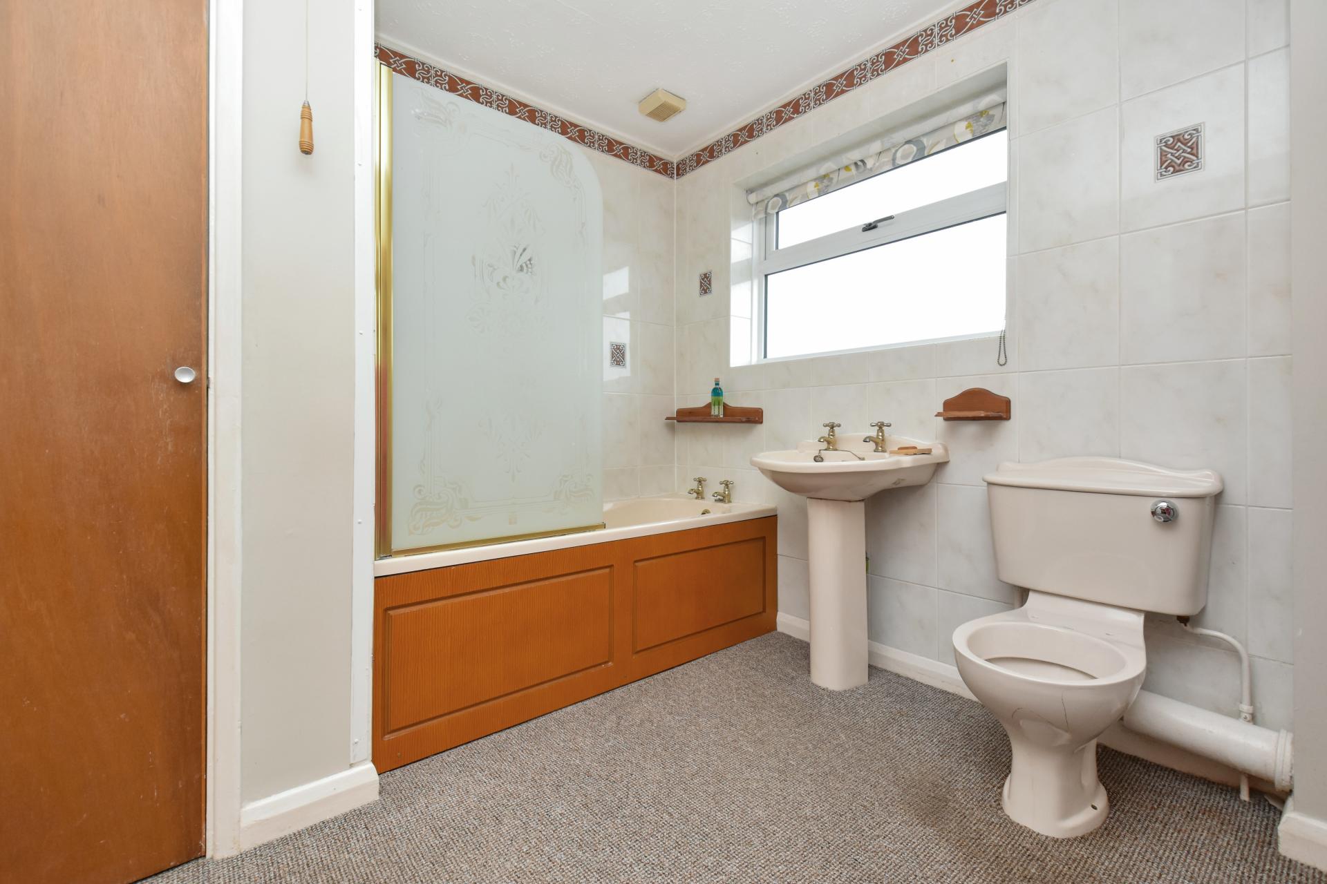Bathroom fitted in coloured suite comprising close coupled W.C., pedestal basin, panelled bath with electric shower over, glass shower screen, part tiled walls, radiator, airing cupboard housing hot water tank and slatted shelving.