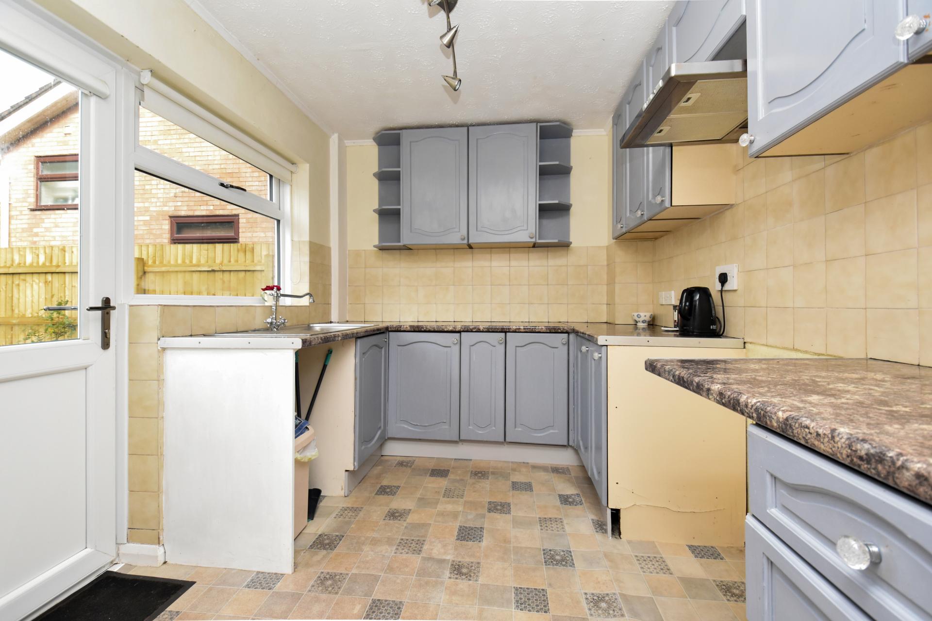 Kitchen with a range of both wall and base mounted units, laminate worktop, inset stainless steel single drainer sink, space for freestanding cooker, space and plumbing for washing machine, door to rear garden, radiator.