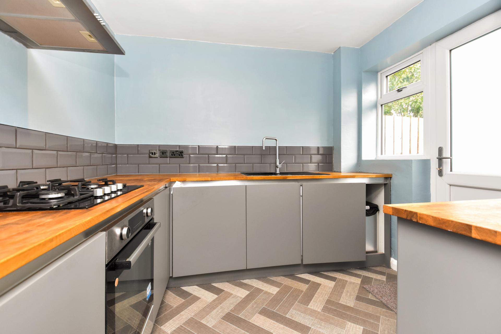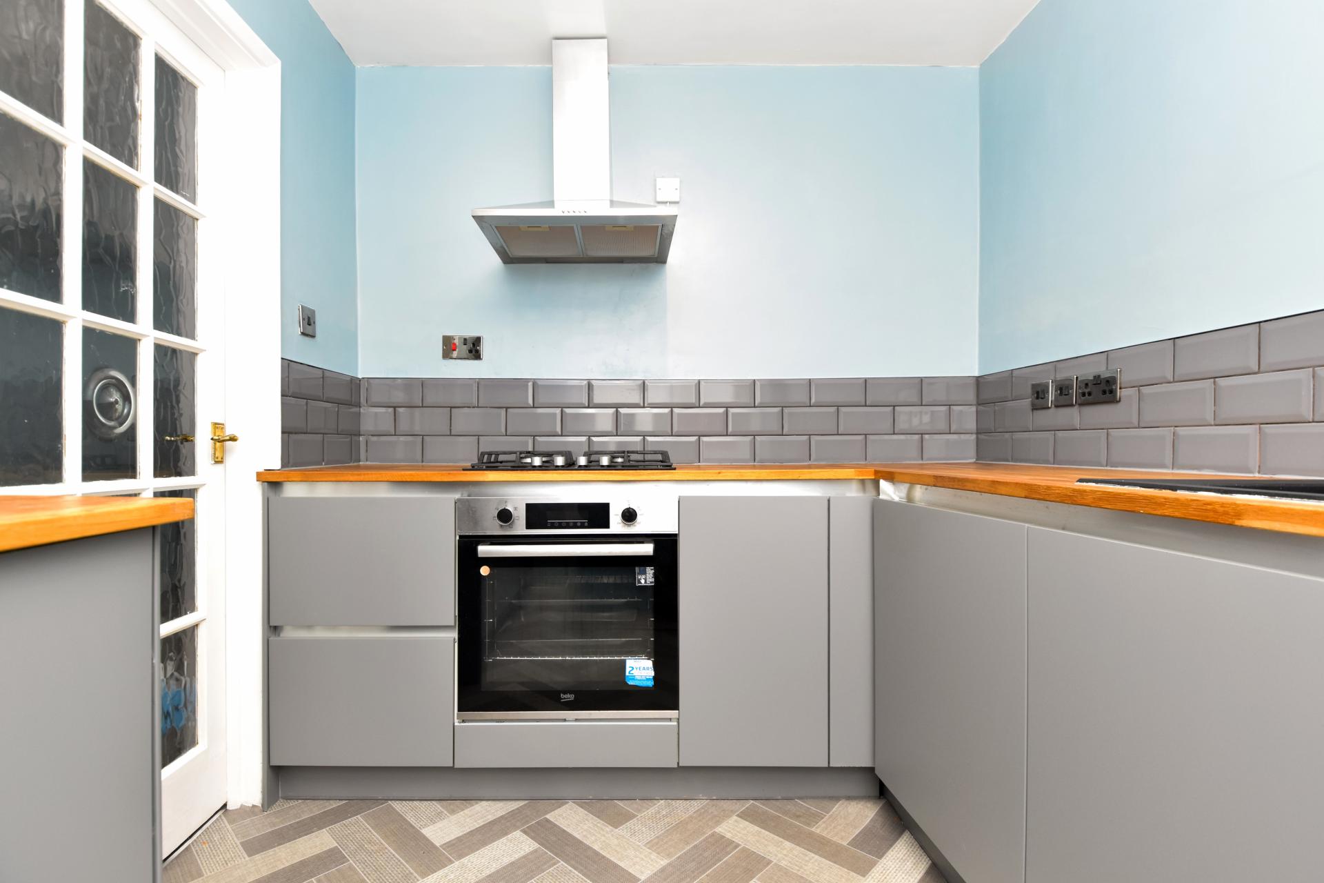 Kitchen fitted in a stylish modern range of base mounted cupboards with integrated fridge, integrated washing machine, one wall mounted cupboard housing gas fired boiler, timber worktop with inset single drainer sink, mixer tap, inset four ring gas hob with extractor over and oven beneath, door to rear garden.