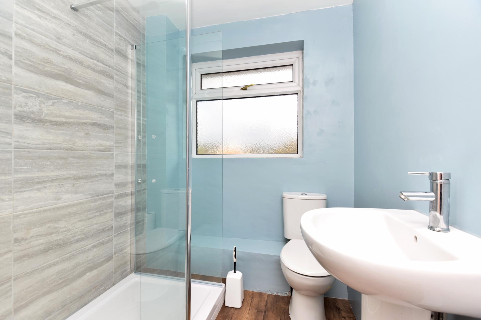 Shower Room recently refitted with close coupled W.C., pedestal basin, large shower tray with glass surround, electric shower, part tiled walls, obscure glass window.