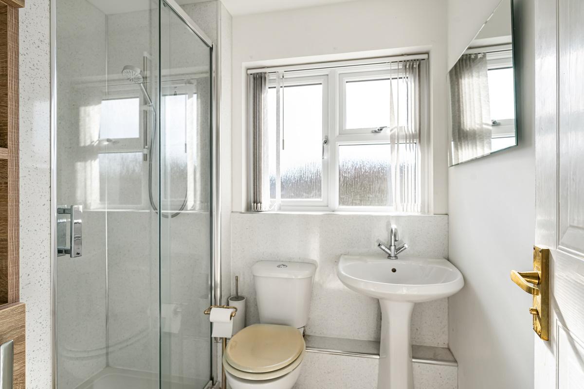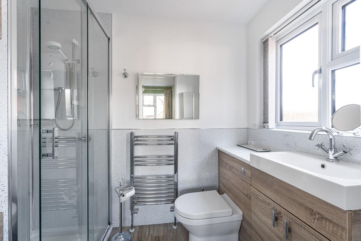 En-Suite having been stylishly re-fitted in a contemporary style with W.C. with concealed cistern, basin with storage beneath, large shower cubicle with glass sliding shower door, electric shower, aqua panel walls, further storage cabinetry and shelving, shaver point, obscure glass window, extractor fan.