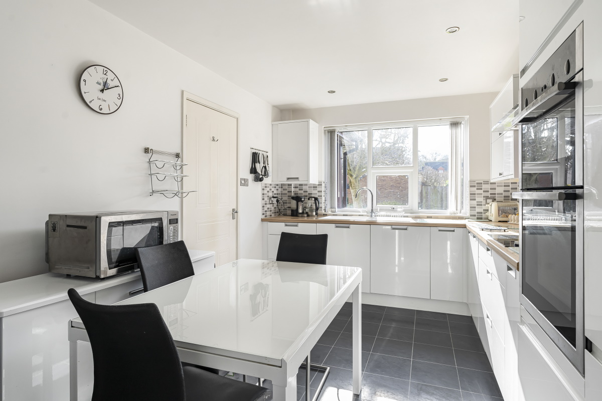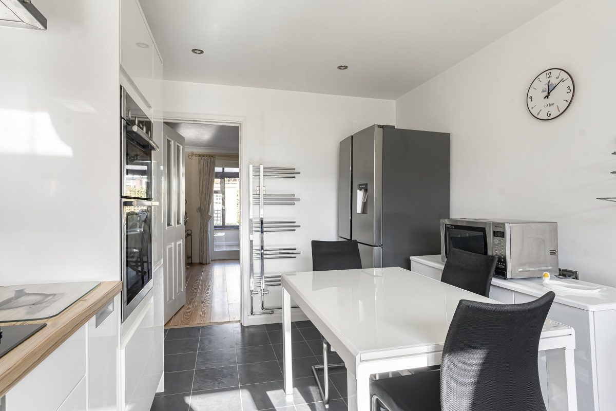 Kitchen/Breakfast Room fitted in a stylish range of high gloss white units comprising both wall and base mounted cupboards, timber effect laminate worktop with inset single drainer sink, mixer tap, inset Neff four ring electric hob with extractor over, tall housing with Neff oven and grill, integrated dishwasher, large pan drawers, space for breakfasting table, radiator, pedestrian door to side access.