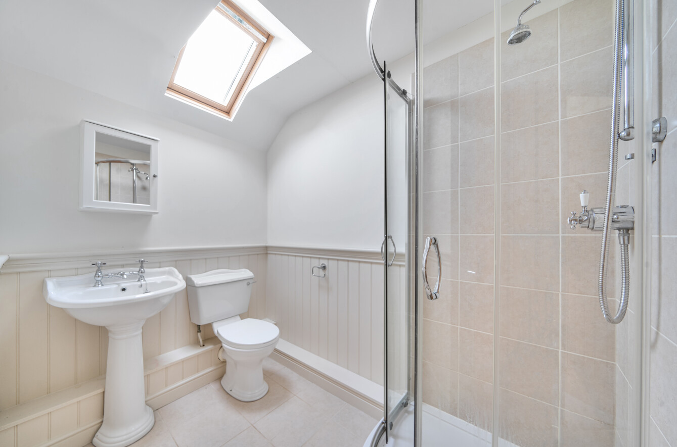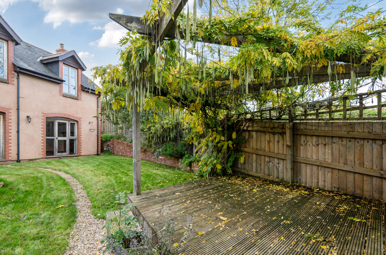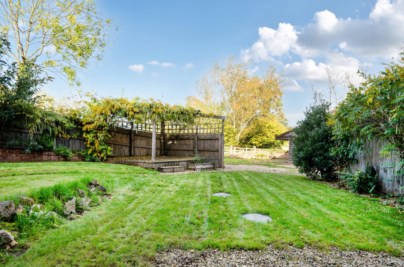 Outside, the rear garden is perfect for entertaining, with a mix of lawn, gravel, and a pergola covered decking area for al fresco dining. The property is approached via a shared driveway leading to ample parking and a timber framed garage.