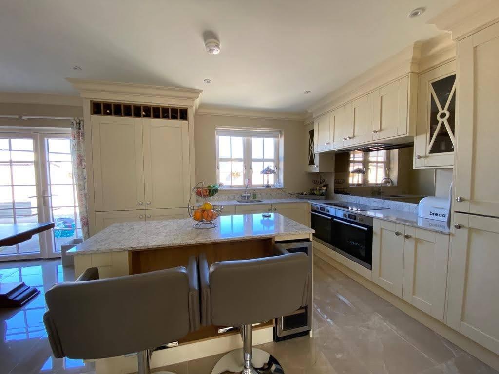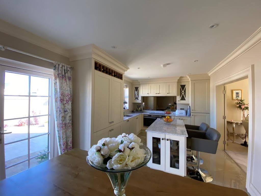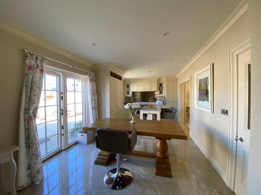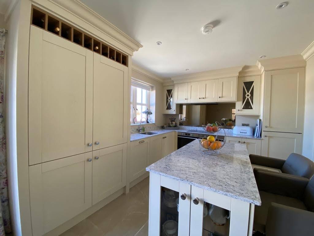 7.32m x 3.23m (24' x 10'7") - Having excellent range of eye and low level units, glazed display cupboards, 'Hotpoint' hob, 'Hotpoint' twin ovens, extractor hood, integrated fridge / freezer and dishwasher, sink set in 'Quartz' worktop with 'Frankie' boiling water tap, wine rack, larder cupboard, centre island with storage under, mirror feature splash back, ample dining space with French doors leading to rear, ceiling cornicing, recessed lighting, tiled floor.
