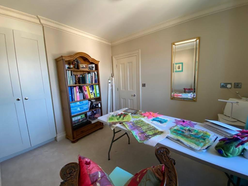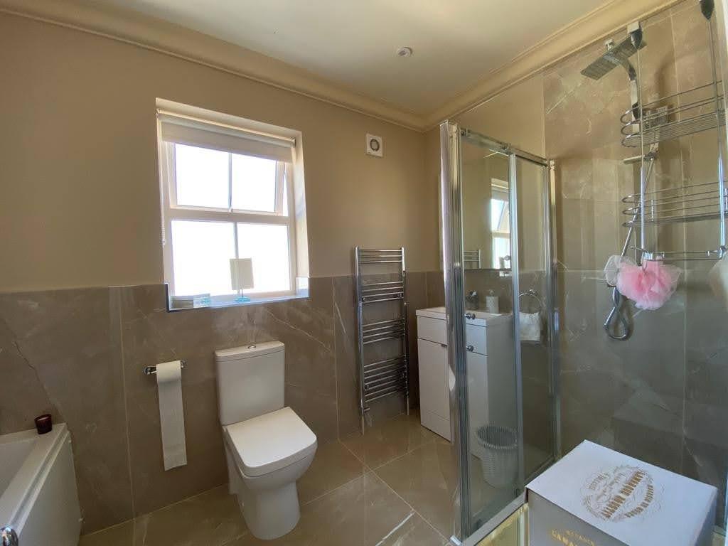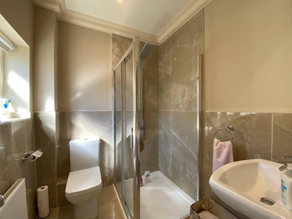 Comprising bath, fully tiled walk in power shower, whb set in vanity unit, wc, chrome radiator, 1/2 tiled walls, tiled floor.