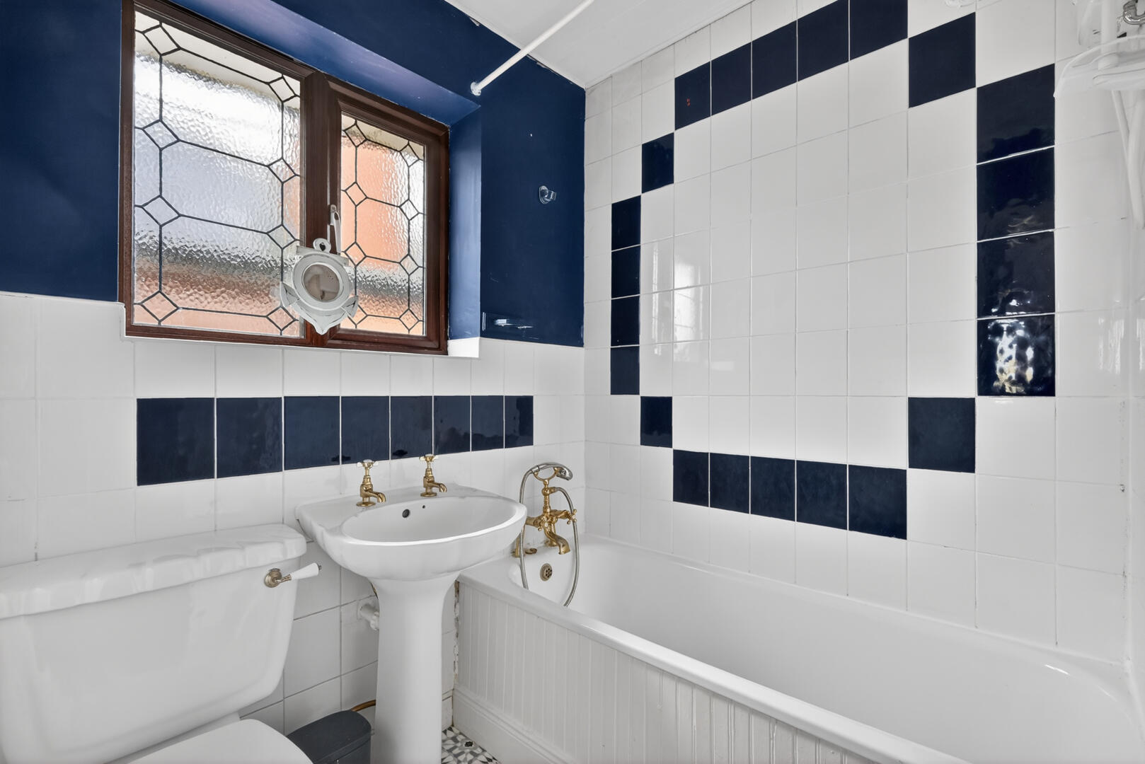 Bathroom: - () - With laminate tile effect floor, partially tiled walls, partially timber panelled, white suite comprising of low flush WC, scallop detail, pedestal wash hand basin with scallop detail, hot and cold Westminster taps, timber panelled bath with mixer taps and telephone handle attachment, electric Redring Plus Extra shower with telephone handle.