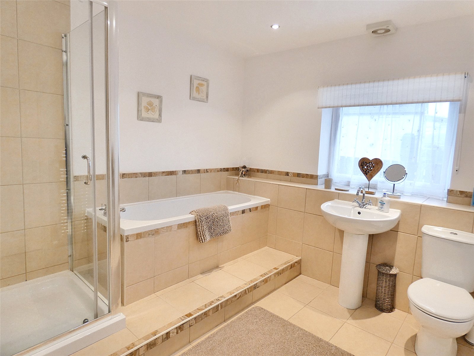 Bathroom Roomy bathroom with tiled floor. Spotlights. WC. Basin. Bath. Separate shower cubicle with fully tiled walls and Titan electric shower. Heated towel rail. Window to rear of property.