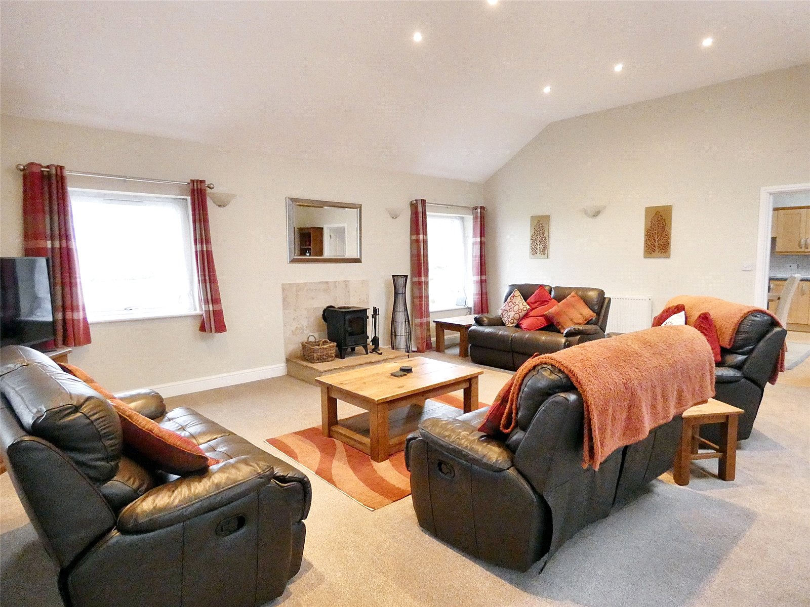 Living Room Good sized entertaining space. Fitted carpet. Spotlights. TV, telephone & internet points. Stone hearth housing multi fuel stove with tiled wall behind. Radiator. Three large windows over two aspects with stunning views across the valley.