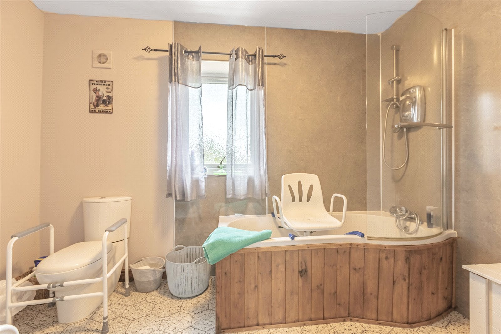 House Bathroom Vinyl floor. Part tiled walls. WC, basin and bath with electric shower over. Radiator. Frosted window.