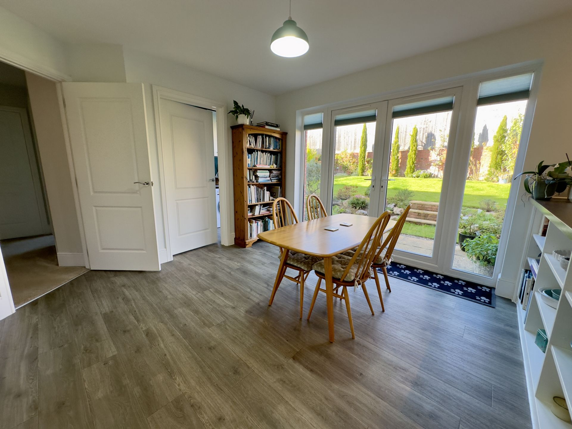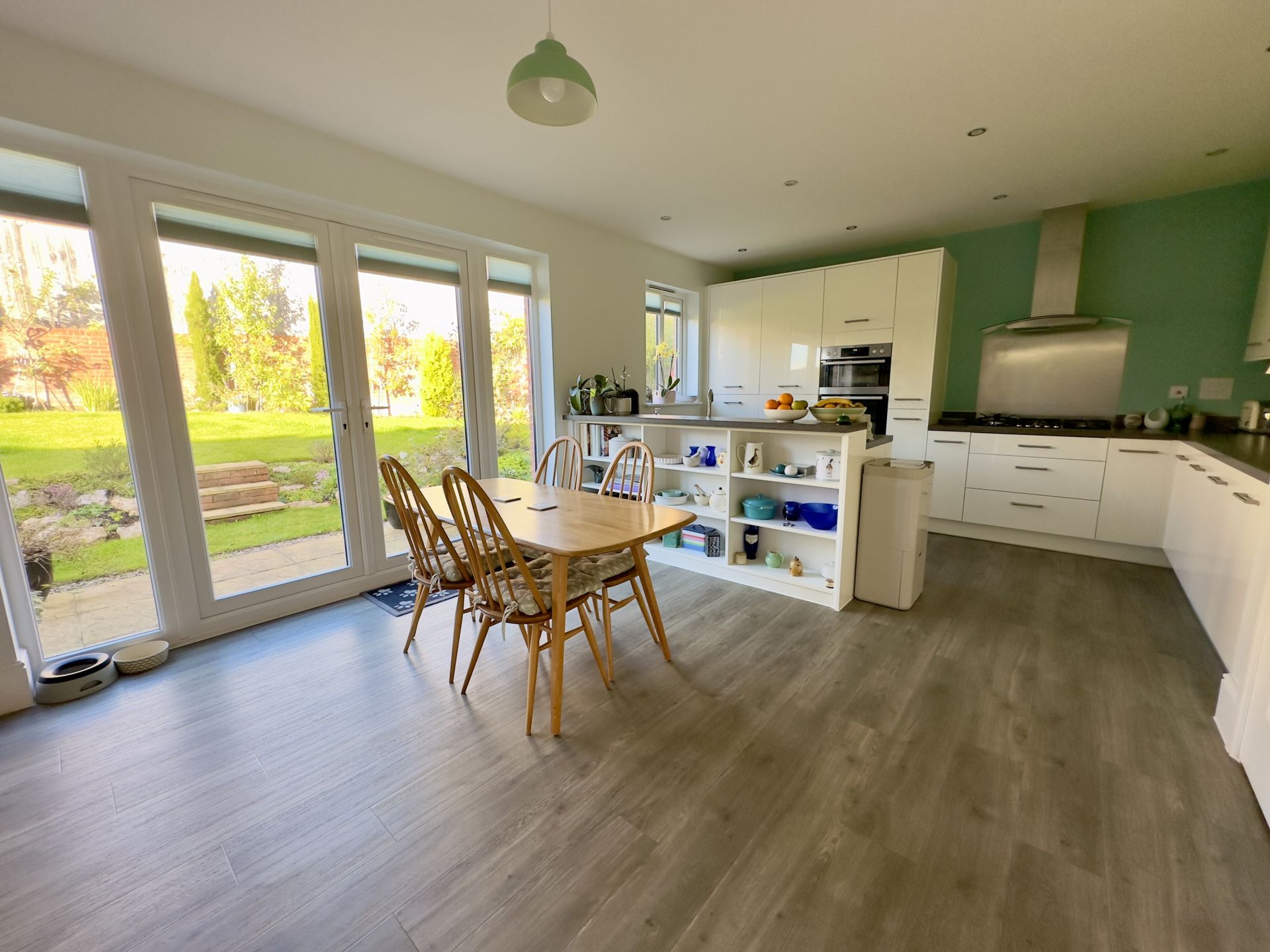KITCHEN/DINING ROOM: 6.03m x 4.23m (19'9" x 13'11"), A fantastic area to entertain with uPVC double glazed windows and doors opening out to the rear garden, radiator, under stairs storage cupboard and ample space for a dining room table to one end. Contemporary kitchen with a selection of base and eye level units with work surfaces over Stainless-steel double sink and drainer. Integrated appliances include 5 Ring gas hob with extractor over, eye level double over, double fridge/ freezer and dishwasher. uPVC double glazed window overlooking the rear garden and downlighters complete the kitchen.