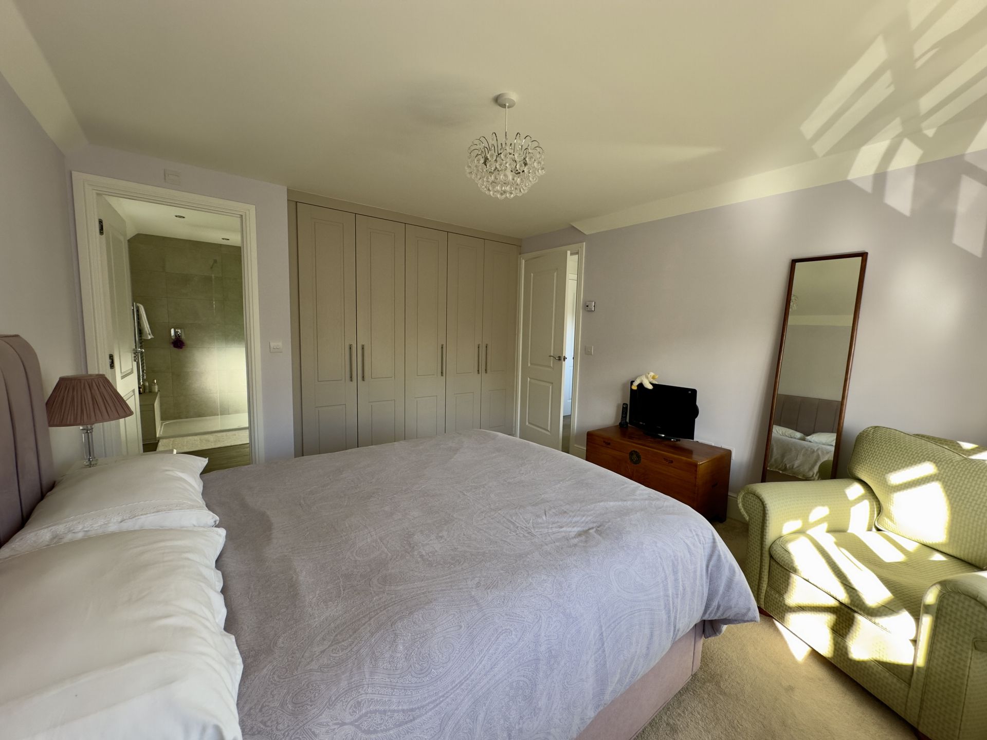 EN - SUITE SHOWER ROOM: A modern walk-in double enclosure with thermostatic controlled rainfall showers over, glass screen and tiled surround. Close coupled WC, wash hand basin with mixer tap, heated towel rail and shaver point. Extractor and uPVC obscure double-glazed window to the side aspect.