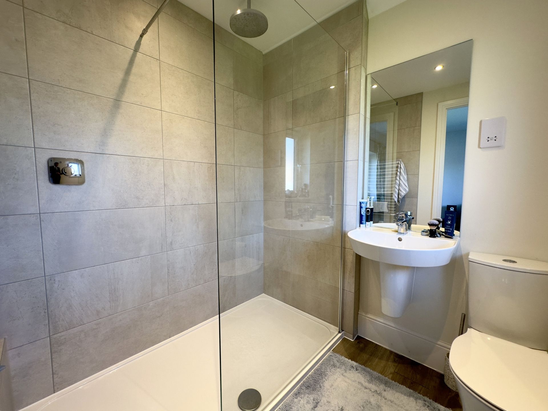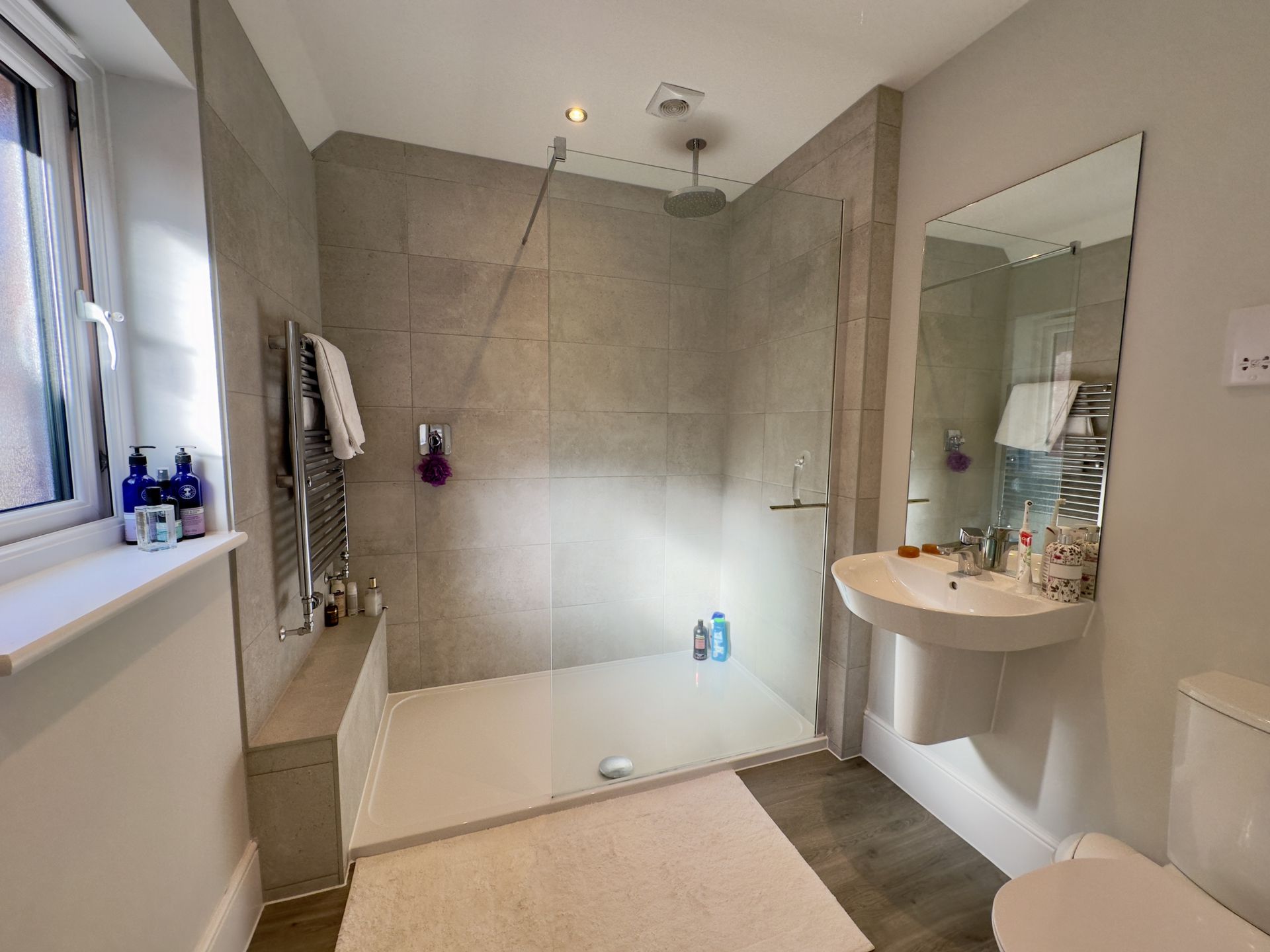 EN -SUITE SHOWER ROOM: Walk in double enclosure with thermostatic controlled rainfall shower over, glass screen and tiled walls. Close coupled WC, wash hand basin with mixer tap. Heated towel rail, extractor and uPVC obscure double glazed window to the side aspect.
