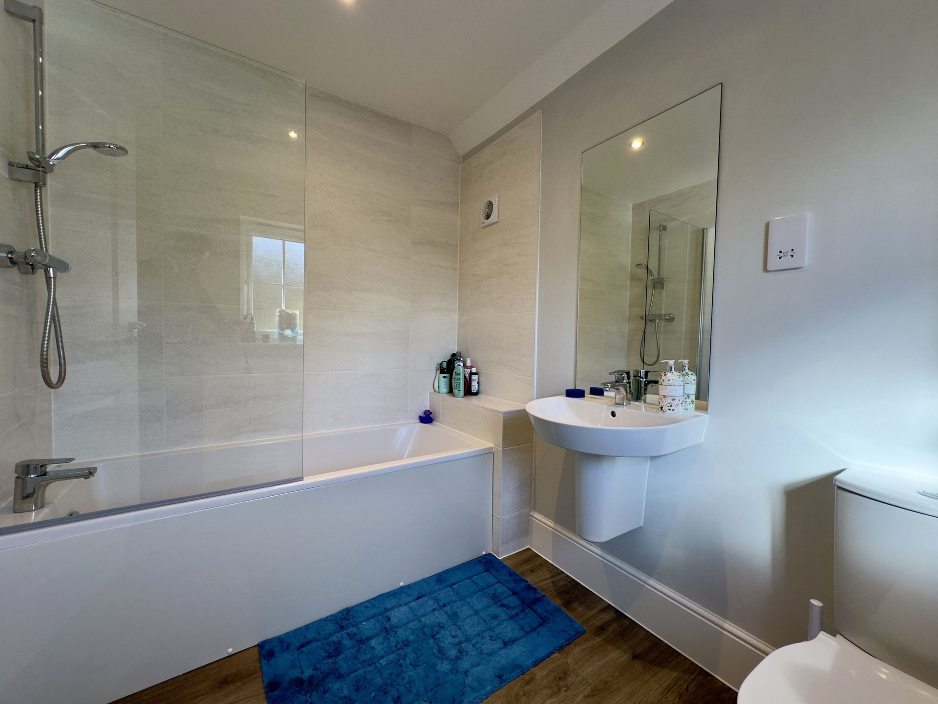 FAMILY BATHROOM: A white contemporary suite comprising panelled bath with shower over, glass screen, tiled surround and wash hand basin. Close coupled WC, shaver point, heated towel rail and uPVC obscure double glazed window to the front aspect.