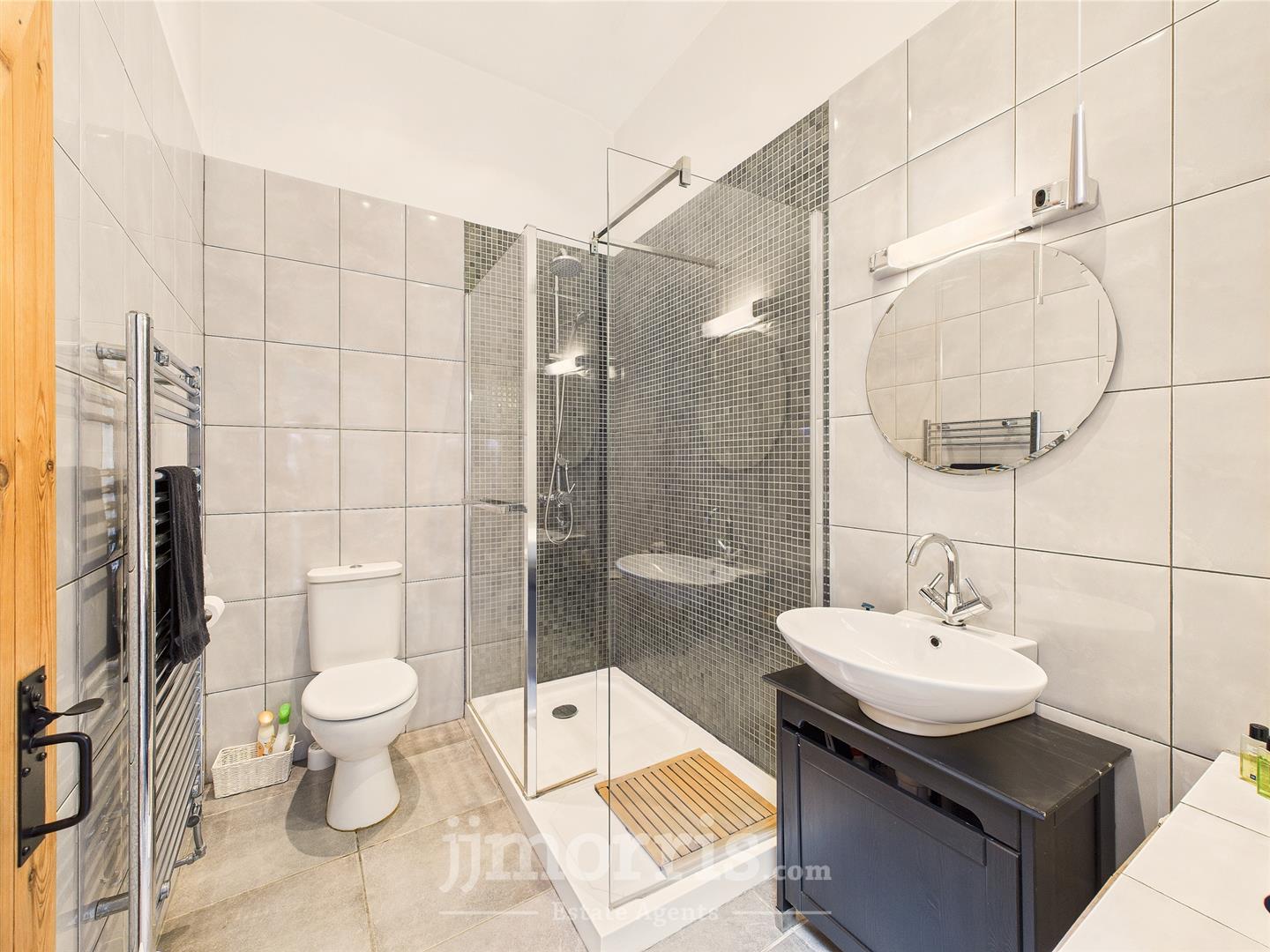 Bathroom - Features a jacuzzi bath with overhead shower, vanity unit with wash basin, WC, partial tiling on walls and tiled floor, heated towel rail, frosted rear window, and loft access.