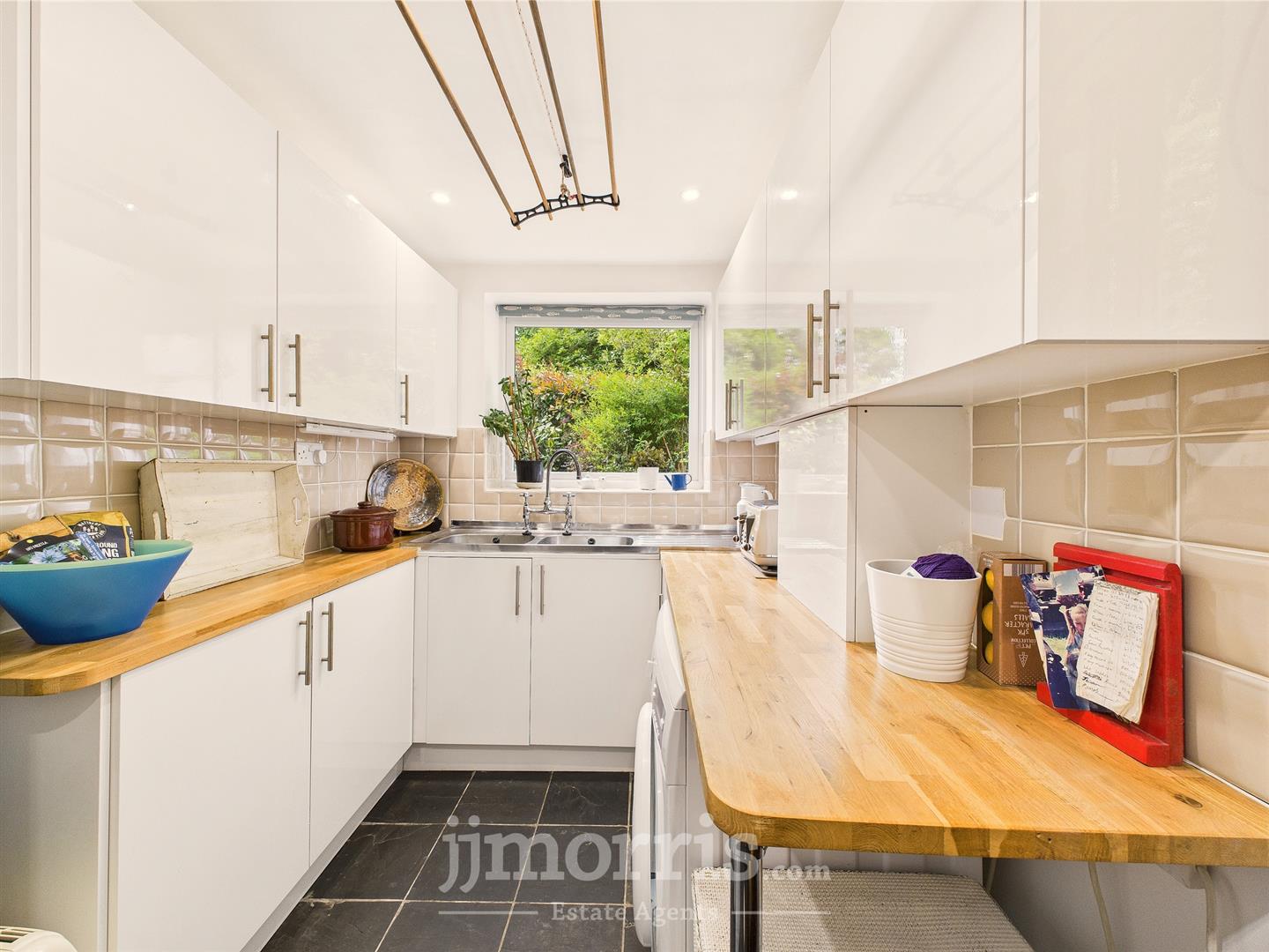 Utility Room - Outfitted with wall and base storage and oak countertops, double drainer sink, space for white goods, partial wall tiling, slate flooring, plumbing for a washing machine, and double glazed windows to the side and rear, door leads to the: