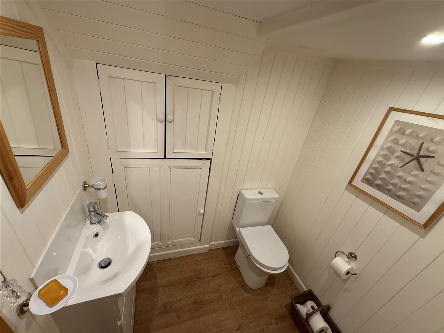 Separate W.C. - Fitted a wash hand basin, Wooden Panel Walls, WC, storage cupboards and a wooden laminate floor