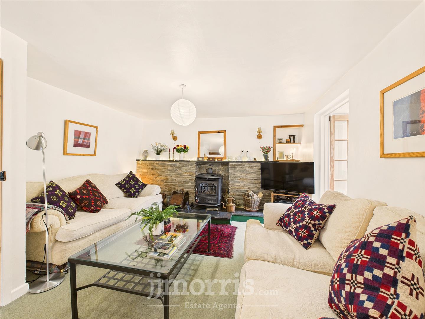 Living Room - Home to a wood-burning stove in a feature stone surround with a generous slate hearth, exposed ceiling beams, large side-facing double glazed window, multiple radiators, built-in storage, access to the utility area, and double doors opening into: