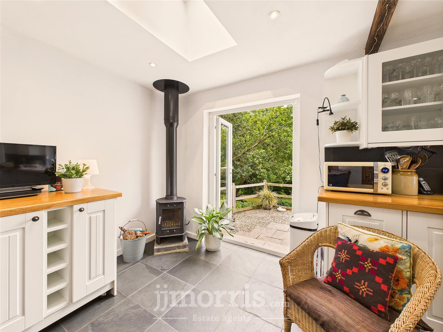Kitchen - Comprising a variety of wall and base units finished with solid oak worktops, a 1 1/2 Belfast sink, integrated fridge, AEG built-in dishwasher, and an electric range cooker with a 7-ring Calor gas hob and extractor above. Features include an exposed beam, radiator and vertical-style radiator, partial wall tiling, slate tile flooring, a wood burner set on a slate hearth, skylights, double glazed side and rear windows offering garden views, French doors to the garden, plus access to both the sun room and: