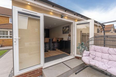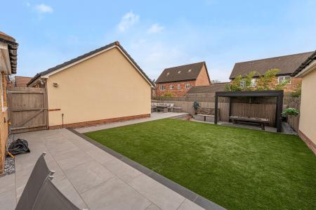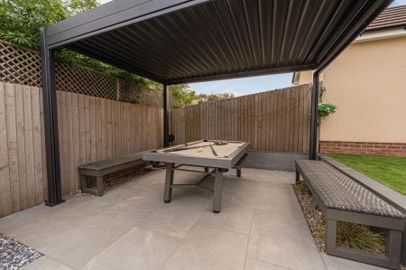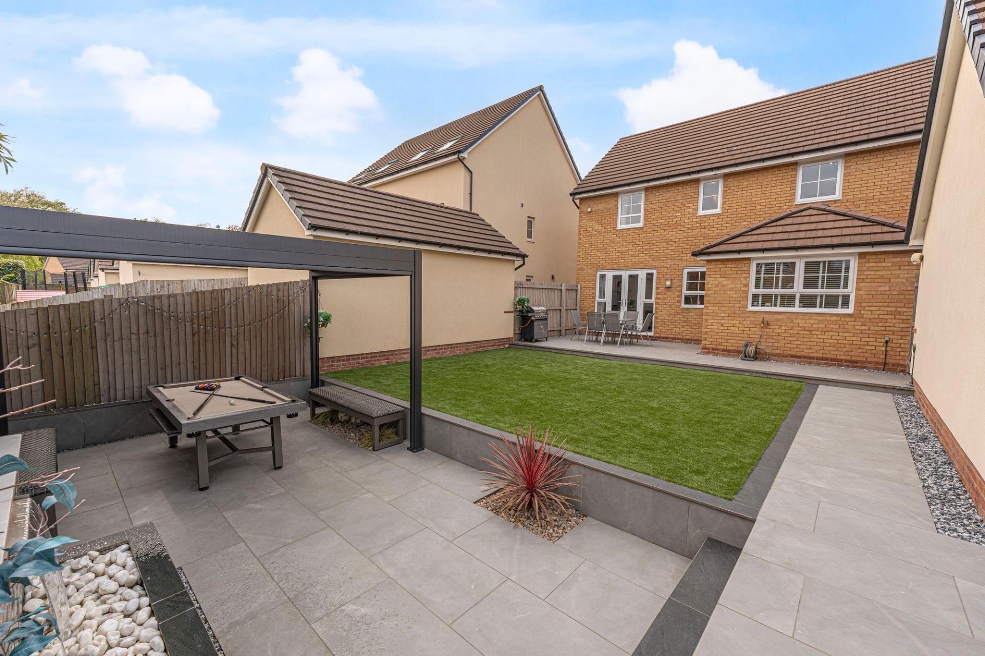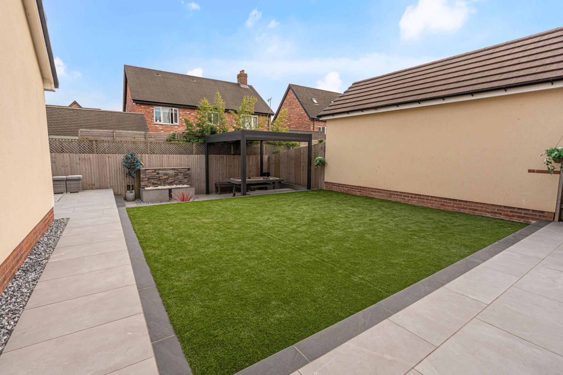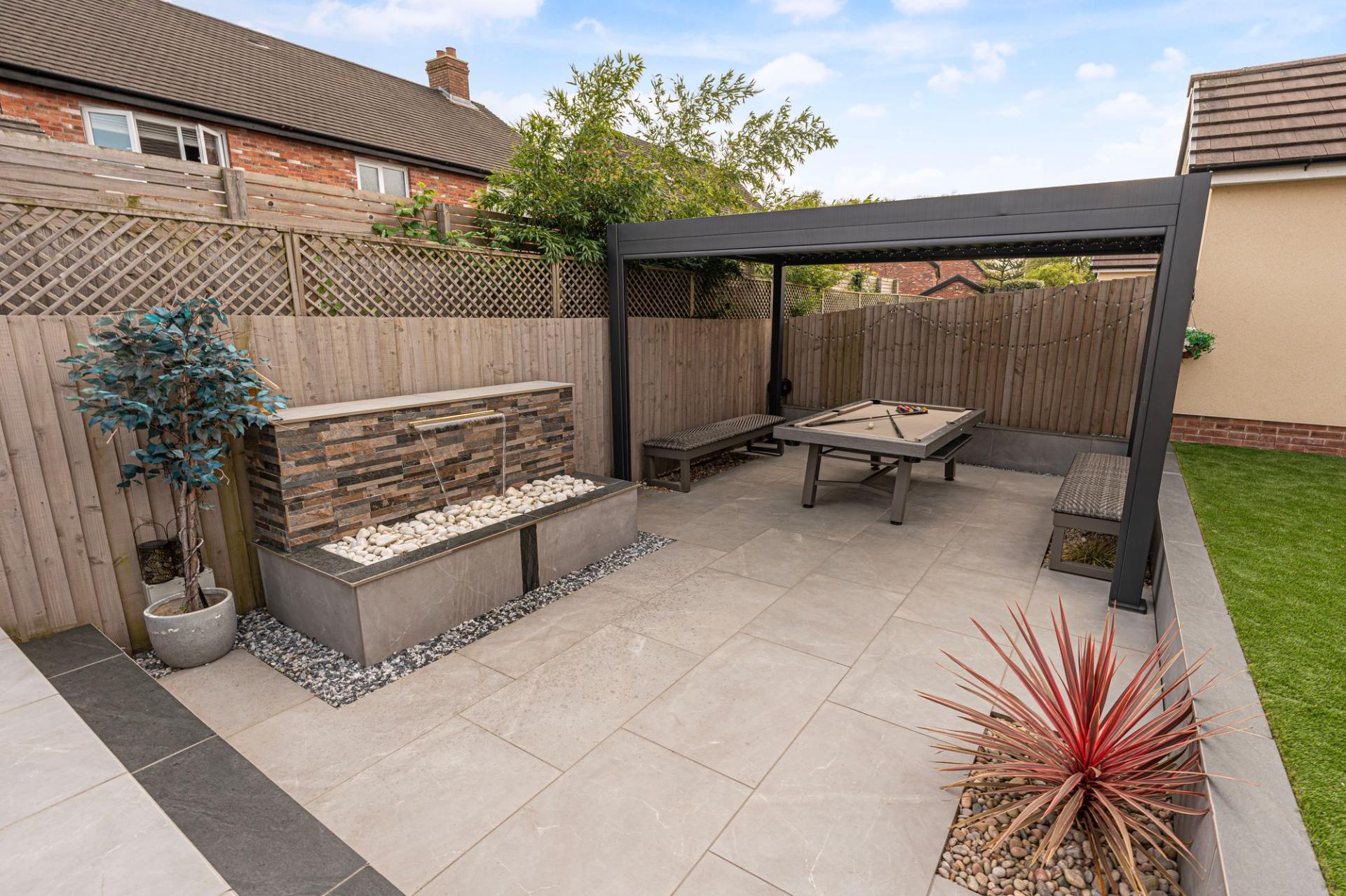 The outdoor areas are a true highlight, boasting landscaped gardens with artificial lawns, spacious patios, as well as a modern pergola for covered seating. The garden is fully enclosed and enjoys a glorious low maintenance design, as well as a charming water feature, with a wealth of outdoor space that is perfect for entertaining guests, dining al-fresco style or unwinding at the end of a long day. From the garden we can access the rear of the garage, which has been partially converted into a impeccable entertainment room/home bar, complete with spotlights, a large media wall ,and a charming fireplace, granting a huge degree of potential for this attractive retreat. The front section of the garage has been retained for storage space, while the driveway provides off-road parking space for 2-3 vehicles.