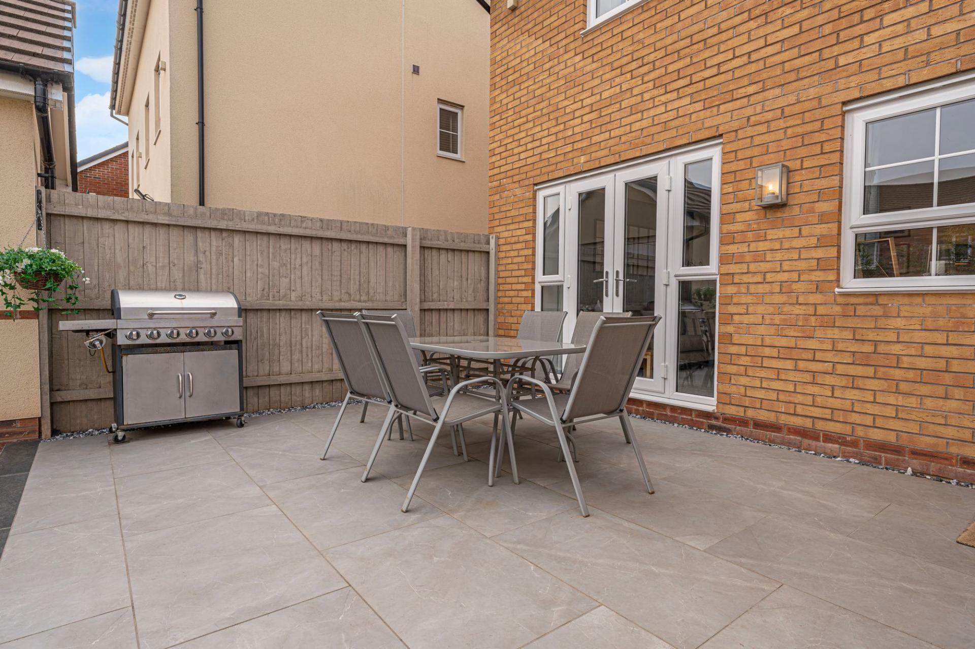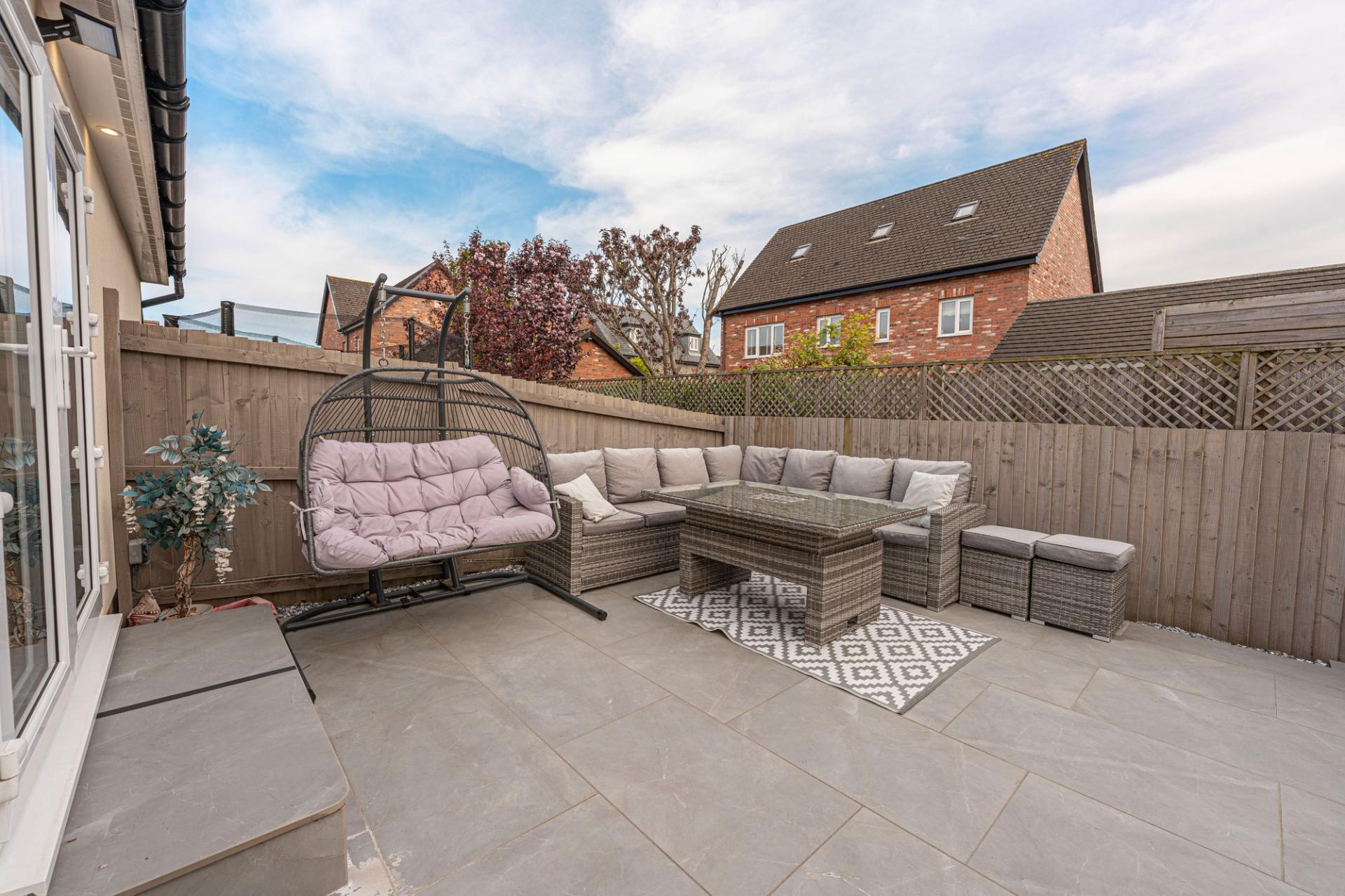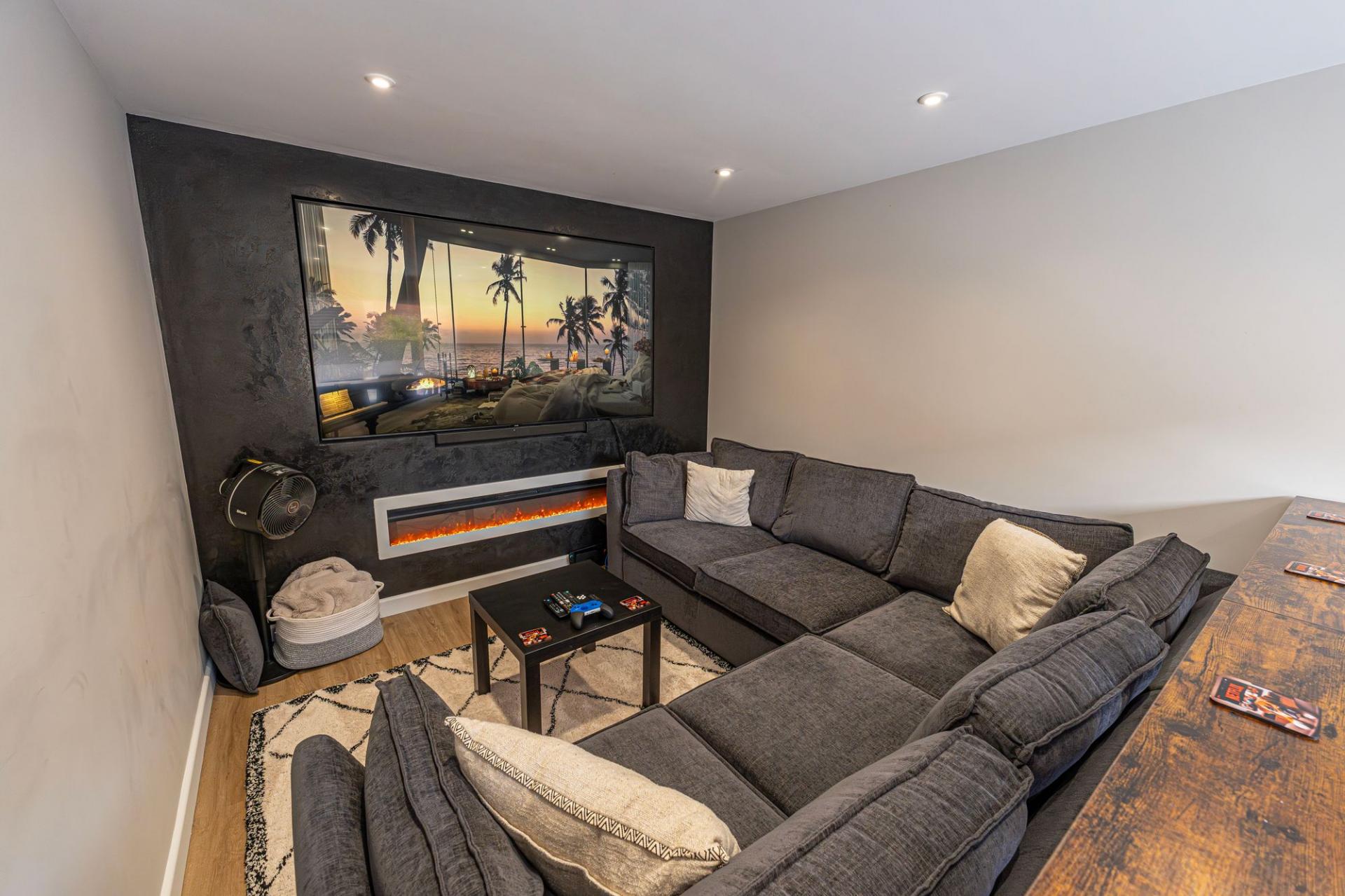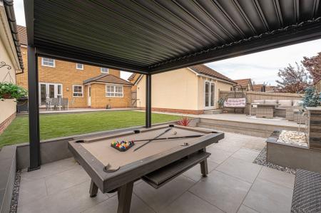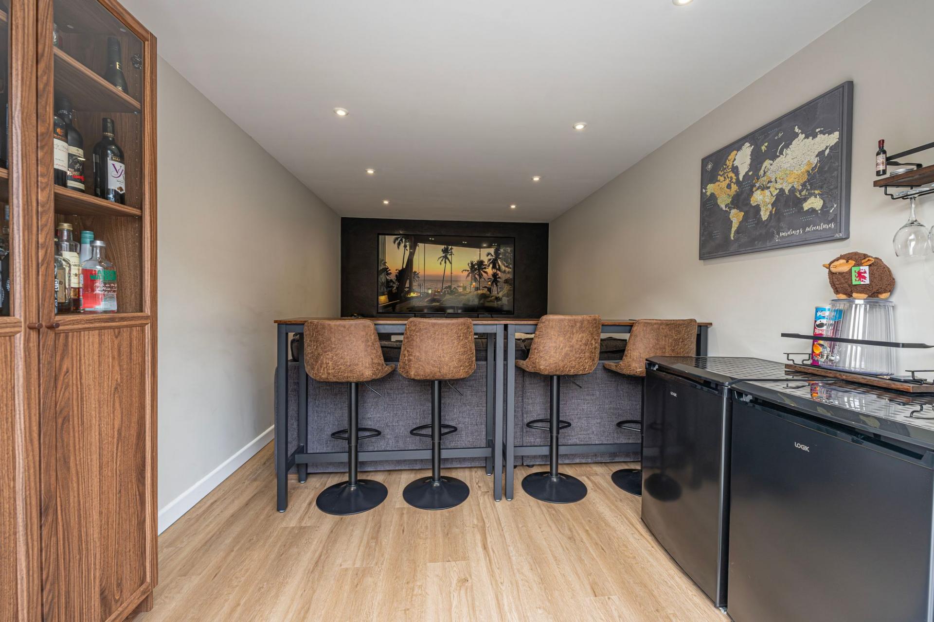 The outdoor areas are a true highlight, boasting landscaped gardens with artificial lawns, spacious patios, as well as a modern pergola for covered seating. The garden is fully enclosed and enjoys a glorious low maintenance design, as well as a charming water feature, with a wealth of outdoor space that is perfect for entertaining guests, dining al-fresco style or unwinding at the end of a long day. From the garden we can access the rear of the garage, which has been partially converted into a impeccable entertainment room/home bar, complete with spotlights, a large media wall ,and a charming fireplace, granting a huge degree of potential for this attractive retreat. The front section of the garage has been retained for storage space, while the driveway provides off-road parking space for 2-3 vehicles.