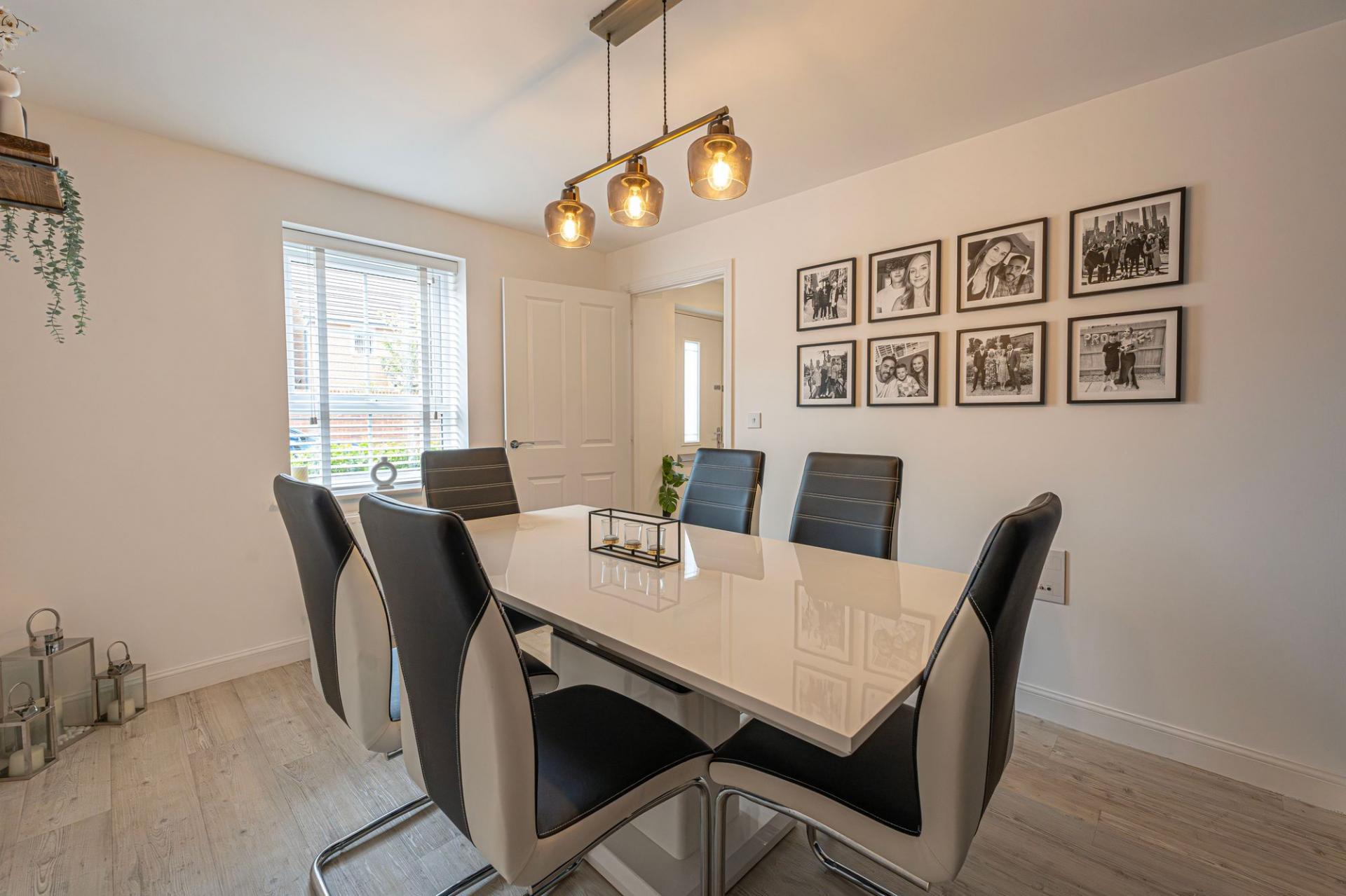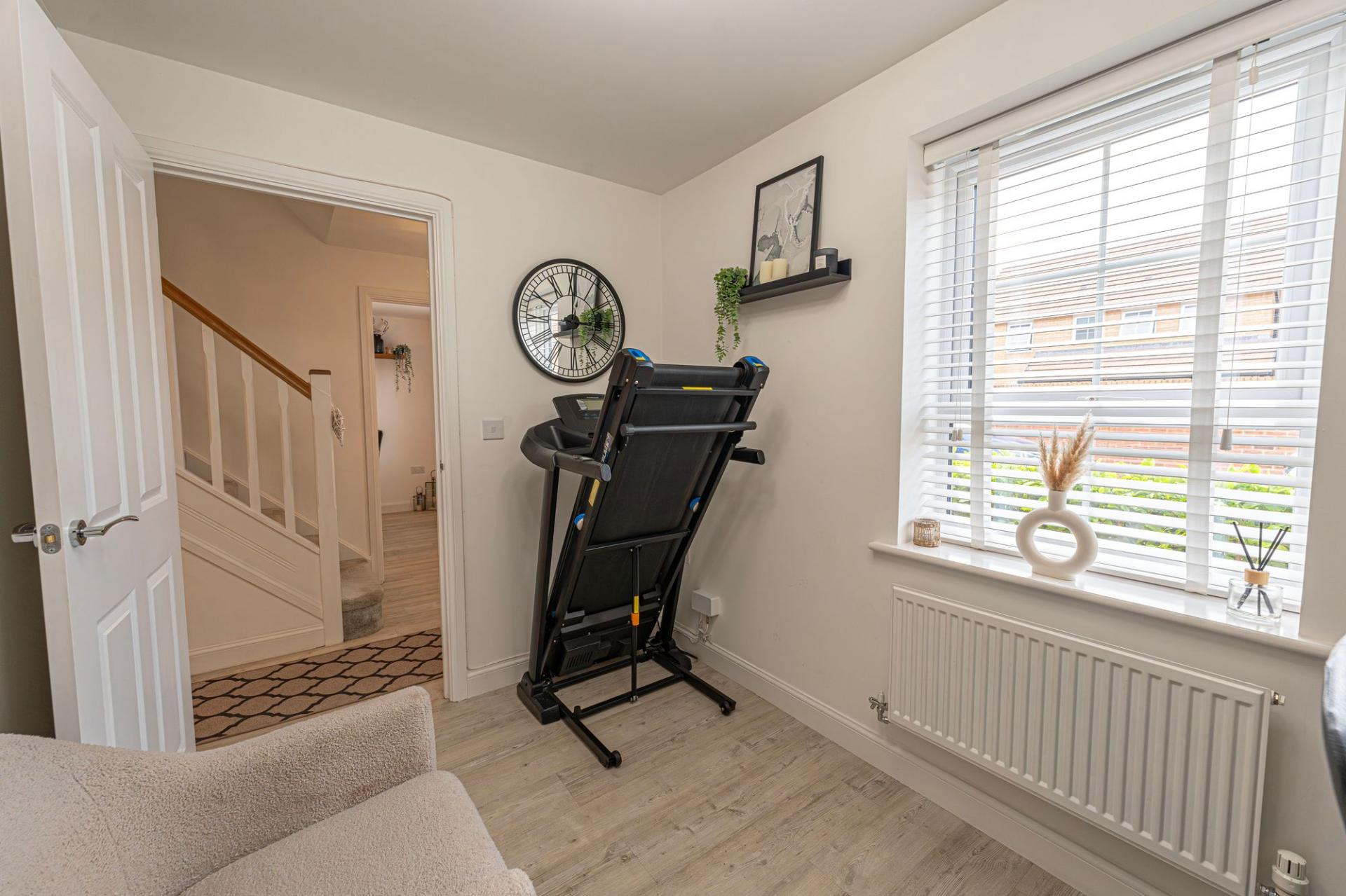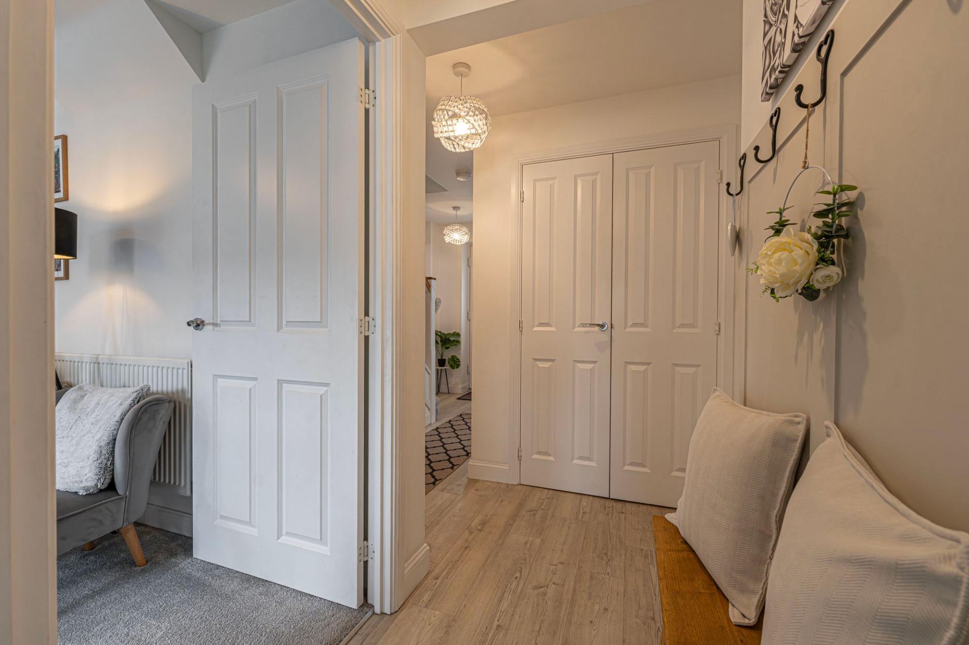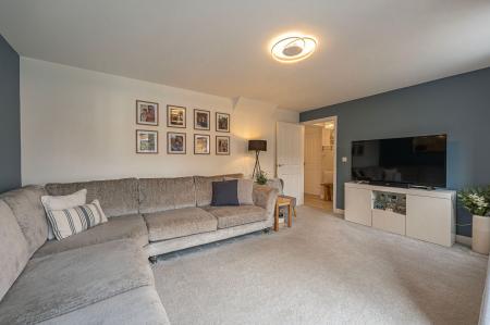 This fantastic property is beautifully presented throughout, offering a variety of versatile reception rooms to support modern family living, with an abundance of space for relaxing and entertaining. The heart of the home features an impressive living room that is flooded with natural light, with multiple windows that include French doors that open to the garden. Towards the front of the house we have the formal dining room and a flexible snug room, currently staged as a home office - while also being great for a quaint lounge area. The modern kitchen stands out with sleek units with an ample storage space and numerous integrated appliances, with space for another casual dining area or breakfast nook adjacent. The kitchen also provides another access point to the garden, and feature a helpful utility room adjacent. From the hallway we can find a fitted cloakroom cupboard, a W.C, an understairs storage, before ascending to the first floor.