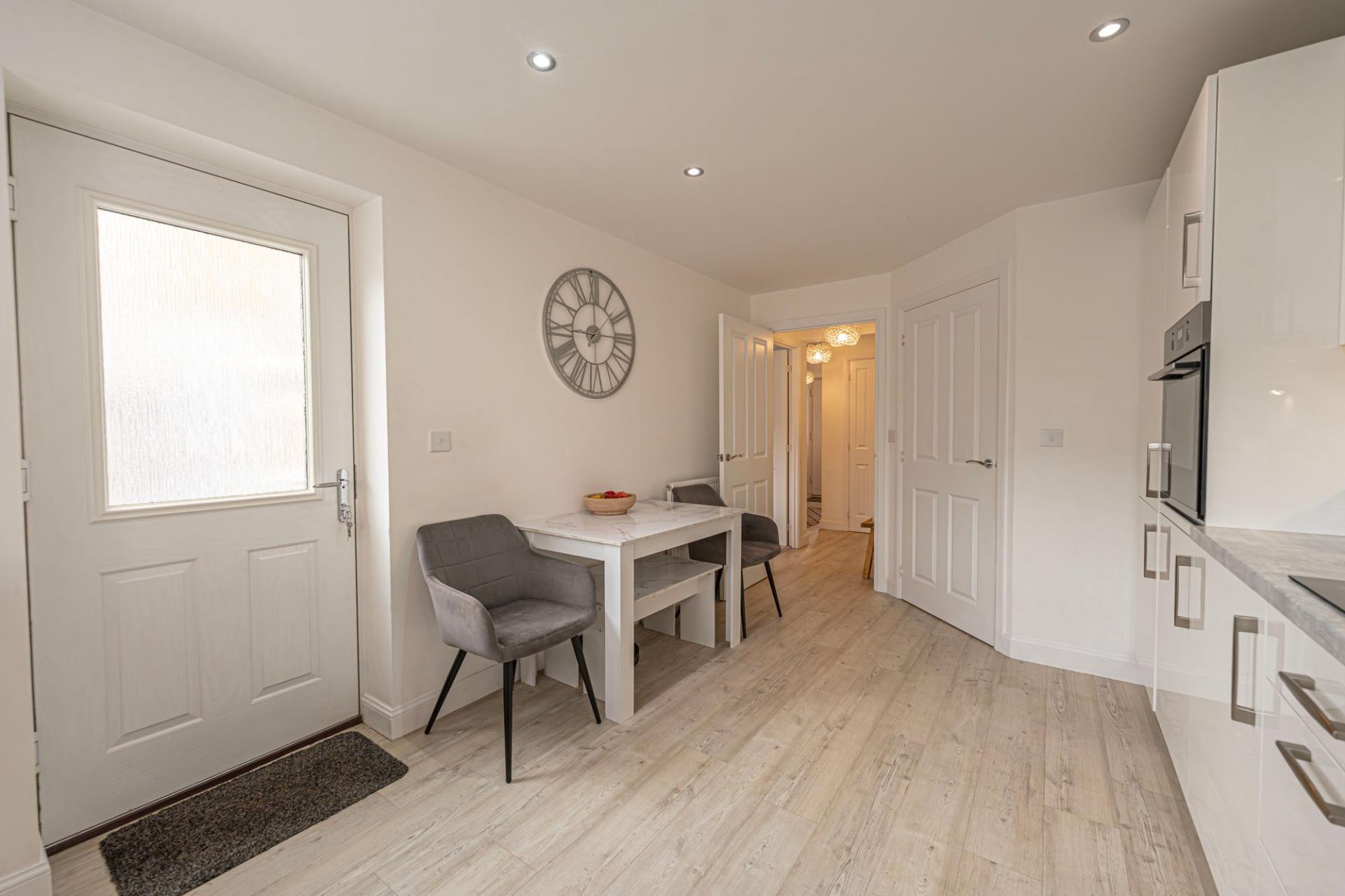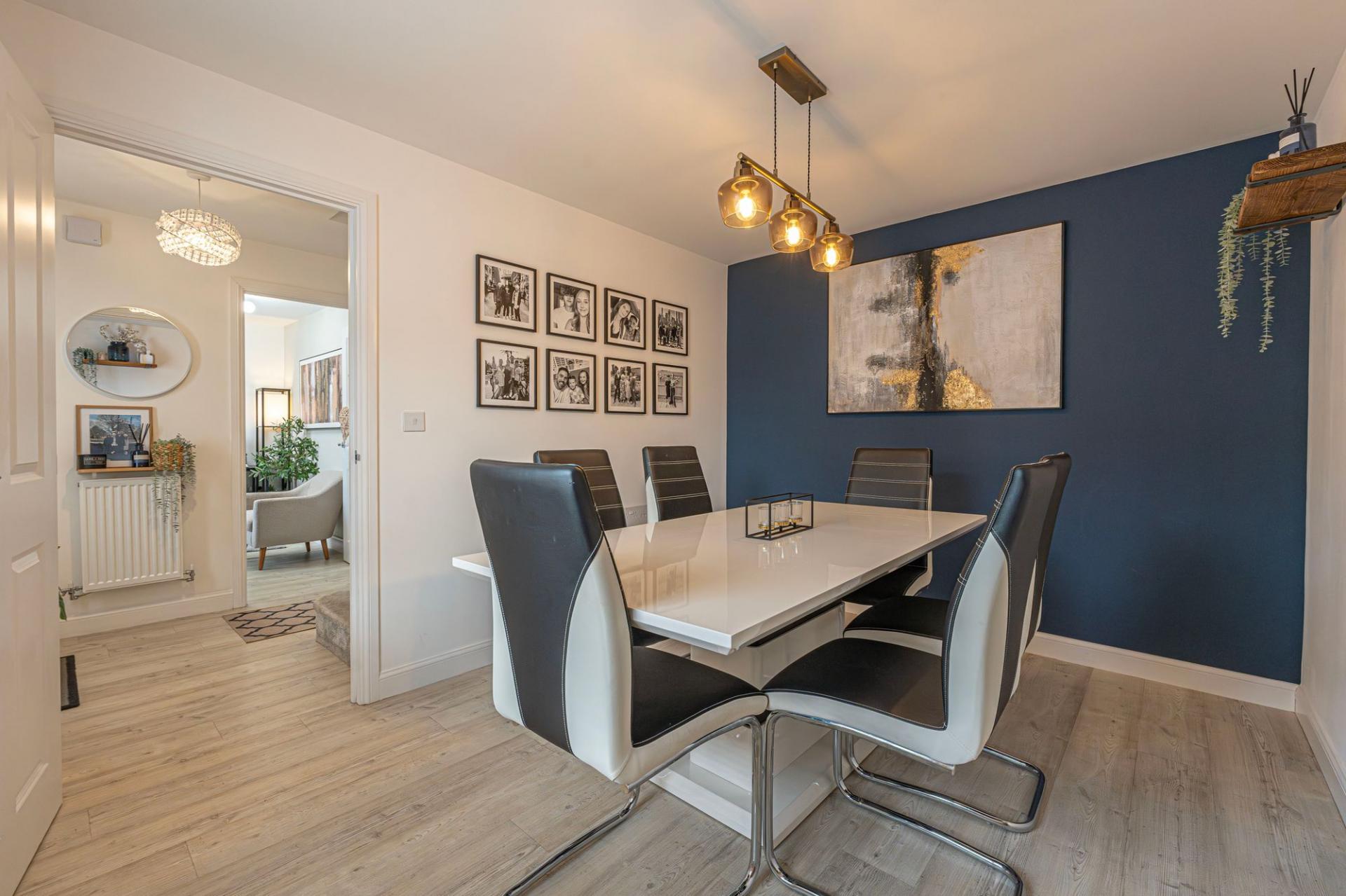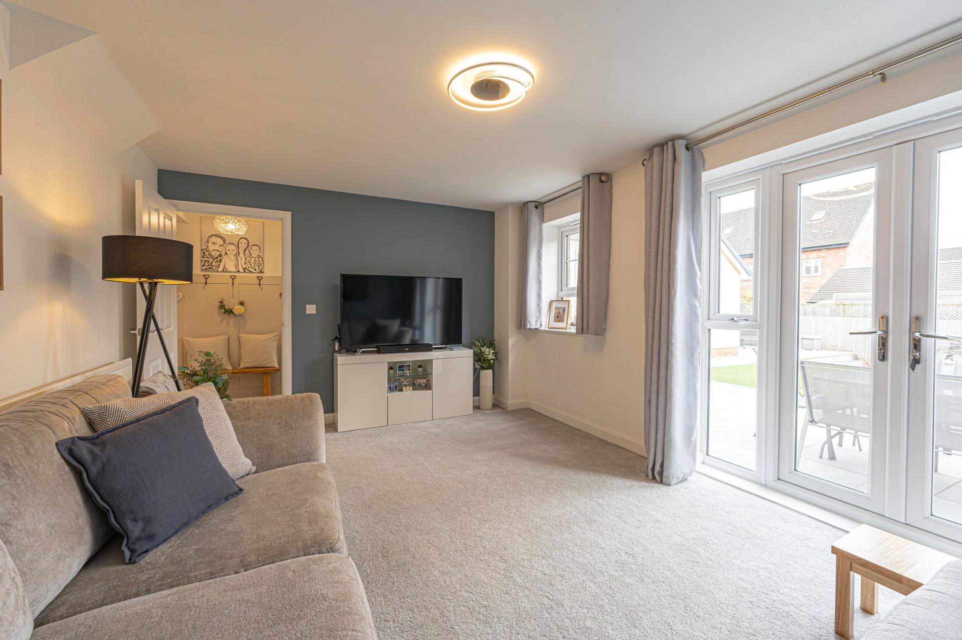 This fantastic property is beautifully presented throughout, offering a variety of versatile reception rooms to support modern family living, with an abundance of space for relaxing and entertaining. The heart of the home features an impressive living room that is flooded with natural light, with multiple windows that include French doors that open to the garden. Towards the front of the house we have the formal dining room and a flexible snug room, currently staged as a home office - while also being great for a quaint lounge area. The modern kitchen stands out with sleek units with an ample storage space and numerous integrated appliances, with space for another casual dining area or breakfast nook adjacent. The kitchen also provides another access point to the garden, and feature a helpful utility room adjacent. From the hallway we can find a fitted cloakroom cupboard, a W.C, an understairs storage, before ascending to the first floor.