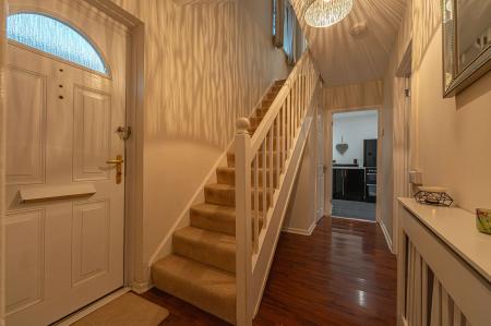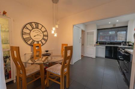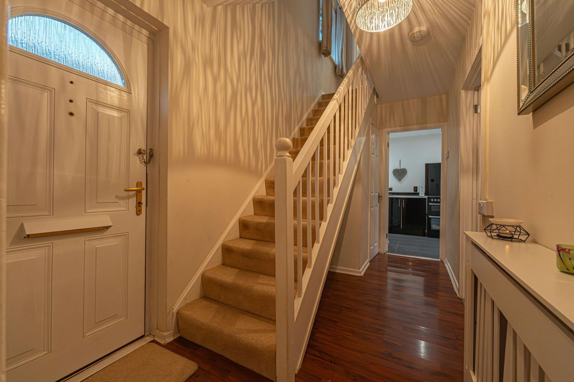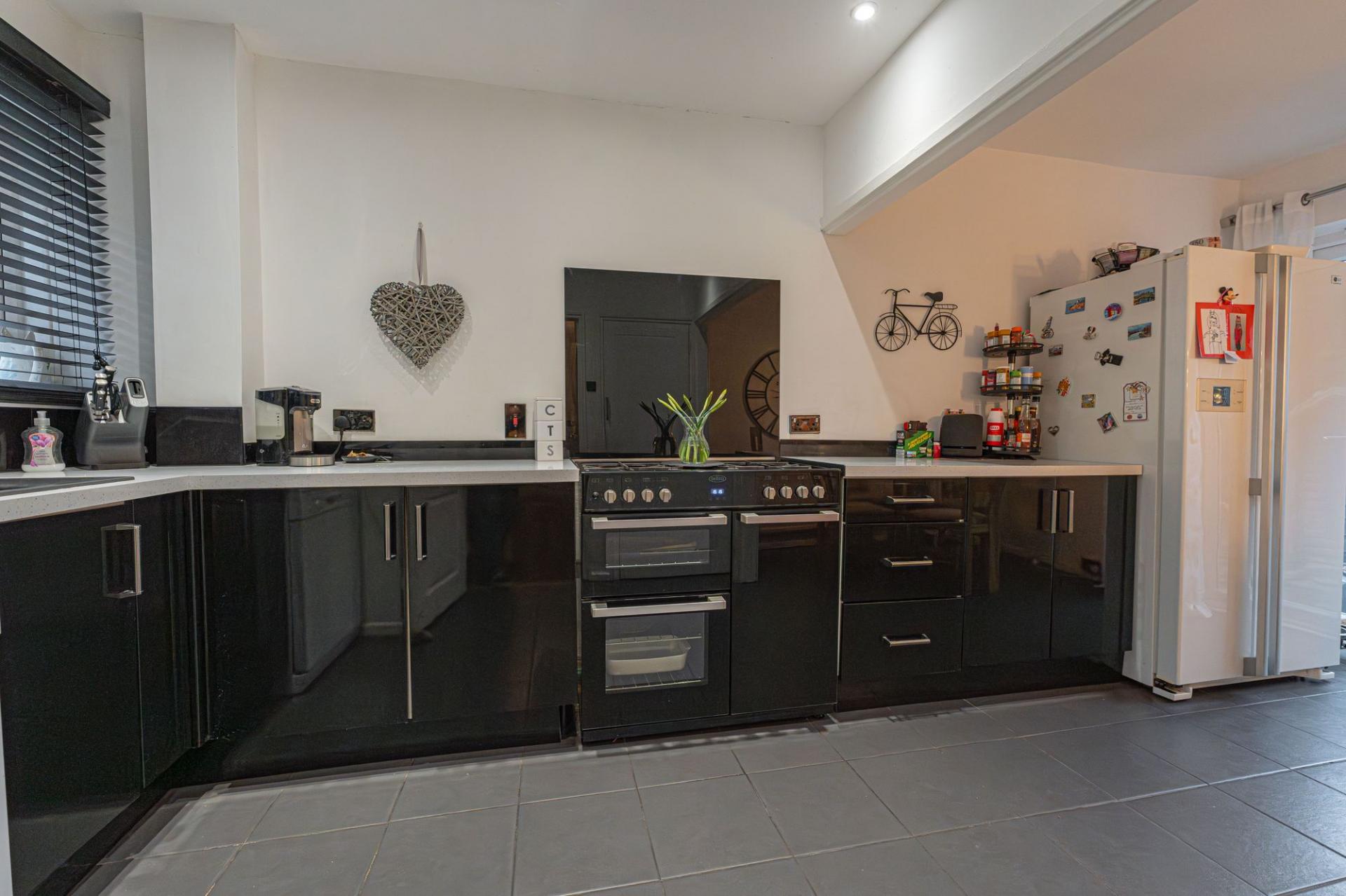 This well presented family home features a spacious living room at the heart of the home, which features a large window that allows natural light to cascade throughout the room, promoting a bright and welcoming atmosphere for relaxing and entertaining guests. The kitchen showcases a sleek and modern design, with a wide range of high-gloss fixtures and space for numerous appliances. A fitted pantry cupboard provides further storage, while the open plan design spans encompasses the neighbouring dining area, which is lit up by French doors to the garden. The ground floor also features a W.C that is currently doubled up as a laundry room, whilst to the end of the hallway we have a useful cloakroom that offers a secondary entry point at the front of the house.