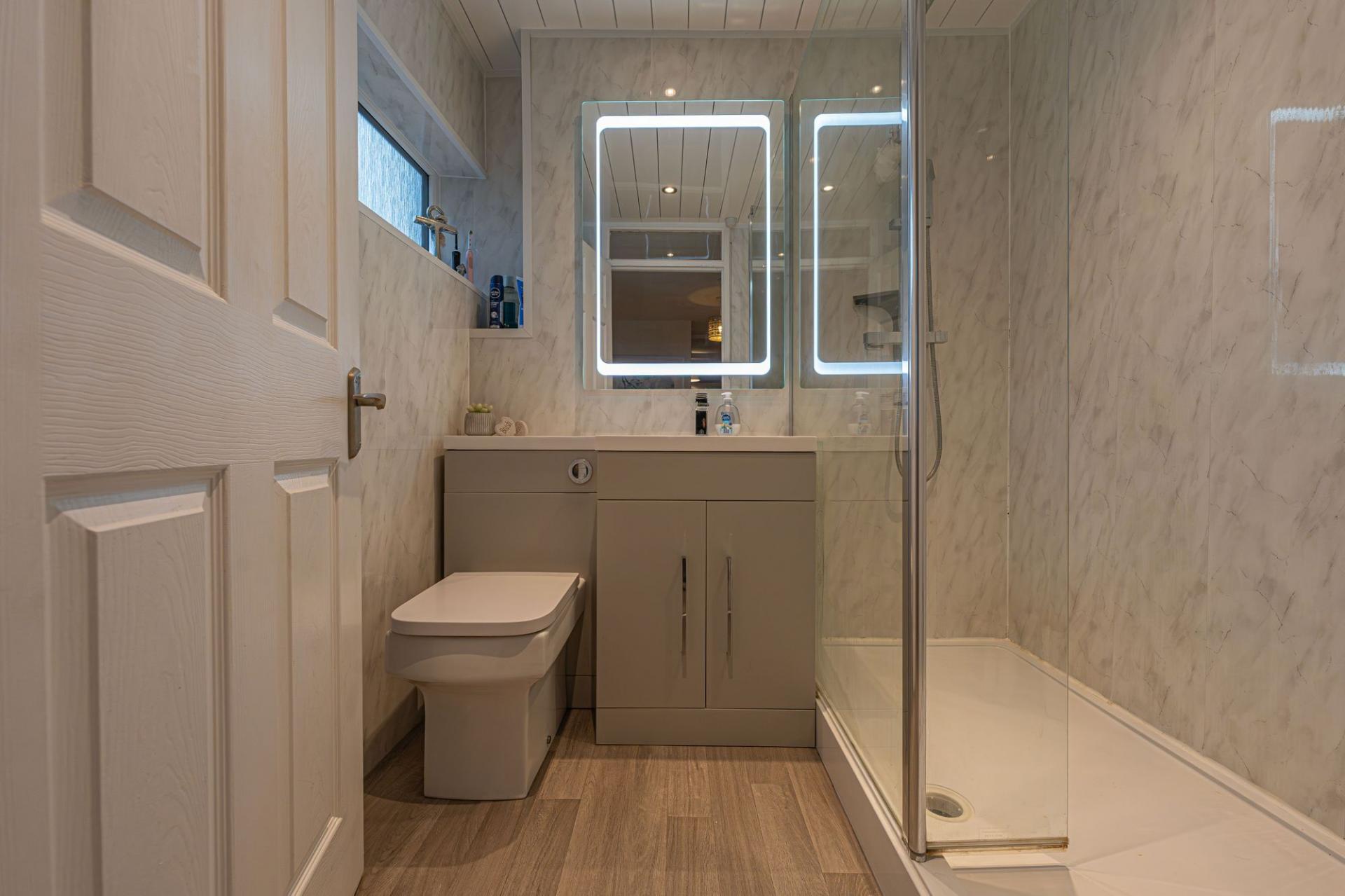 Upstairs we have three bedrooms, which can all accommodate double bedrooms, making this ideal for a family, as well as presenting practical space for alternative functions. Two of the bedrooms have access to fitted wardrobes, including the principal bedroom which enjoys a considerable size. The modern family bathroom is available from the landing, featuring a walk in rainfall shower and a sink with fitted vanity units.
