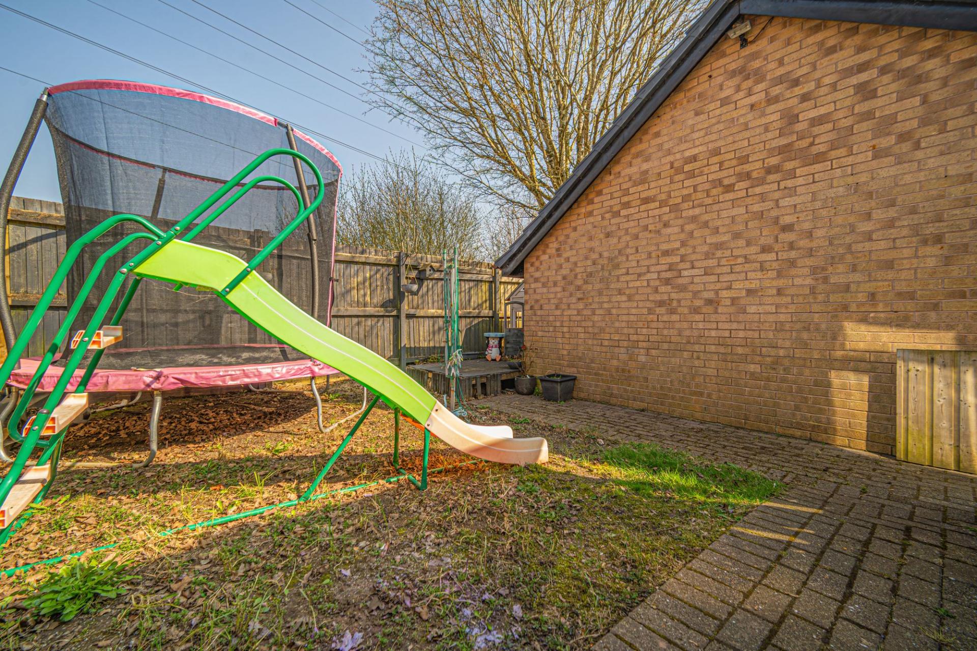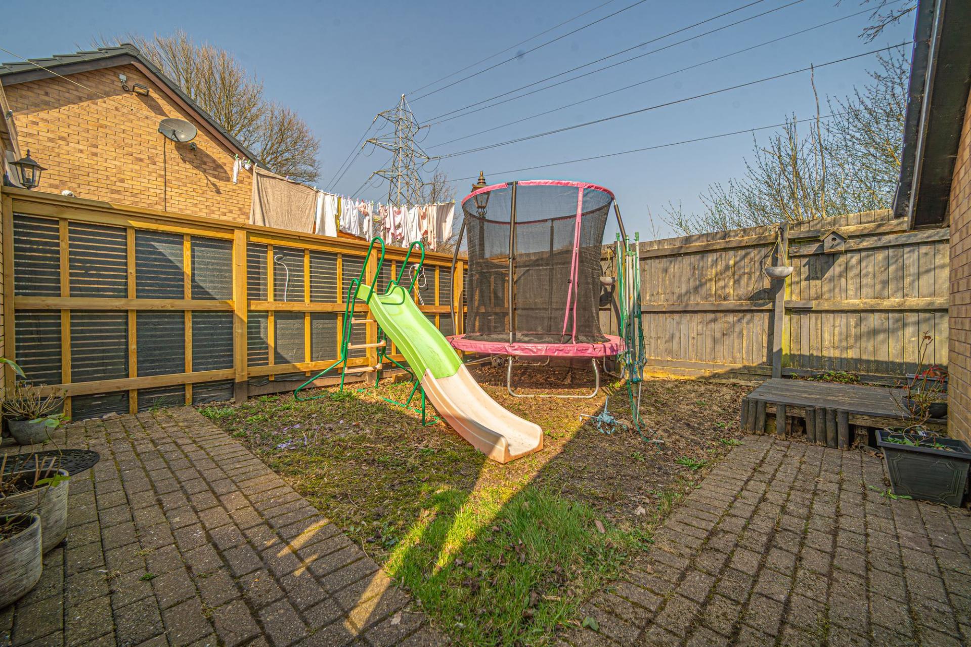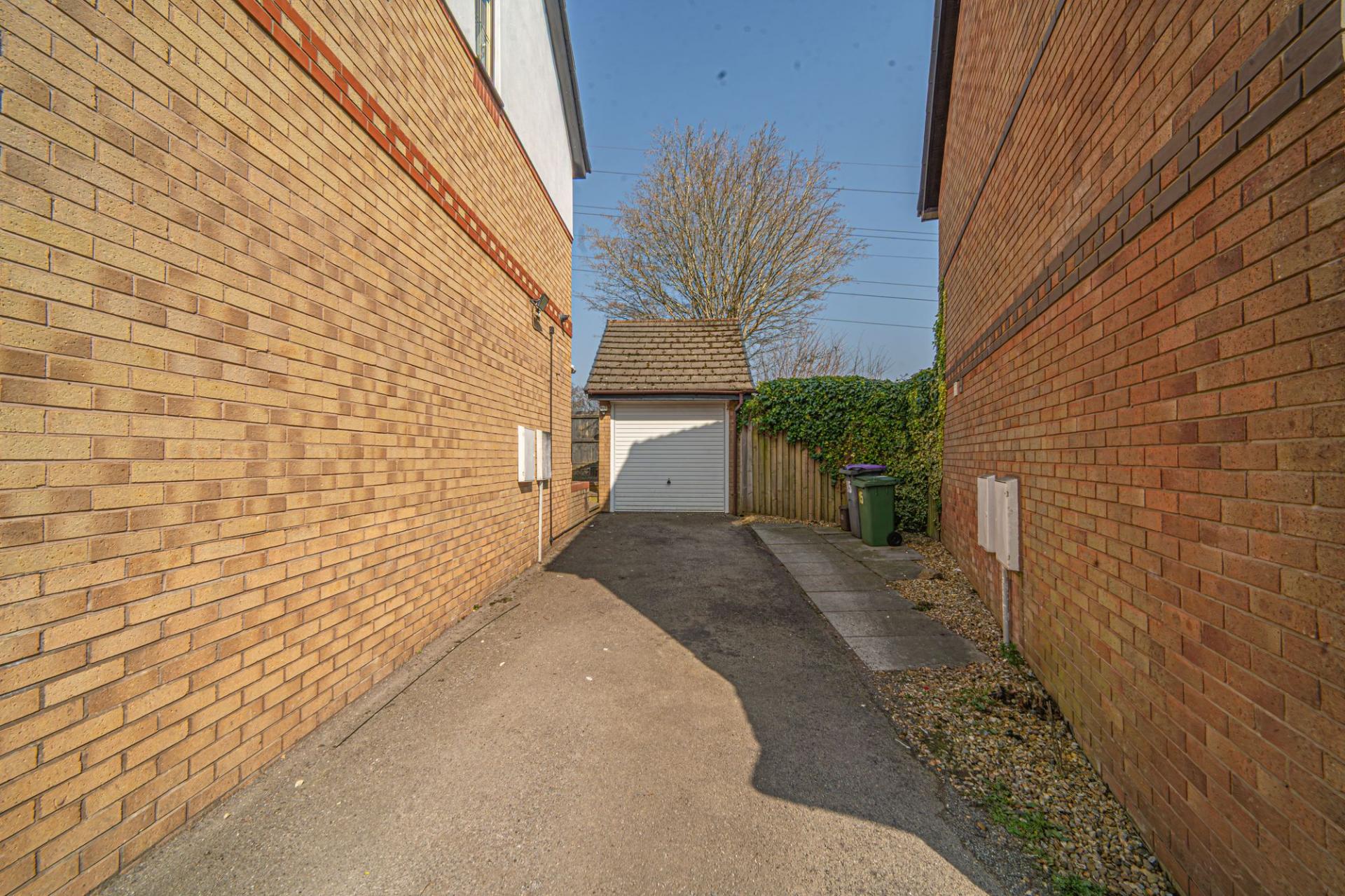 Stepping outside we have the rear garden, which is fully enclosed and consists of a blend of tiled patio and grass lawn, offering plenty of space for relaxing in the sunshine or enjoying various garden activities, while having great potential for welcoming visitors for tea/coffee or dining al-fresco style. From the garden we can find a gateway that takes us to the garage positioned to the side of the house, which can be used for sheltered parking or overflow storage. There is also a large driveway that can park at least 2 vehicles when in tandem.