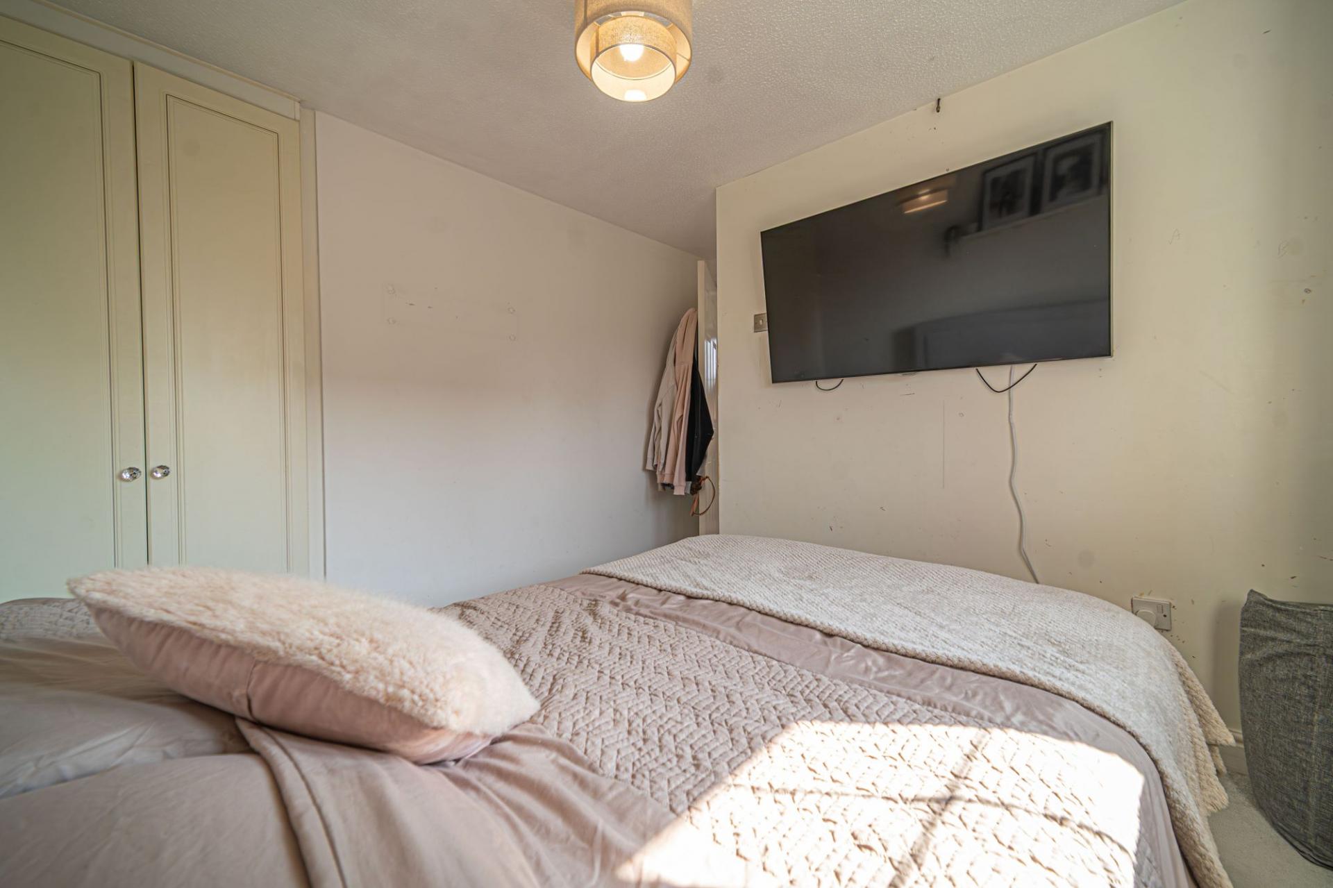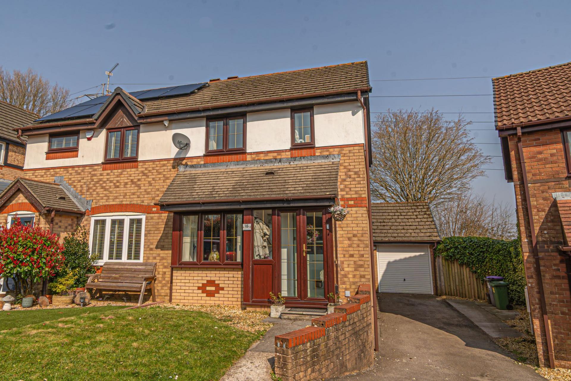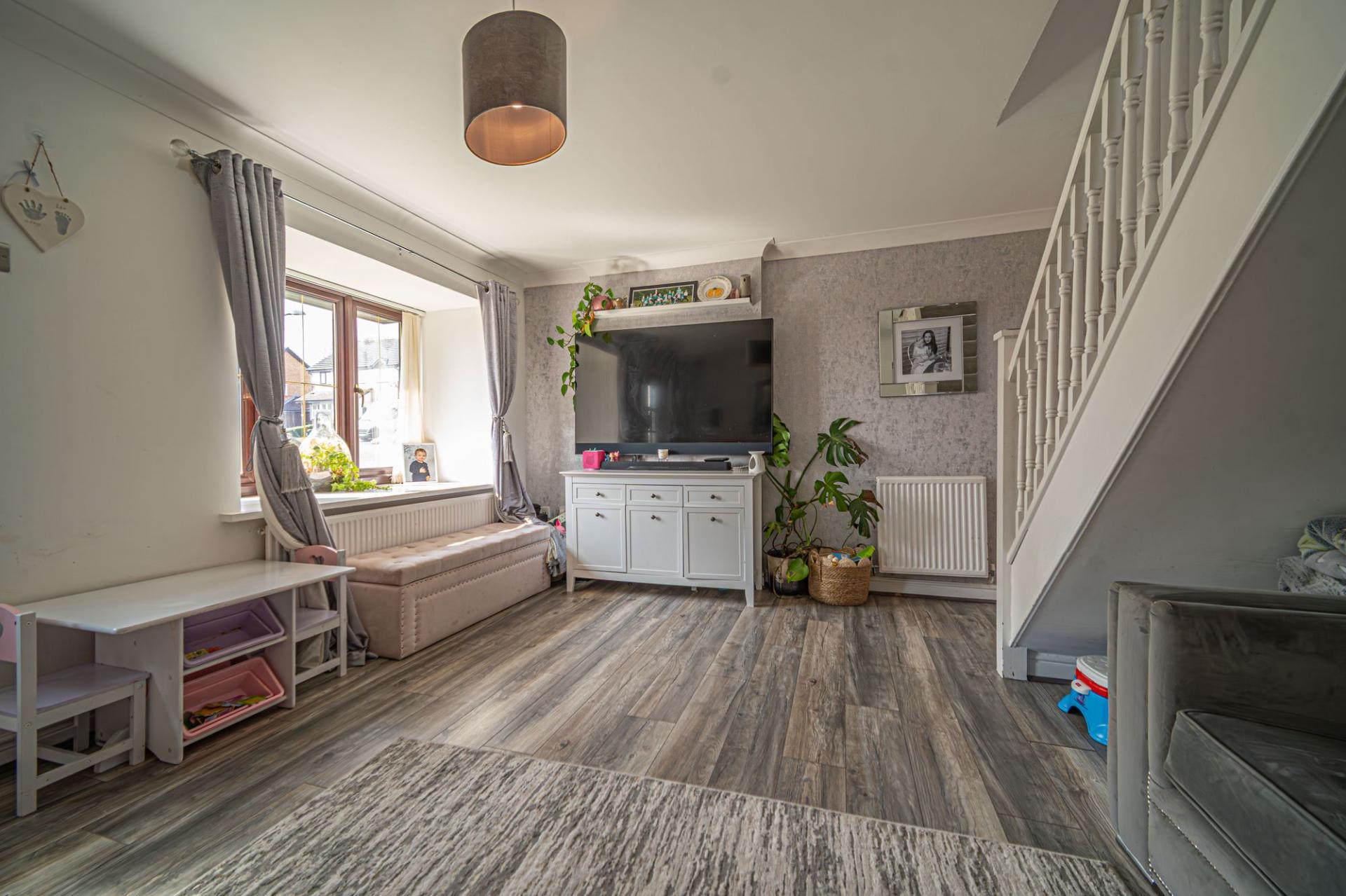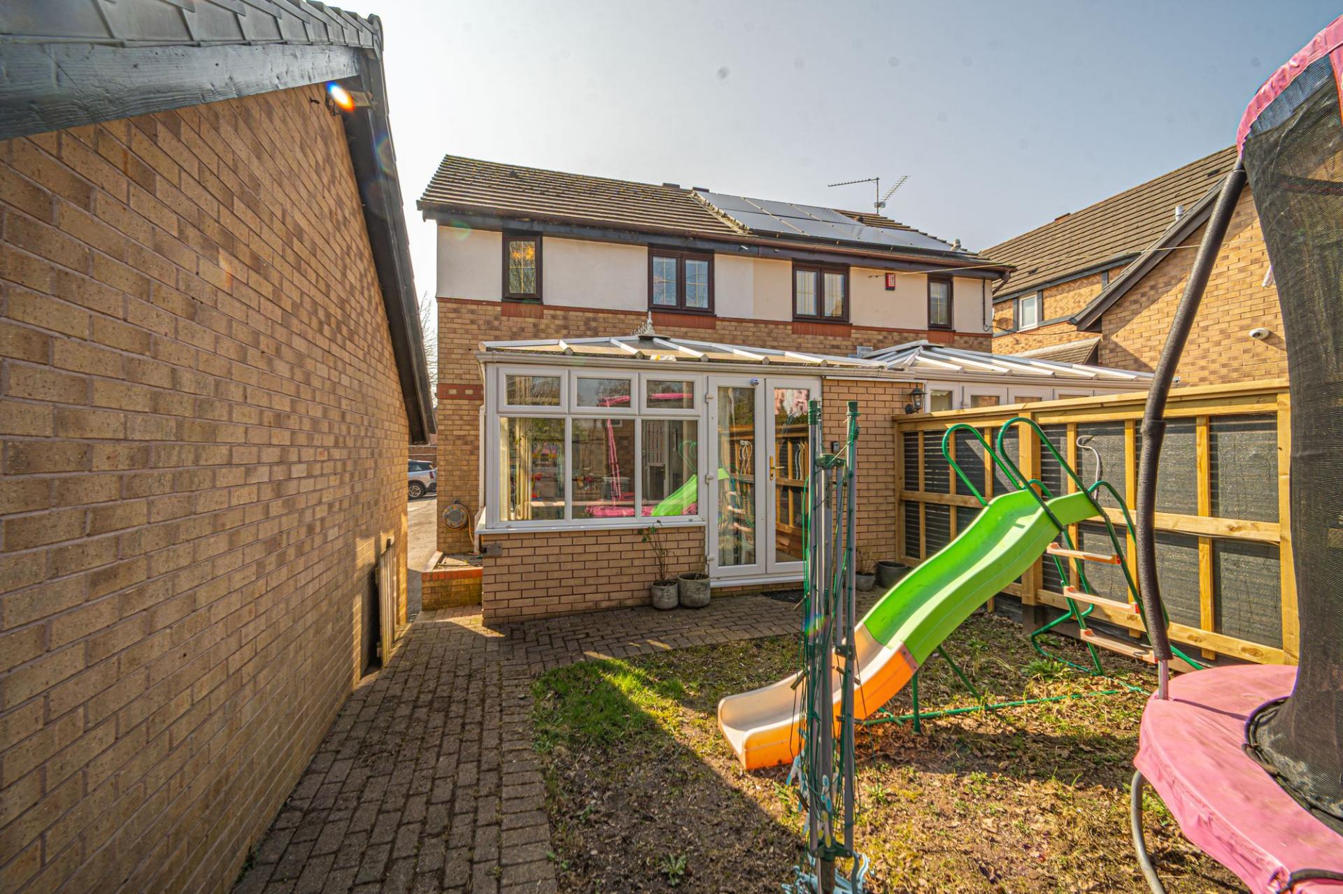 Stepping outside we have the rear garden, which is fully enclosed and consists of a blend of tiled patio and grass lawn, offering plenty of space for relaxing in the sunshine or enjoying various garden activities, while having great potential for welcoming visitors for tea/coffee or dining al-fresco style. From the garden we can find a gateway that takes us to the garage positioned to the side of the house, which can be used for sheltered parking or overflow storage. There is also a large driveway that can park at least 2 vehicles when in tandem.