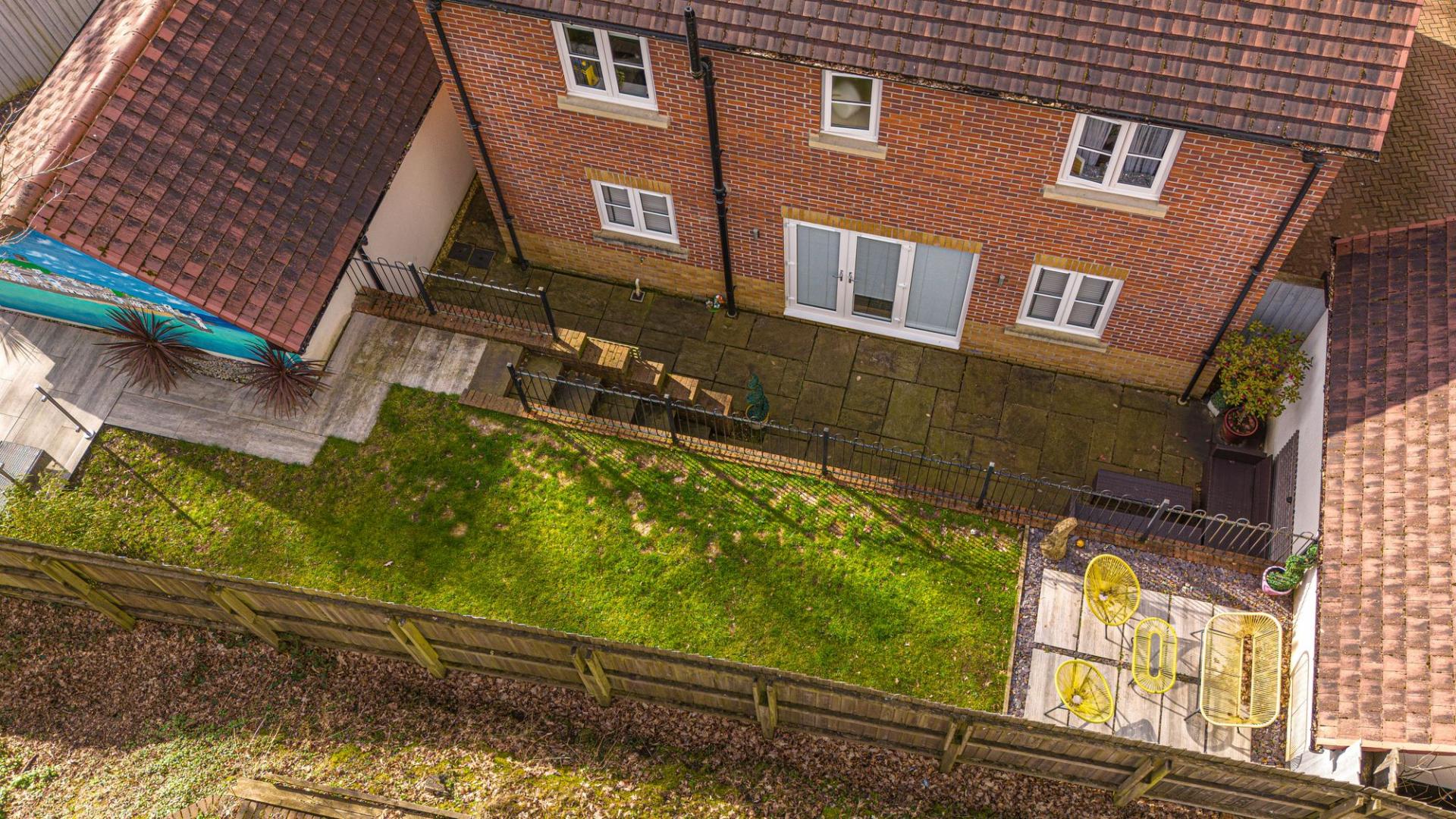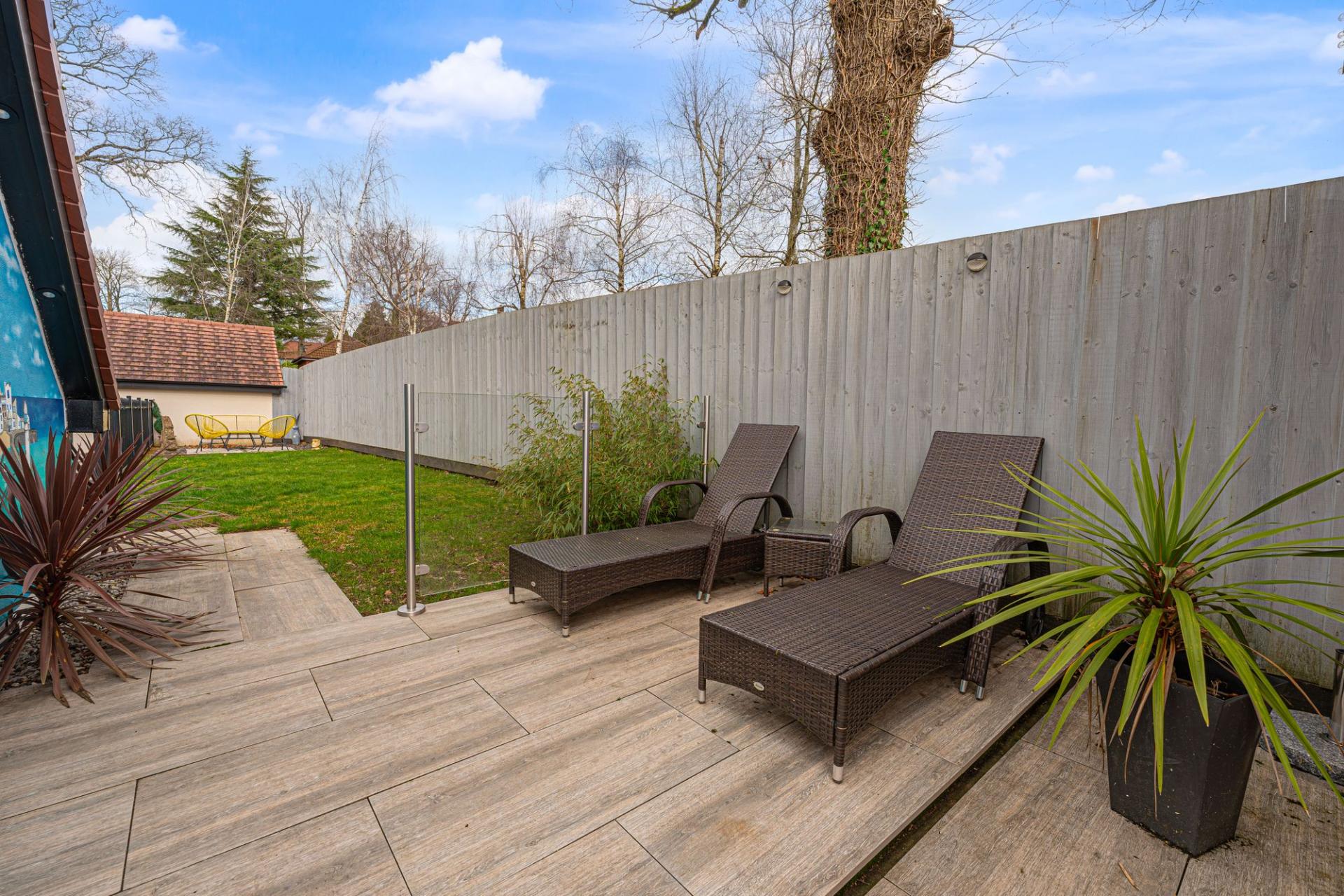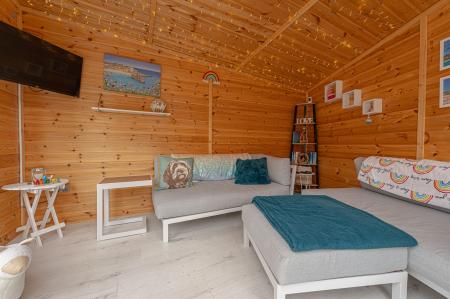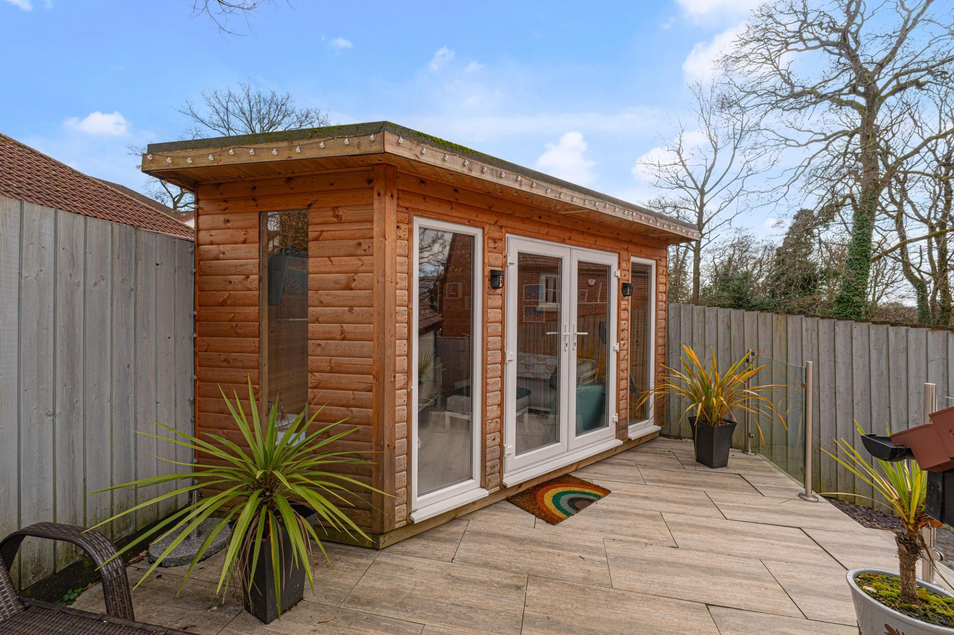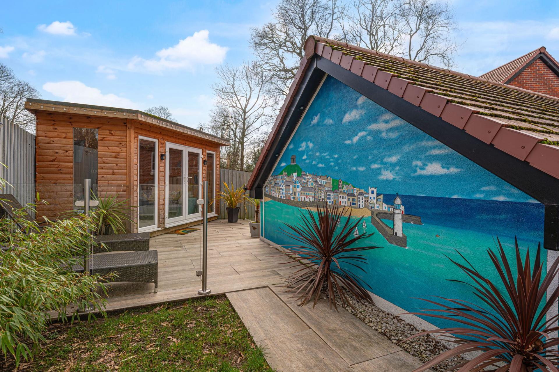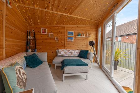 The property excels with its outdoor areas, with a two tiered garden offering abundance of outdoor space for residents to enjoy, with a large patio, spacious grass lawn and seating areas, all enclosed with privacy fencing. Further attractions include a beautiful mural decorating the far side of the garden, and a charming summerhouse equipped with power and lighting, creating a cosy lounge area with great potential for a home bar or games room. Additional highlights include a detached garage, which has is currently being used as home gym with a stud wall to allow a helpful storage area. Off-road parking is available thanks to a large driveway that can fit around 2-3 vehicles, while the communal green and mature trees to the front of the house provides a warm welcome on approach to this extravagant family home.