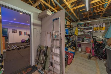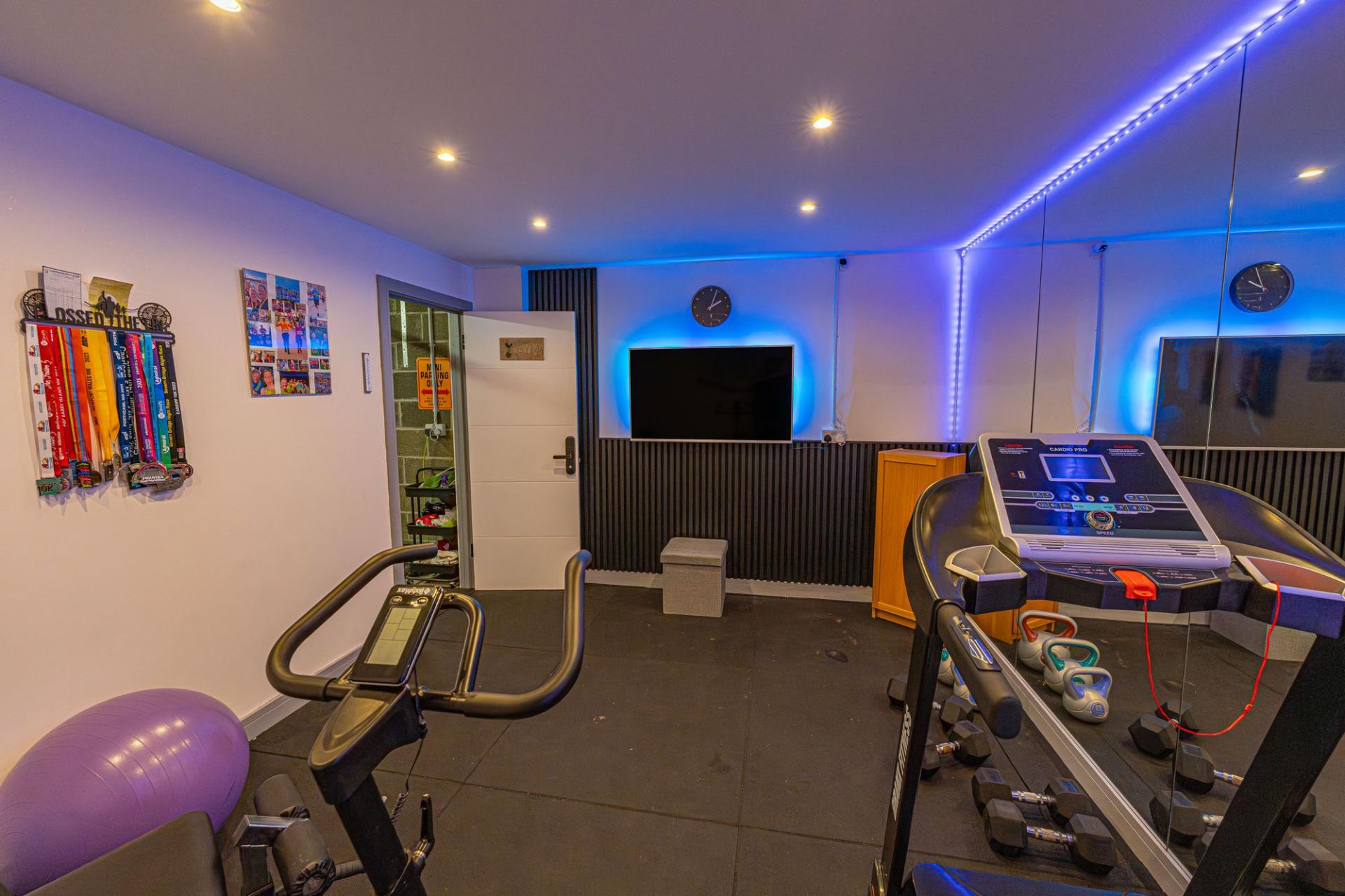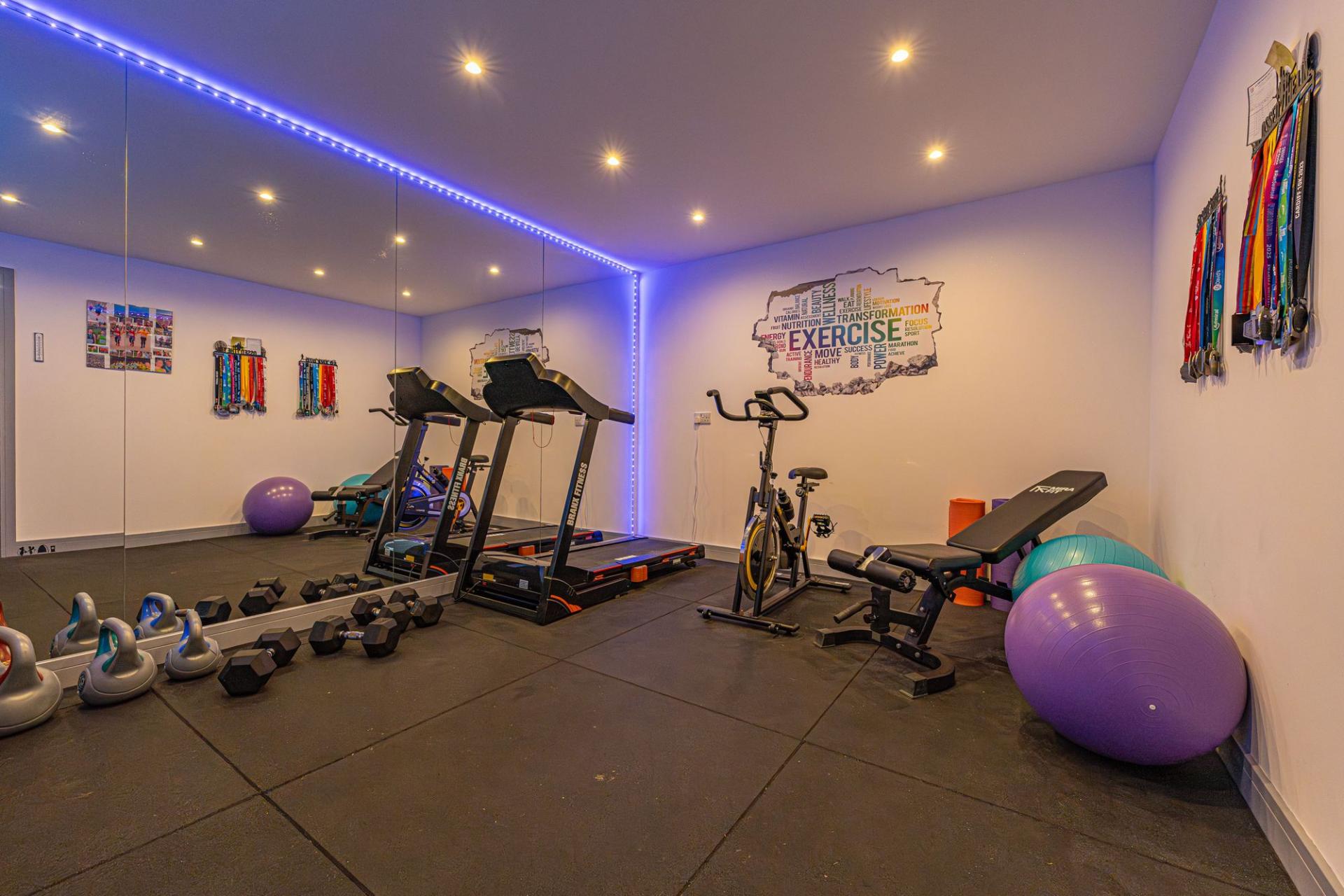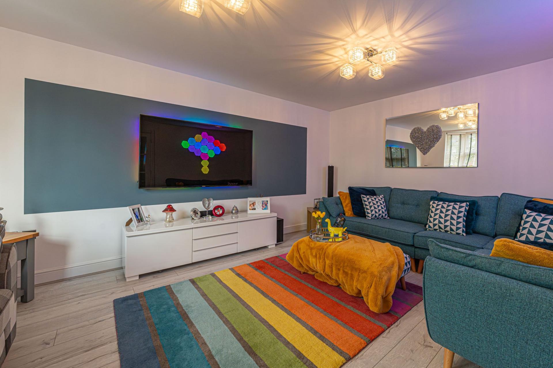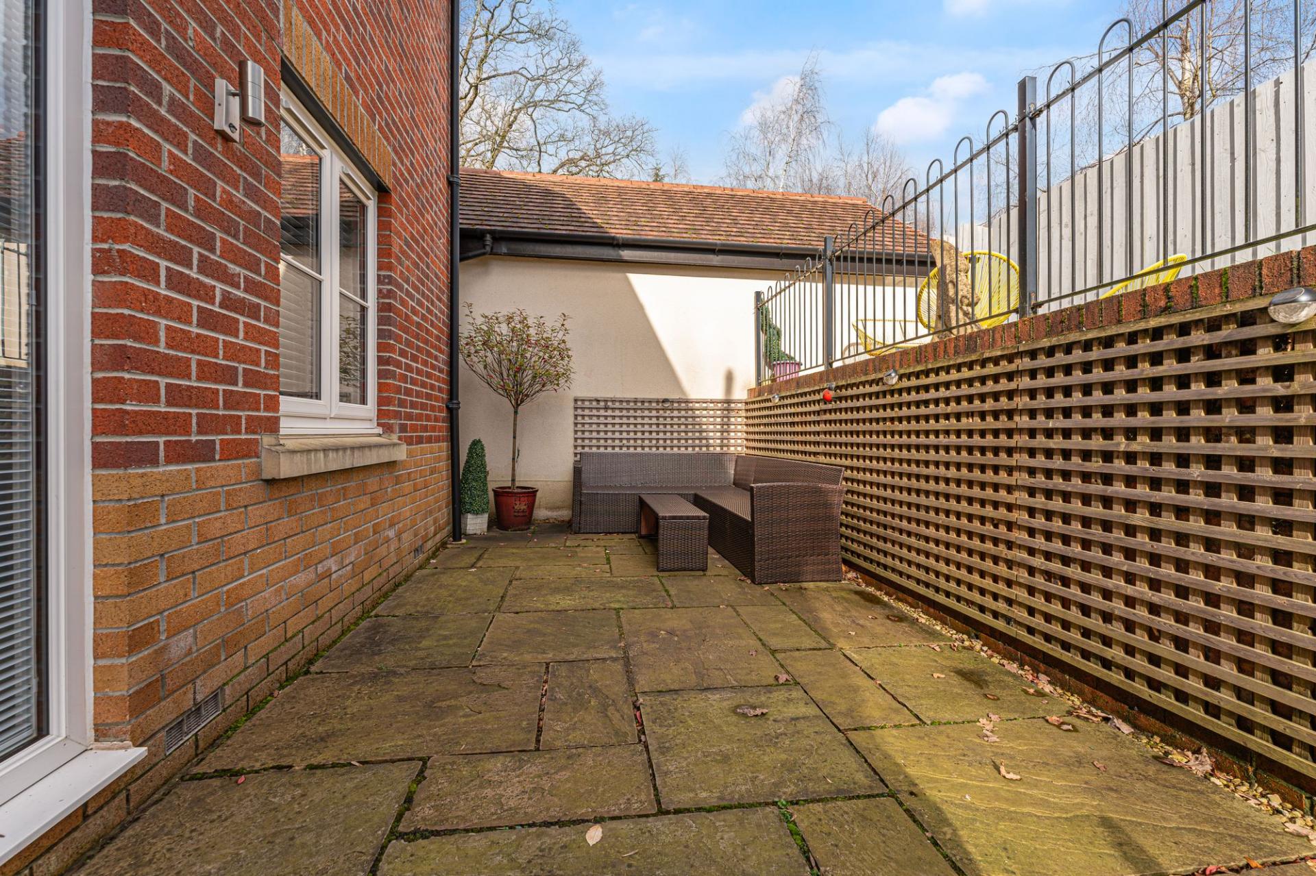 The property excels with its outdoor areas, with a two tiered garden offering abundance of outdoor space for residents to enjoy, with a large patio, spacious grass lawn and seating areas, all enclosed with privacy fencing. Further attractions include a beautiful mural decorating the far side of the garden, and a charming summerhouse equipped with power and lighting, creating a cosy lounge area with great potential for a home bar or games room. Additional highlights include a detached garage, which has is currently being used as home gym with a stud wall to allow a helpful storage area. Off-road parking is available thanks to a large driveway that can fit around 2-3 vehicles, while the communal green and mature trees to the front of the house provides a warm welcome on approach to this extravagant family home.