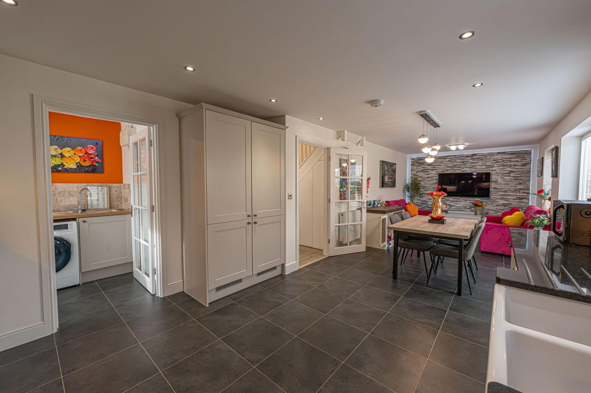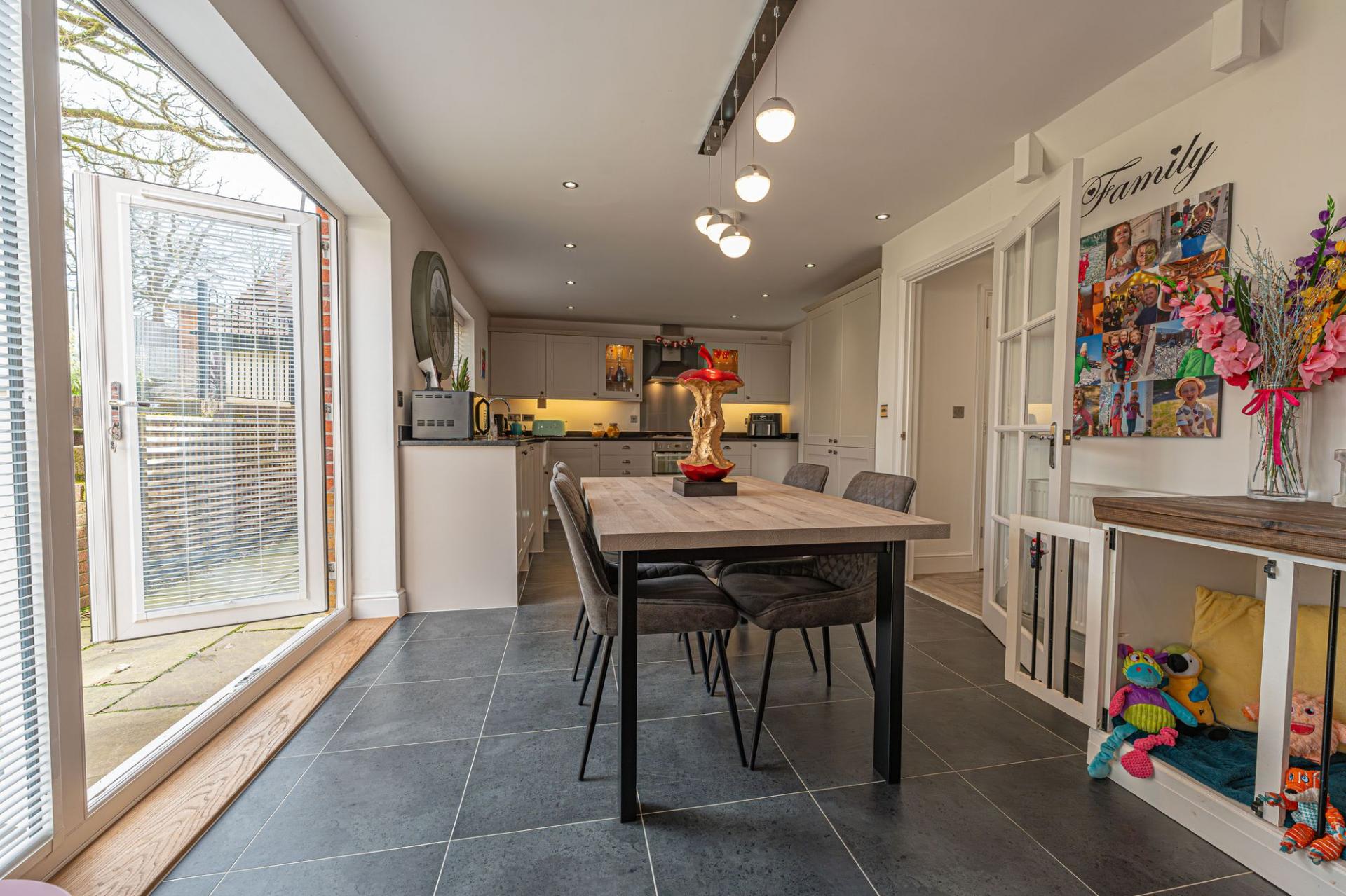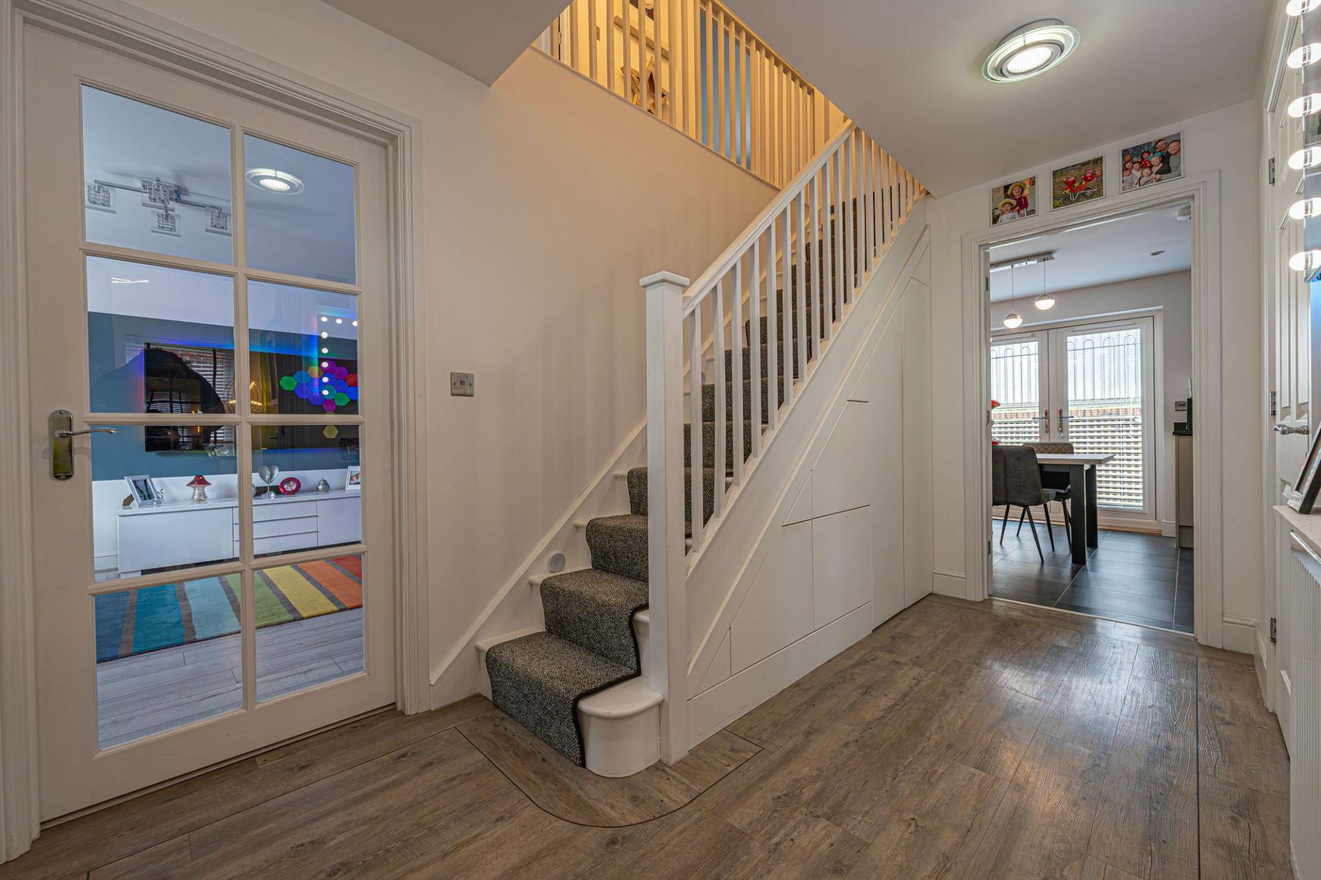 This impressive detached home offers a superb blend of modern style and generous living space, ideal for families and those who love to entertain. The property features three versatile reception rooms on the ground floor, one of which being a dedicated living room lit up by bay fronted windows, and another bright family room opposite, with a snug design that is perfectly suited as a home office. The third reception room is located at the rear of the house, with the impressive open plan kitchen offering enough space for both a dining room and a lounge space, with French doors to the garden providing a flood of natural light, creating an ideal setting for relaxing, dining, and entertaining guests. The stylish modern kitchen is well equipped with a range of storage options and integrated appliances, and includes a Belfast sink and a fabulous utility room adjacent. Further storage is available with push-to-open cupboards fitted into the staircase, with the hallway also featuring a helpful W.C.