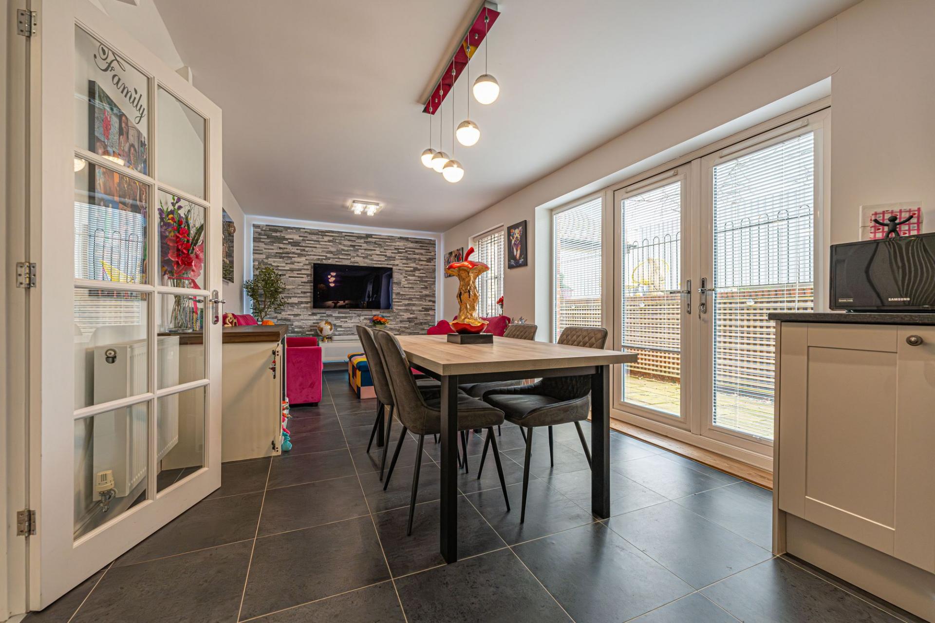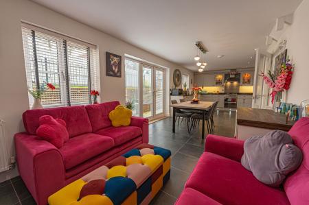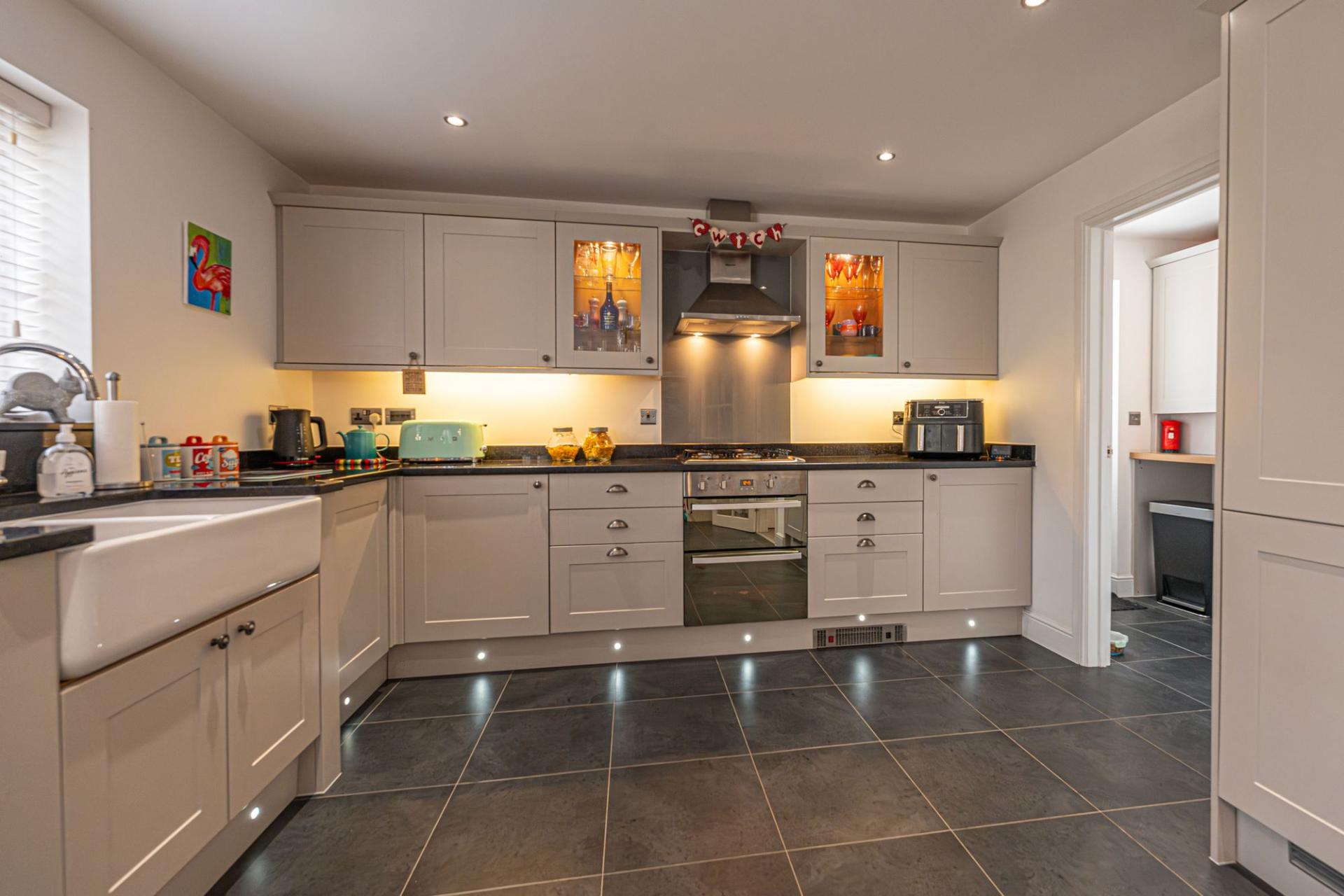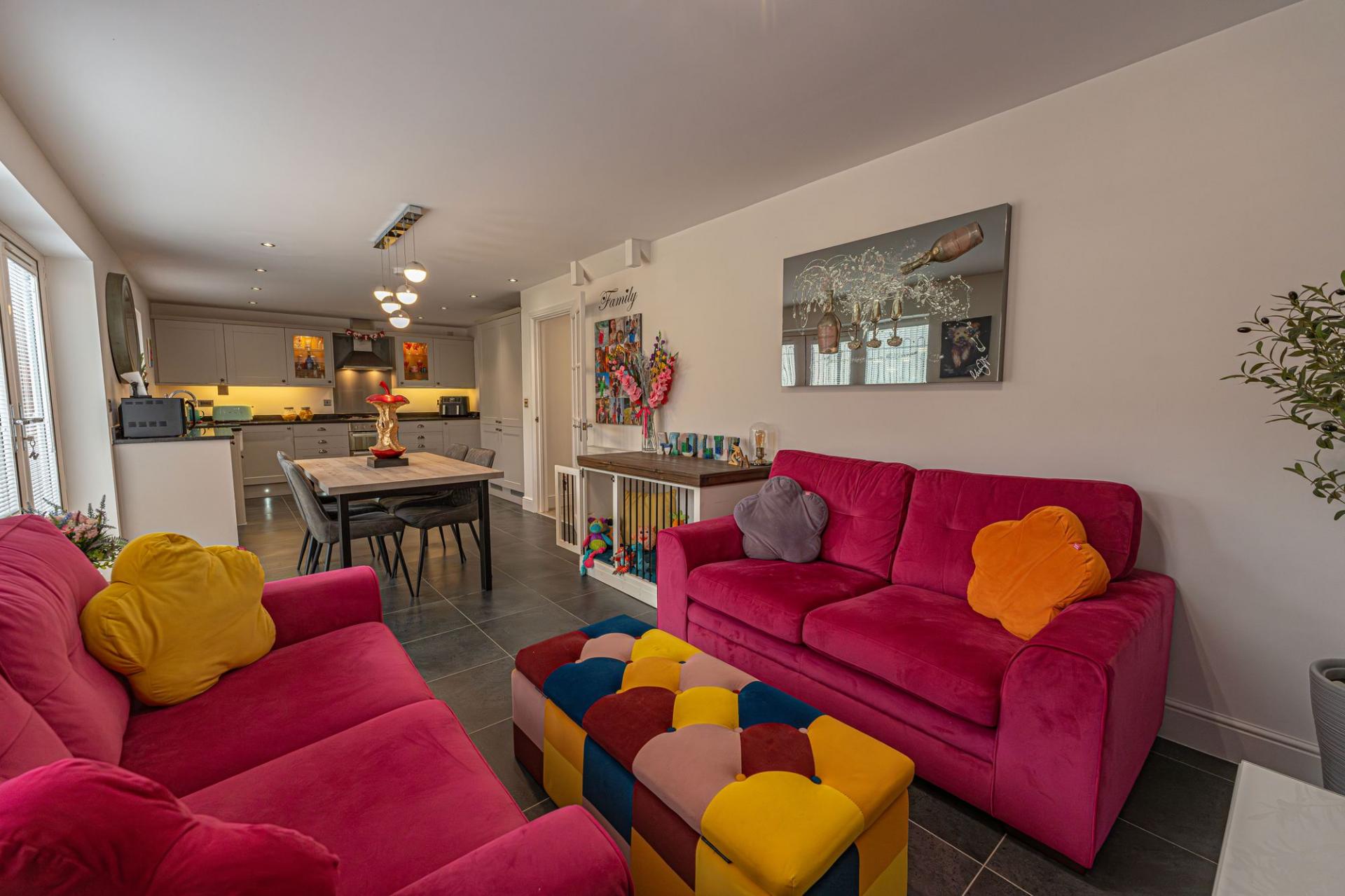 This impressive detached home offers a superb blend of modern style and generous living space, ideal for families and those who love to entertain. The property features three versatile reception rooms on the ground floor, one of which being a dedicated living room lit up by bay fronted windows, and another bright family room opposite, with a snug design that is perfectly suited as a home office. The third reception room is located at the rear of the house, with the impressive open plan kitchen offering enough space for both a dining room and a lounge space, with French doors to the garden providing a flood of natural light, creating an ideal setting for relaxing, dining, and entertaining guests. The stylish modern kitchen is well equipped with a range of storage options and integrated appliances, and includes a Belfast sink and a fabulous utility room adjacent. Further storage is available with push-to-open cupboards fitted into the staircase, with the hallway also featuring a helpful W.C.