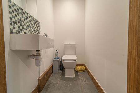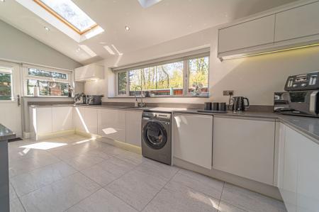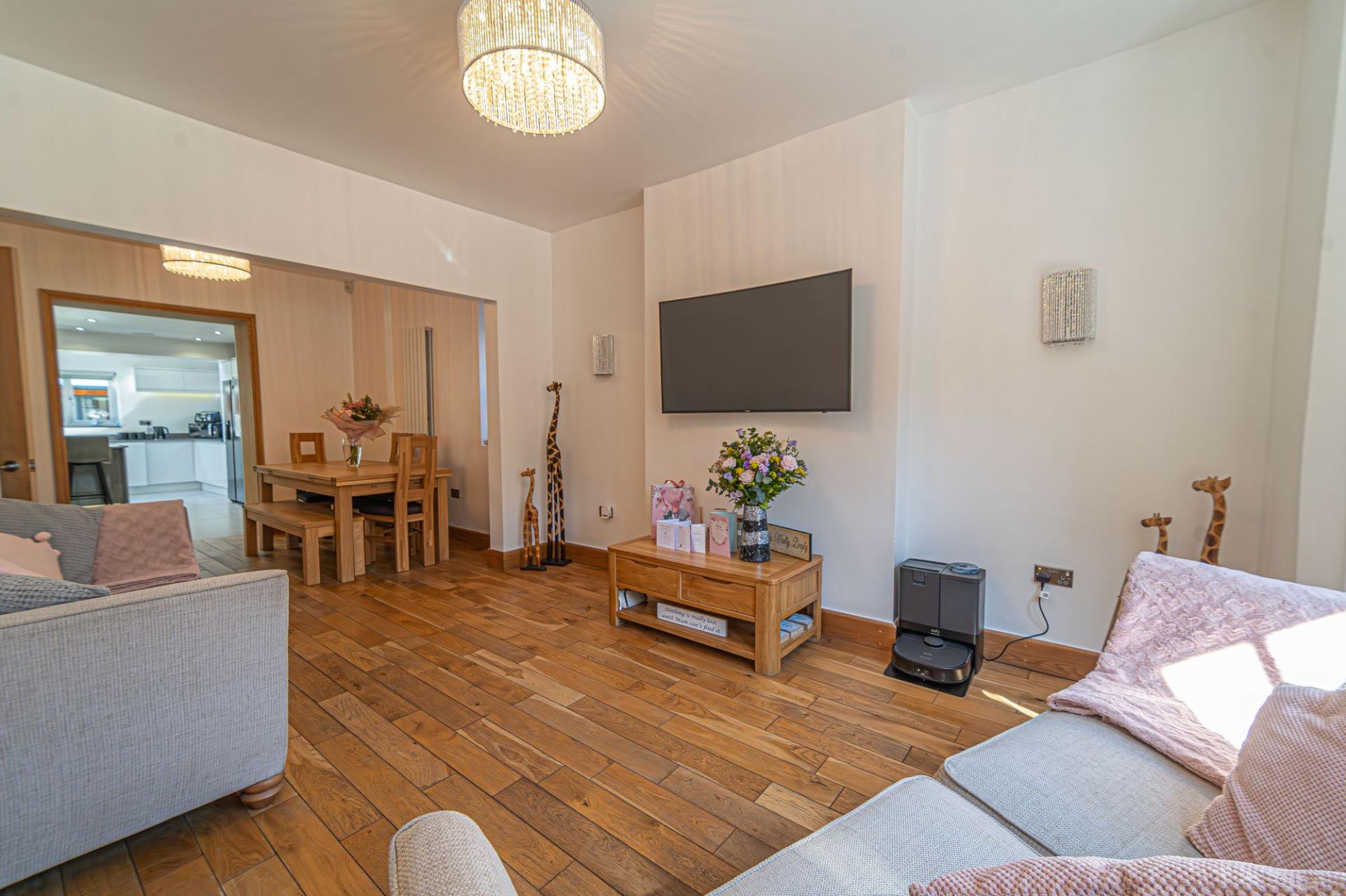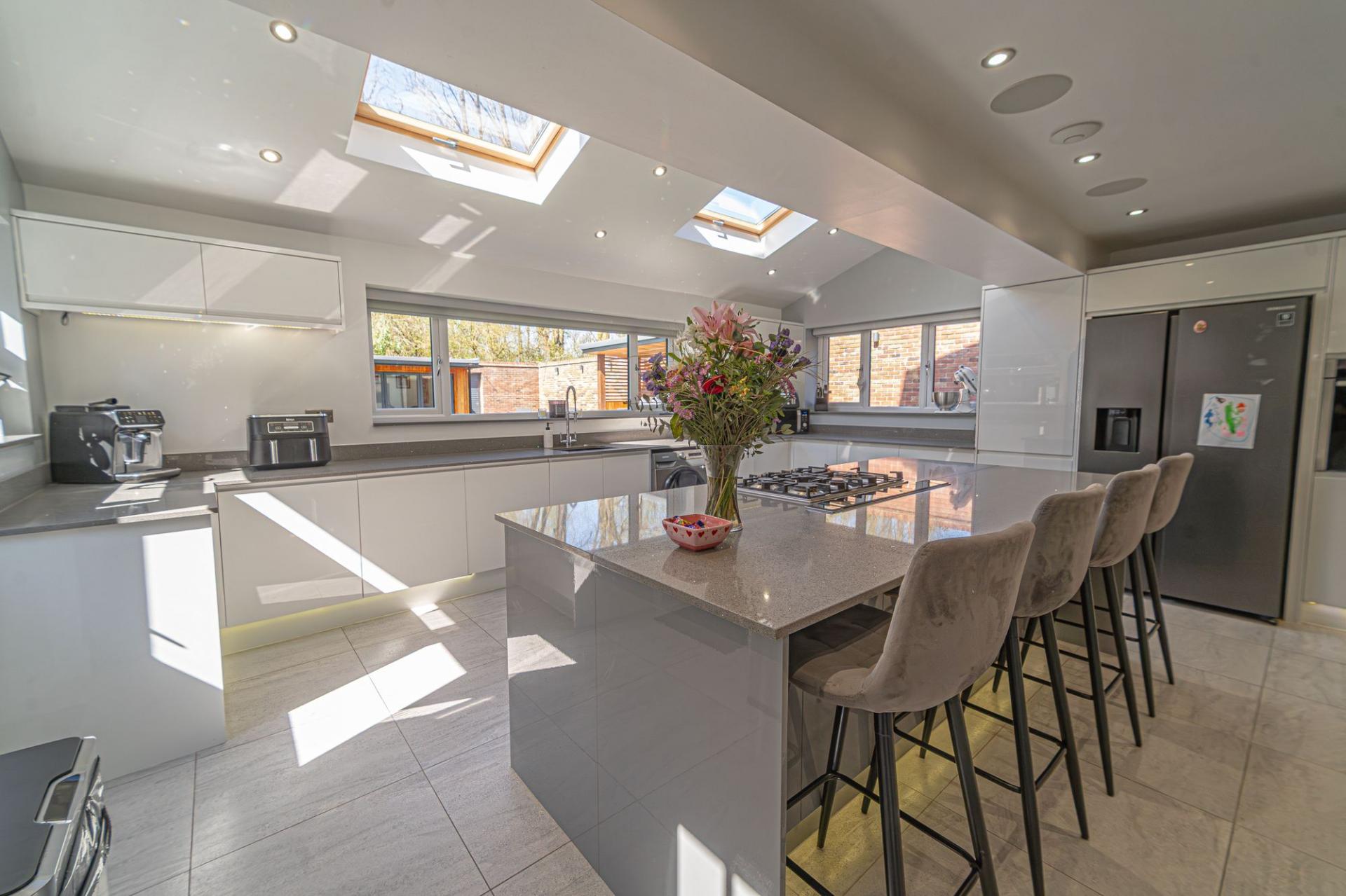 We enter this fantastic family home through the front, where we can find an entrance hall with access to a useful cloakroom, with a gorgeous hardwood flooring that continues throughout much of the ground level. To the left of the property we have the impressively sized living room, which offers the ability to suit various furniture layouts and entertain a large host of guests, thanks to its abundant size. The room is also bathed in natural light flowing in from multiple directions, with bay windows positioned to the front of the house, and magnificent bi-fold doors at the rear, which can effortlessly open out to the beautiful rear garden. On the other side of the house we have another spacious reception room, with another set of bay windows to brighten up the space, which is currently doubled up as both the dining room and a secondary lounge area, highlighting the wealth of potential living space found throughout this home. This reception room folds through the fabulous kitchen at the rear of the house, which is lit up by numerous windows including overhead spotlights, Velux windows, and undercounter LEDs. The kitchen as a whole is incredibly well equipped, with plentiful counter space and ample storage options found in the various wall and base units, including in the kitchen island, which features a charming breakfast bar for a casual dining option. The kitchen also features several integrated appliances, with a 5-ring gas hob with built in extractor, double oven, fridge freezer, dishwasher, tumble dryer and a sink with a waste disposal function. The kitchen also features a useful W.C, As well as underfloor heating to ensure warmth during the chilly winter months. Another quality of life feature found around the property is wired ethernet connecting to every room, and electric blinds that can be controlled remotely - additionally, there are fitted Sonos speakers in the kitchen and living room, which connect via Bluetooth to enhance relaxing afternoons and family events.