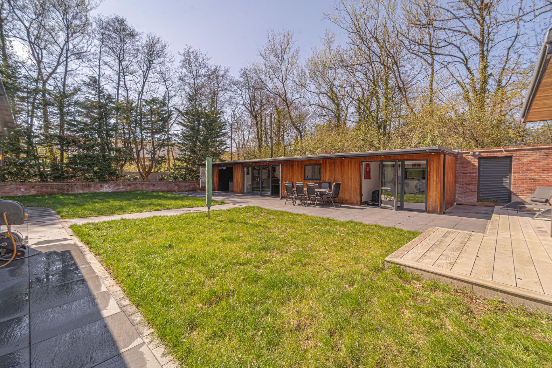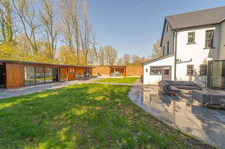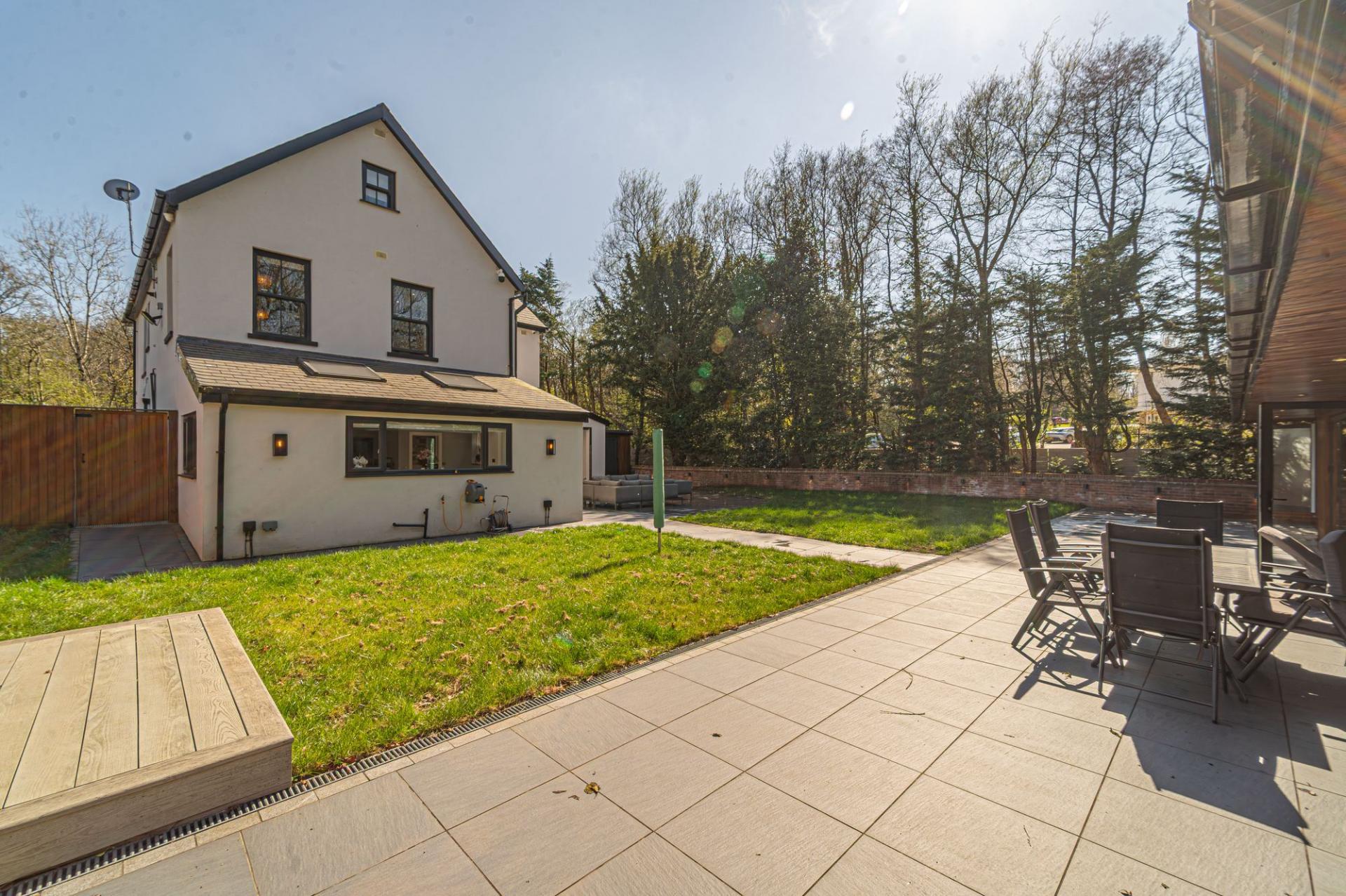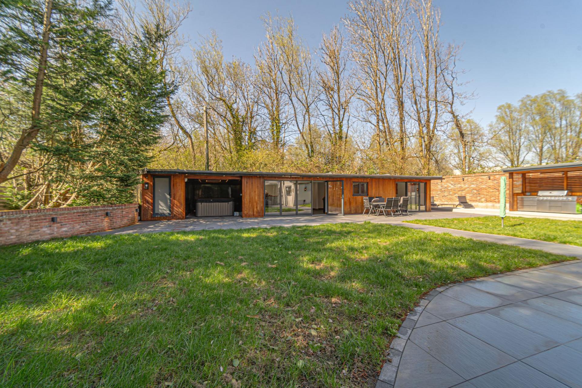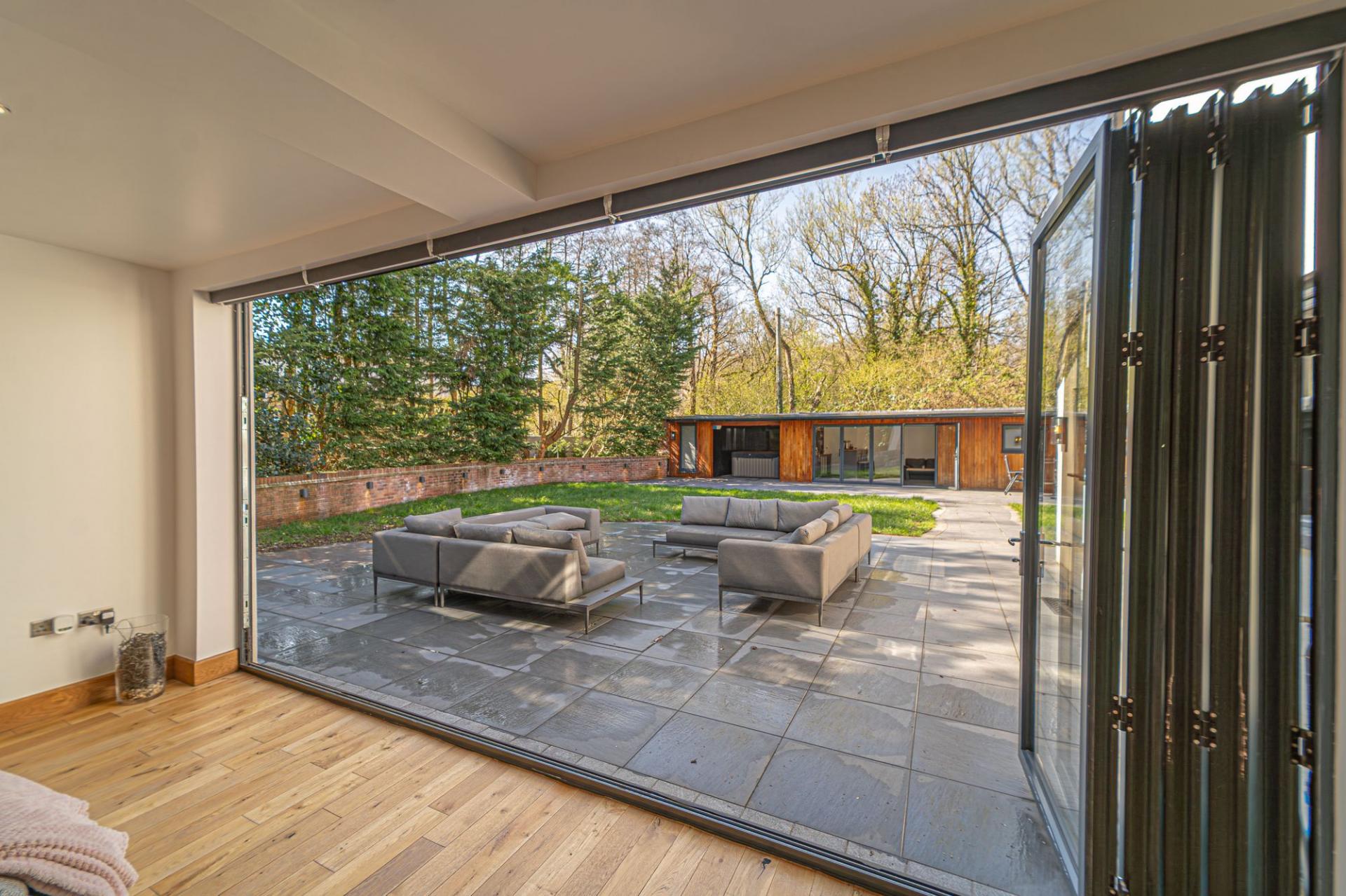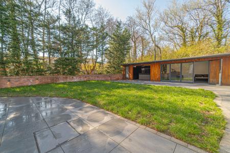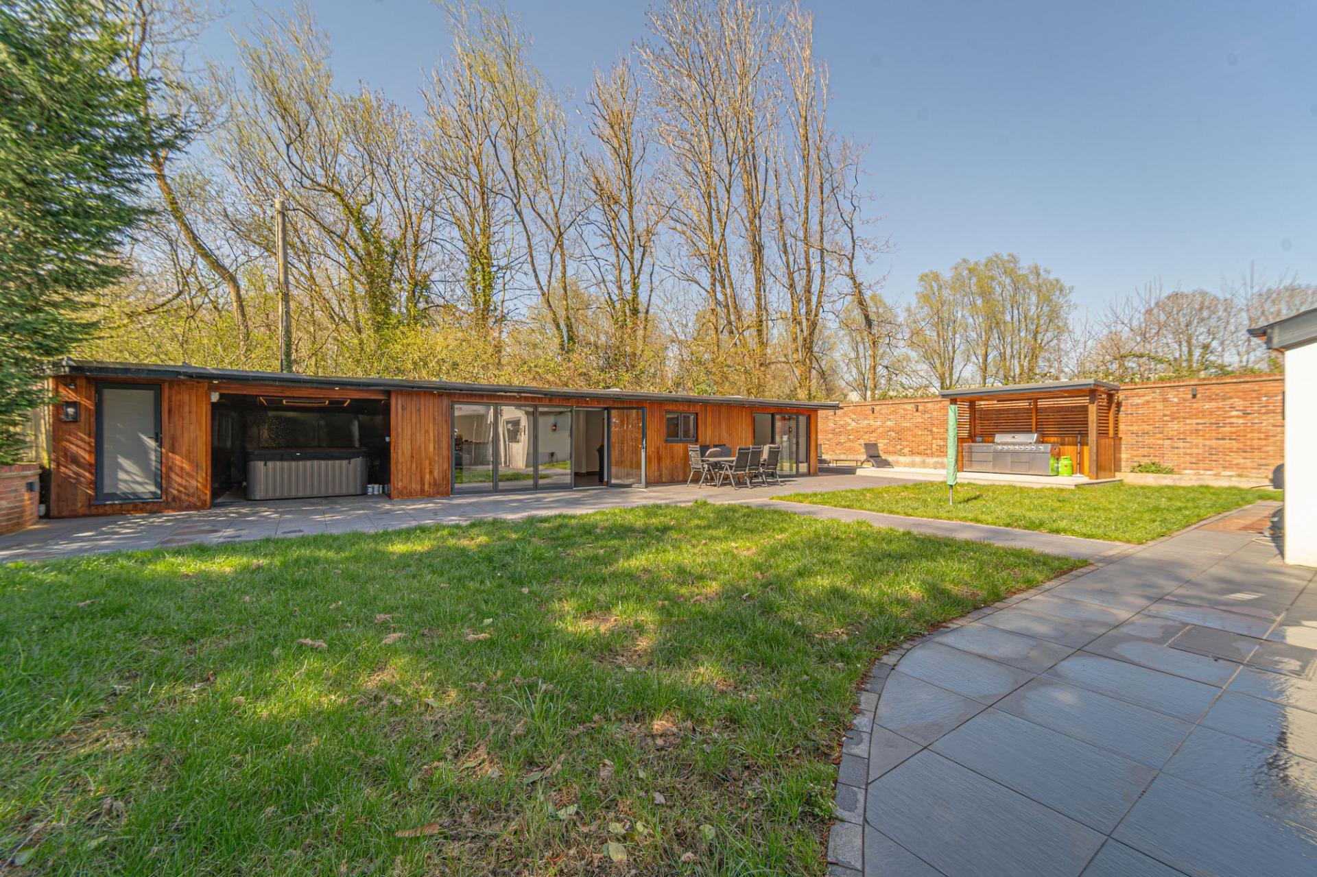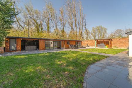 Stepping outside we arrive at the beautiful rear garden, which is fully enclosed and expansive in size, while being surrounded by a lake on one side, and an excess of tall trees to prevent the property from being overlooked, offering complete privacy for residents. From the house there is a large patio that extends to meet an impressively sized lawn, with a further patio space beyond, and a decking home to a marvellous outdoor kitchen, perfect for summer parties and barbeques. We can also find a useful storage shed in the garden, while a true highlight of this property can be found in the former garage, which has been meticulously converted into a fantastic annexe. This gorgeous conversion has been wired with electrics, WiFi and underfloor heating to provide the facilities for this superb space to be used for a multitude of different functions. Currently, this stunning summerhouse is staged as an entertainment room, with a well equipped home bar and another set of bi-fold windows that opens out to the garden, sure to provide a great deal of entertainment for visiting guests. The room also features a W.C, and more than enough space to be used as a separate bedroom or office space, providing yet another degree of versatility to this extensive family home. Additionally, the annexe features plenty of other living space, with another set of bi-fold doors opening in to a home gym, as well as a shower room, a sauna, and a sheltered section currently home to the jacuzzi, which is available for negotiation. The sheer size of the garden, reinforced with the exuberant annexe - allows this outdoor haven to be used for any purpose, whether you prefer hosting fabulous gatherings in the sunshine or simply basking in the beauty of this outstanding garden retreat, any occasion is perfect.
