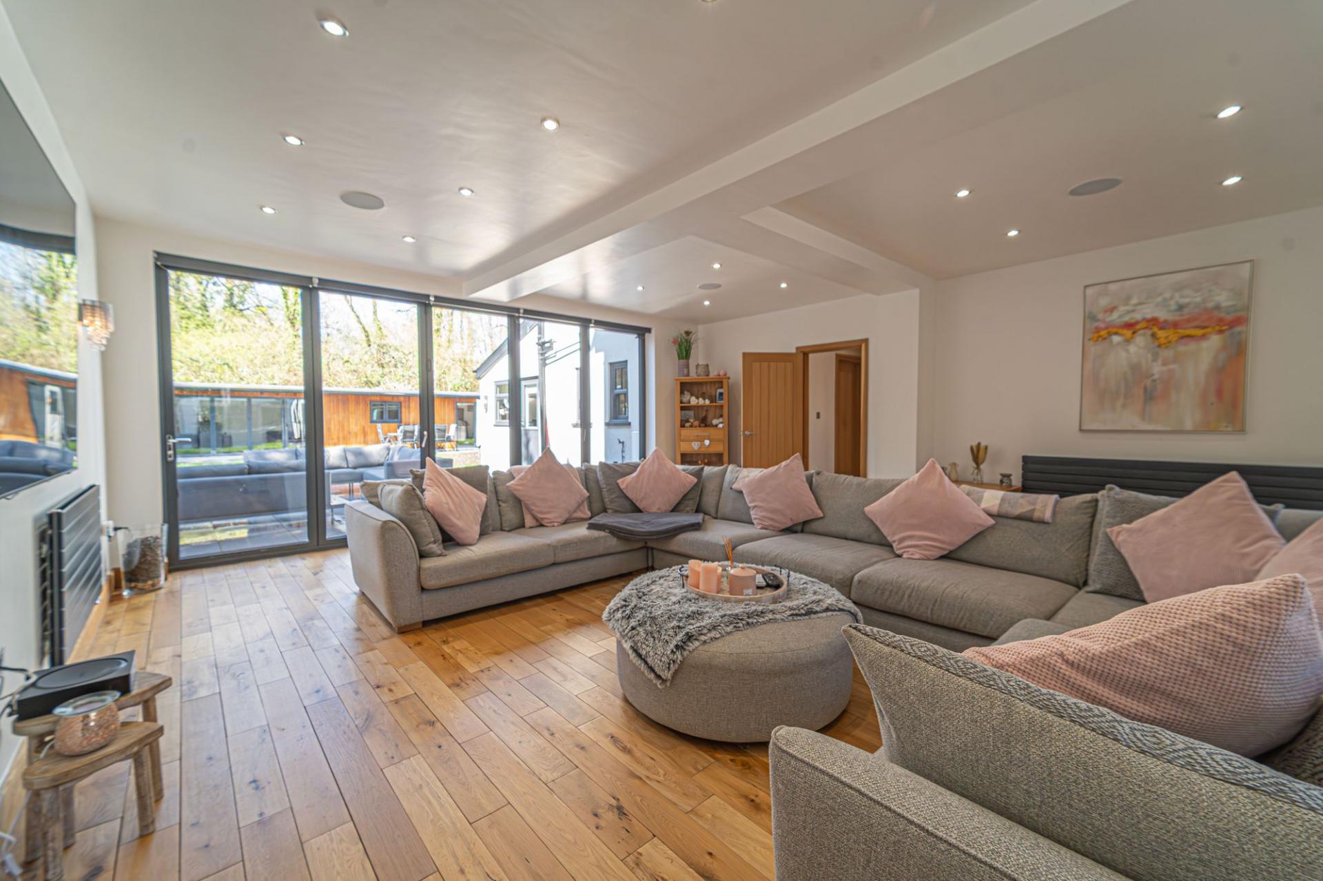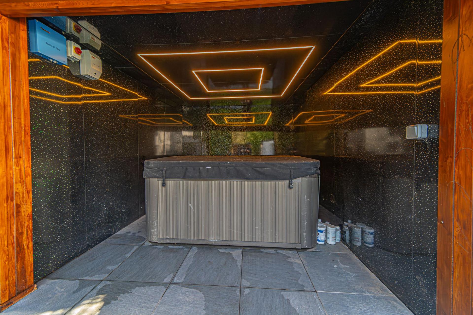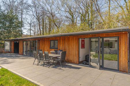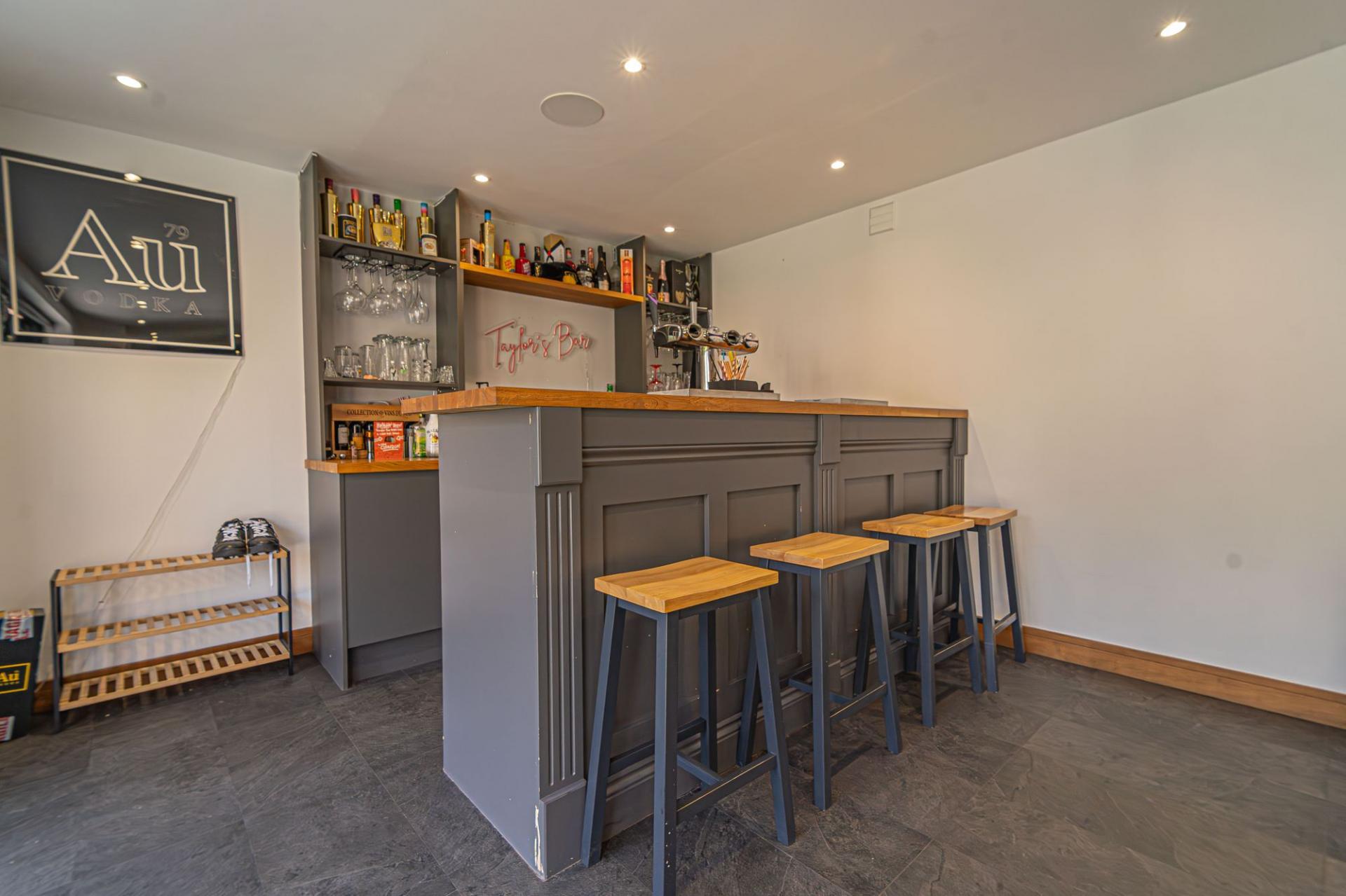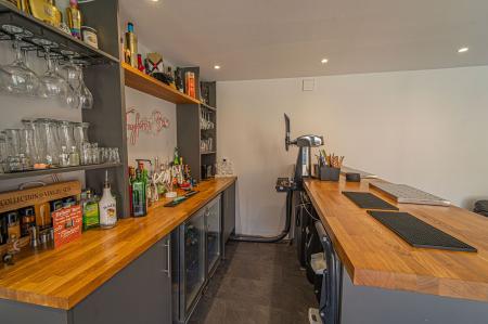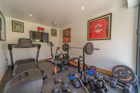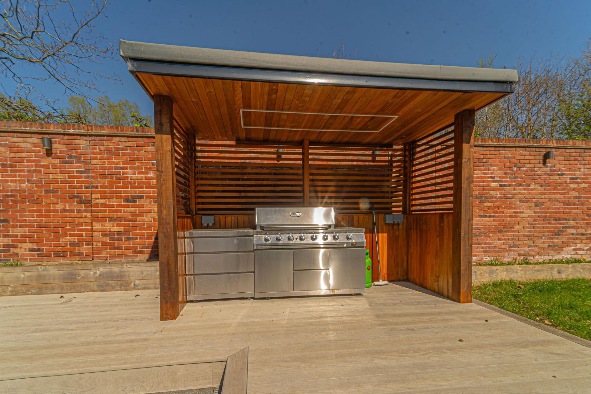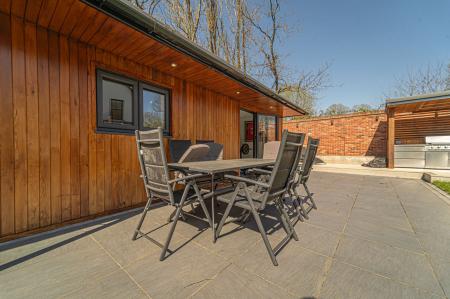 Stepping outside we arrive at the beautiful rear garden, which is fully enclosed and expansive in size, while being surrounded by a lake on one side, and an excess of tall trees to prevent the property from being overlooked, offering complete privacy for residents. From the house there is a large patio that extends to meet an impressively sized lawn, with a further patio space beyond, and a decking home to a marvellous outdoor kitchen, perfect for summer parties and barbeques. We can also find a useful storage shed in the garden, while a true highlight of this property can be found in the former garage, which has been meticulously converted into a fantastic annexe. This gorgeous conversion has been wired with electrics, WiFi and underfloor heating to provide the facilities for this superb space to be used for a multitude of different functions. Currently, this stunning summerhouse is staged as an entertainment room, with a well equipped home bar and another set of bi-fold windows that opens out to the garden, sure to provide a great deal of entertainment for visiting guests. The room also features a W.C, and more than enough space to be used as a separate bedroom or office space, providing yet another degree of versatility to this extensive family home. Additionally, the annexe features plenty of other living space, with another set of bi-fold doors opening in to a home gym, as well as a shower room, a sauna, and a sheltered section currently home to the jacuzzi, which is available for negotiation. The sheer size of the garden, reinforced with the exuberant annexe - allows this outdoor haven to be used for any purpose, whether you prefer hosting fabulous gatherings in the sunshine or simply basking in the beauty of this outstanding garden retreat, any occasion is perfect.
