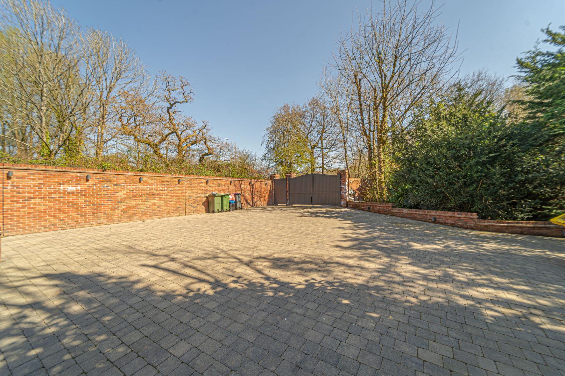 To the front of the house there is an extensive driveway, which is also fully enclosed and protected by a remote controlled gate that opens out to the street. The driveway has an estimated capacity of around 10 vehicles, and features several lights to illuminate the space in the dark, while several CCTV cameras are also positioned surrounding the exterior of the property for an added measure of security, providing peace of mind to future residents.
