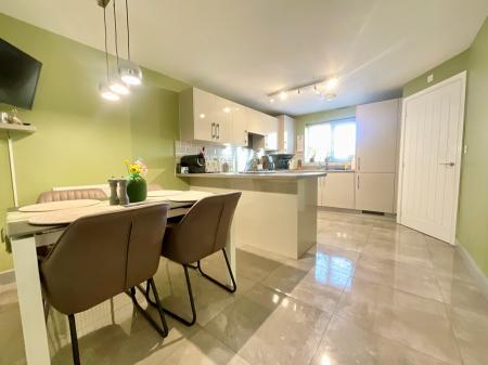 The entrance hall features stairs to the first floor, storage cupboard and access to the good sized kitchen/diner with ample storage units and integrated appliances. A breakfast bar zones the dining area with space for table & chairs with cloakroom w/c off. Spanning the rear is the lounge with feature fireplace and French doors to the rear garden.