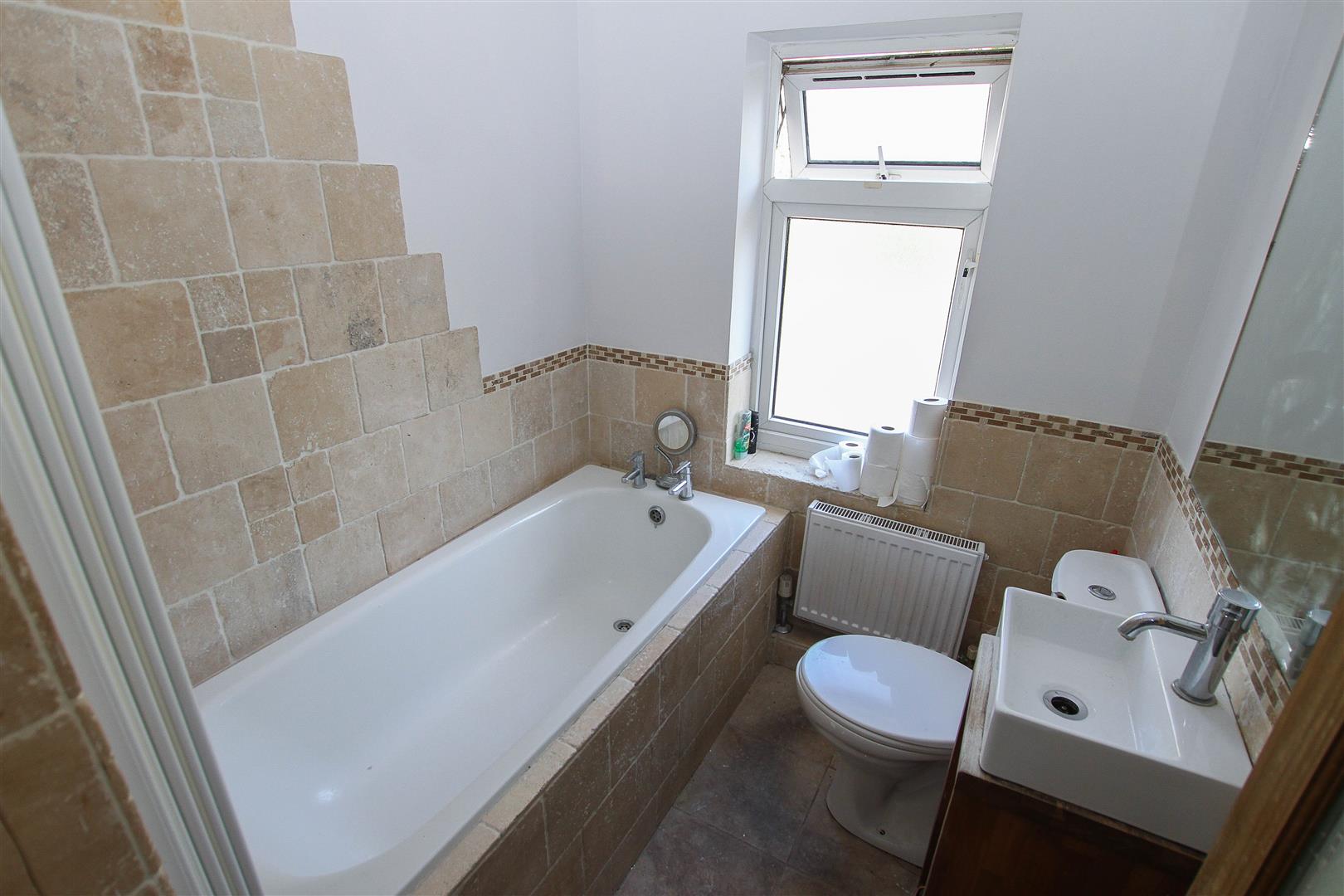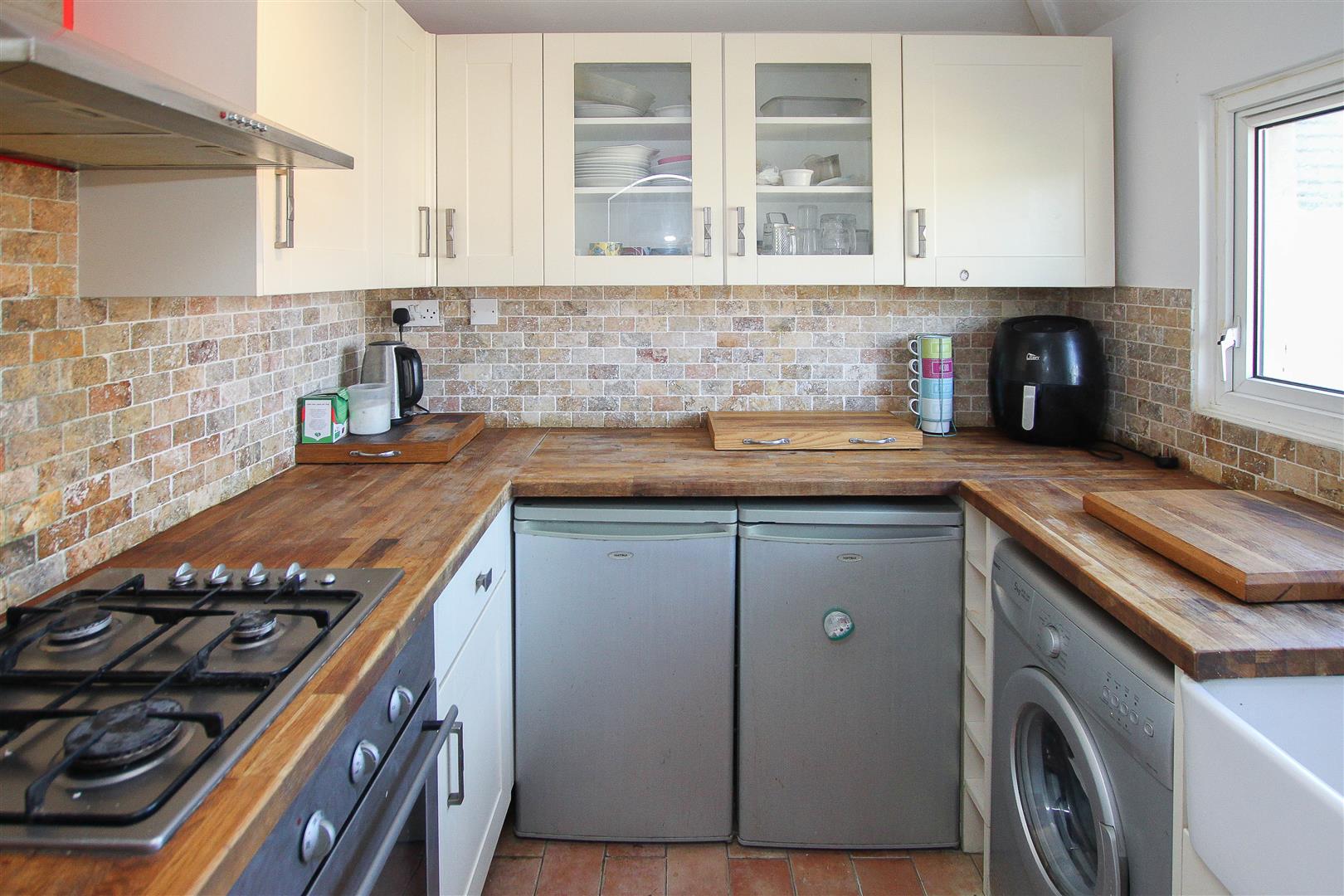 Kitchen - 2.34m x 2.24m (7'8 x 7'4) - Window to side aspect. Modern 'Shaker' style wall and base units with contrasting wooden work surface over. Integrated oven and four-ring gas hob with extractor above. Space for freestanding appliances. Butler sink.