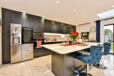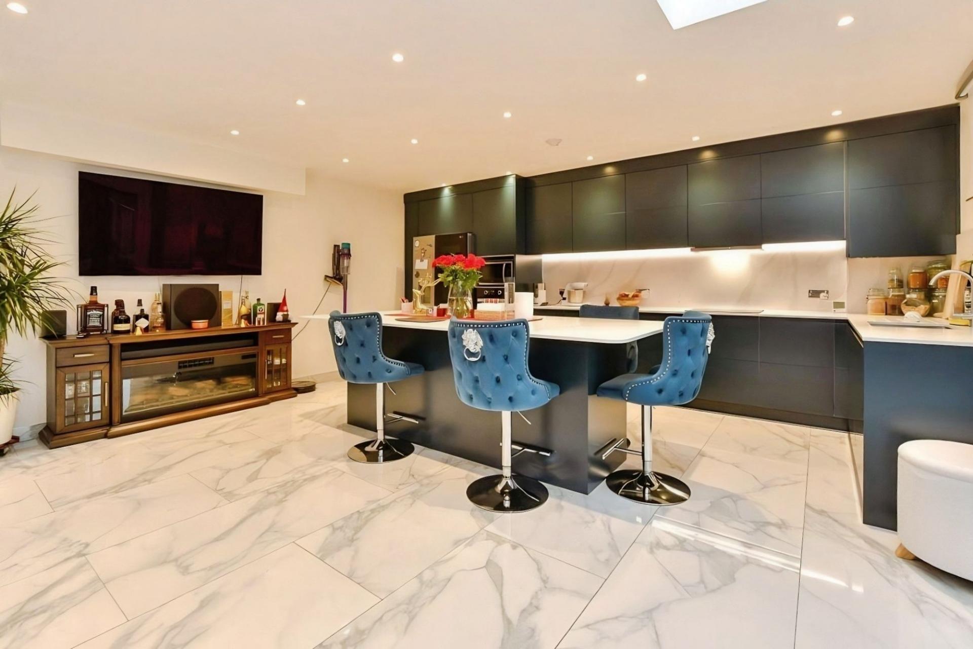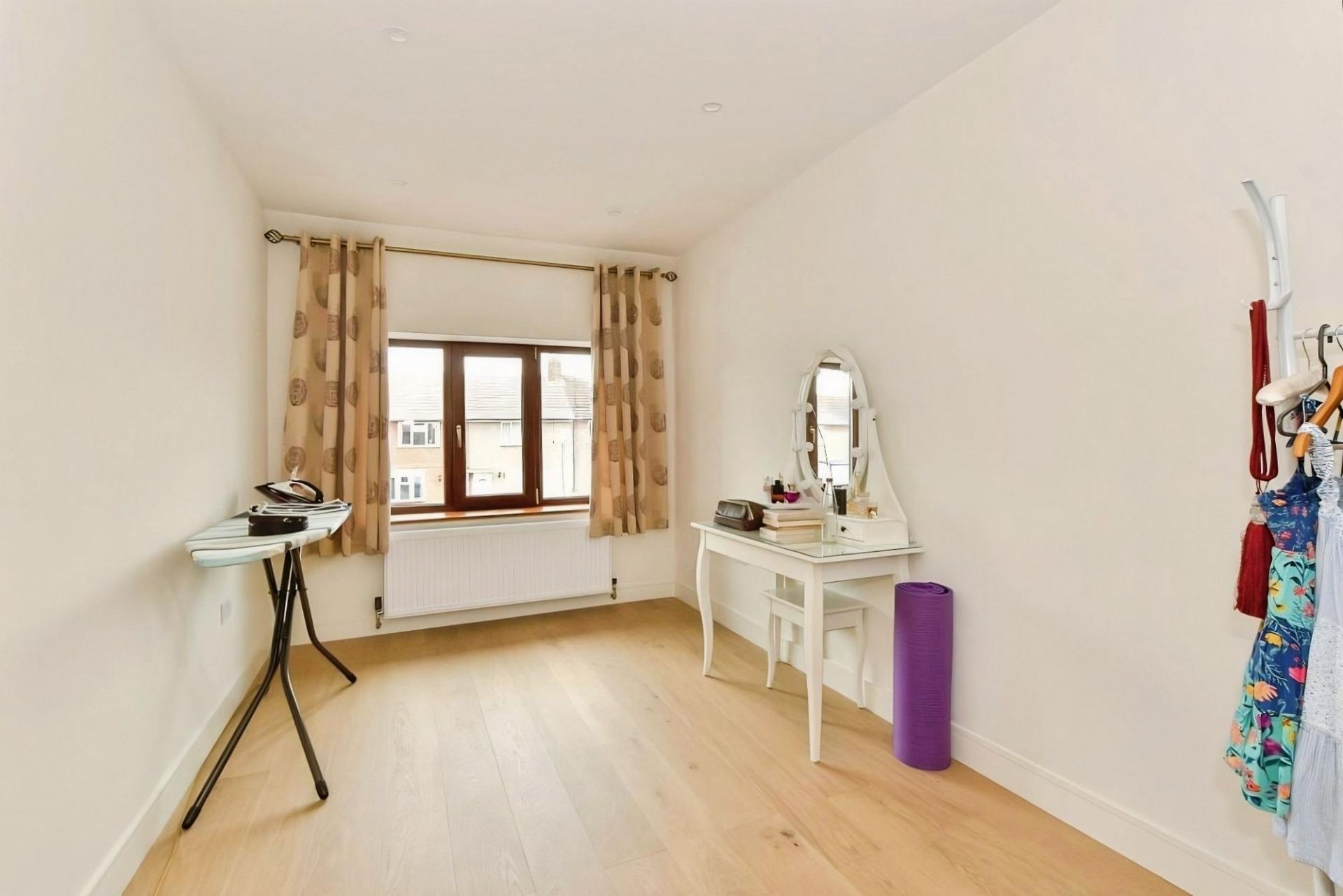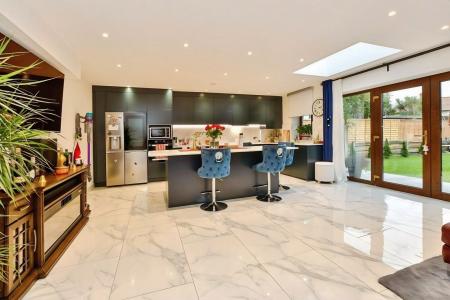 This extended five-bedroom end of terrace house is for sale in Dagenham, offering flexible accommodation over three floors. The property includes an open-plan kitchen with a kitchen island, good natural light and direct access to a private garden. There are three bathrooms in total: a ground floor bathroom combined with a utility area, a first floor bathroom and a further bathroom on the second floor, where the fifth bedroom is located. Additional features include an integral garage and off-street parking for one car.