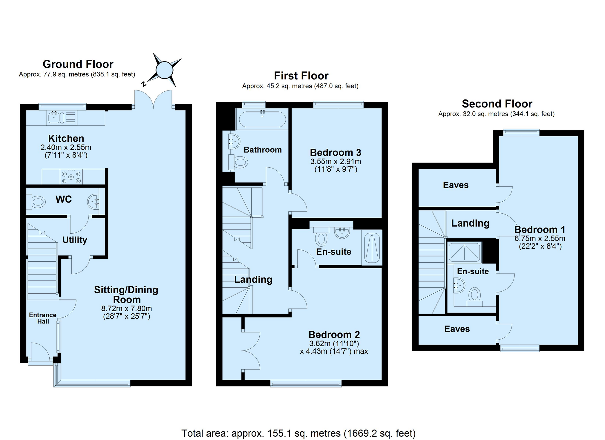 On the ground floor is a good sized open plan living area with a sitting room to the front leading to the dining area with double doors out to the rear courtyard, a well fitted kitchen and a utility/w.c. On the first floor there is a guest bedroom a family bathroom and an en suite bedroom. There is a further en suite bedroom on the second floor with a useful under eaves storage.