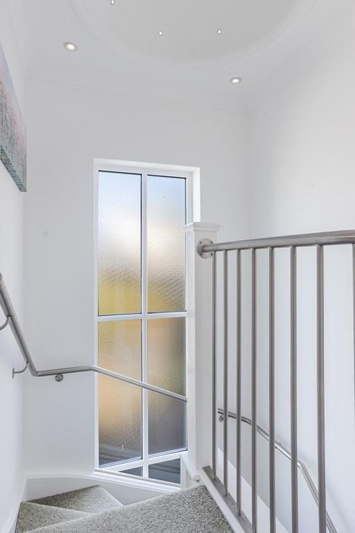 - Light sitting room with large picture windows and inset living flame fire